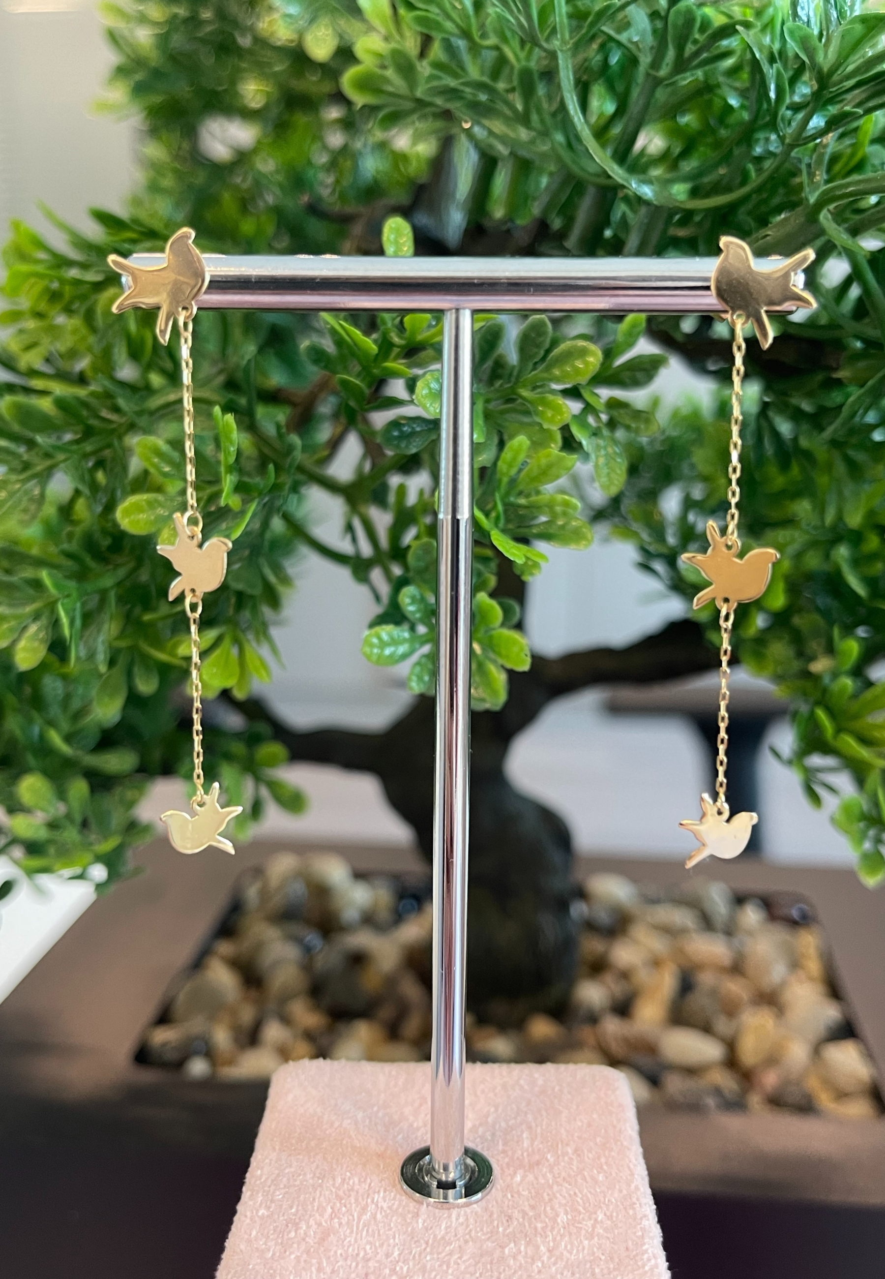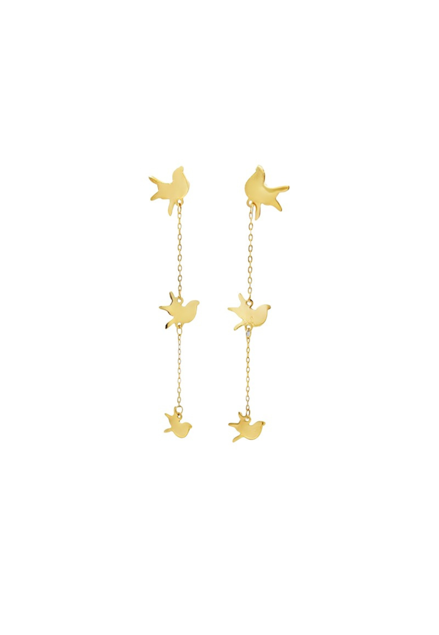 The 18KT Gold Birds Dangling Earrings feature graceful bird motifs that elegantly dangle, crafted from luxurious 18KTold. These charming earrings symbolize freedom and beauty, adding a unique touch to any look.
