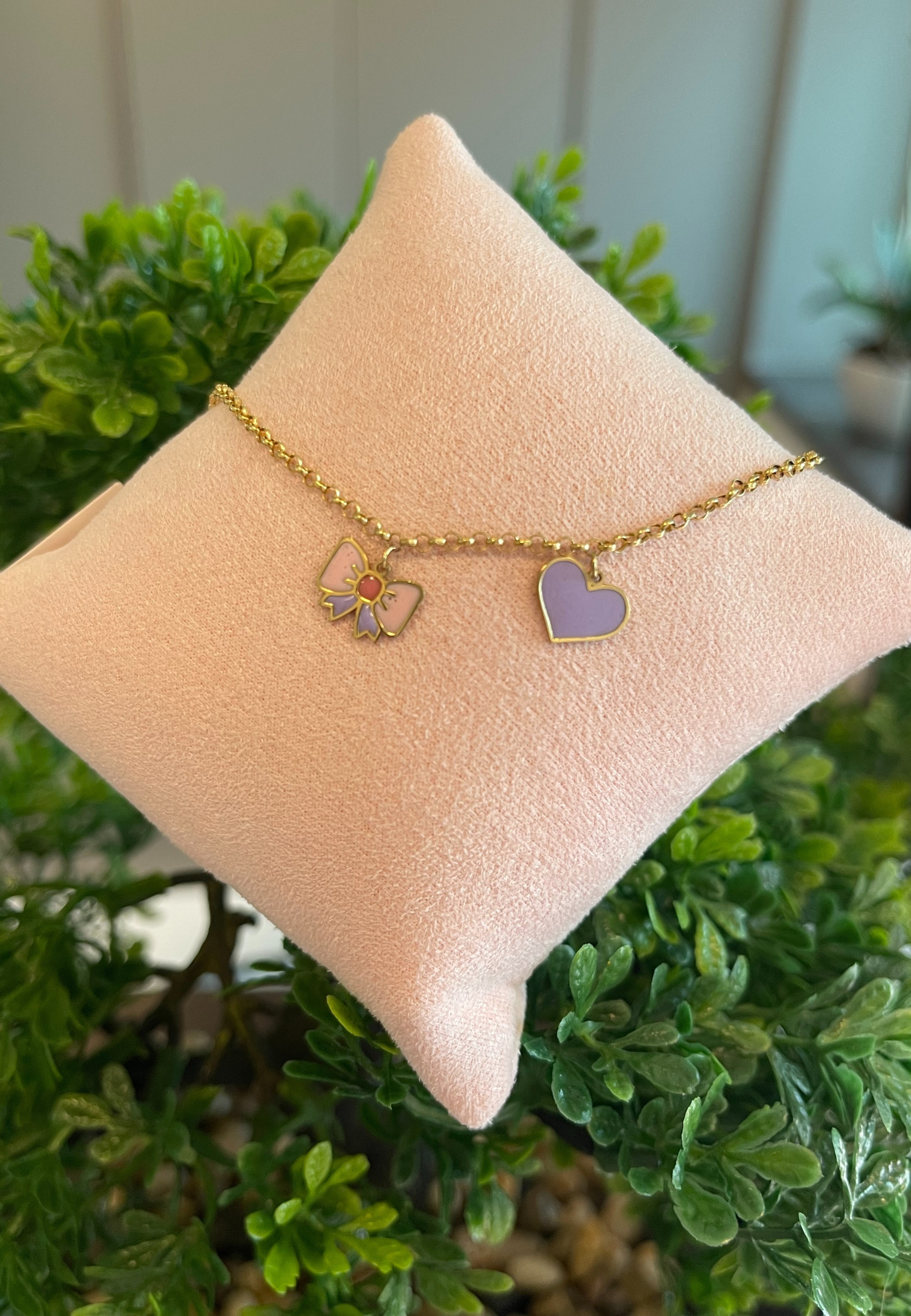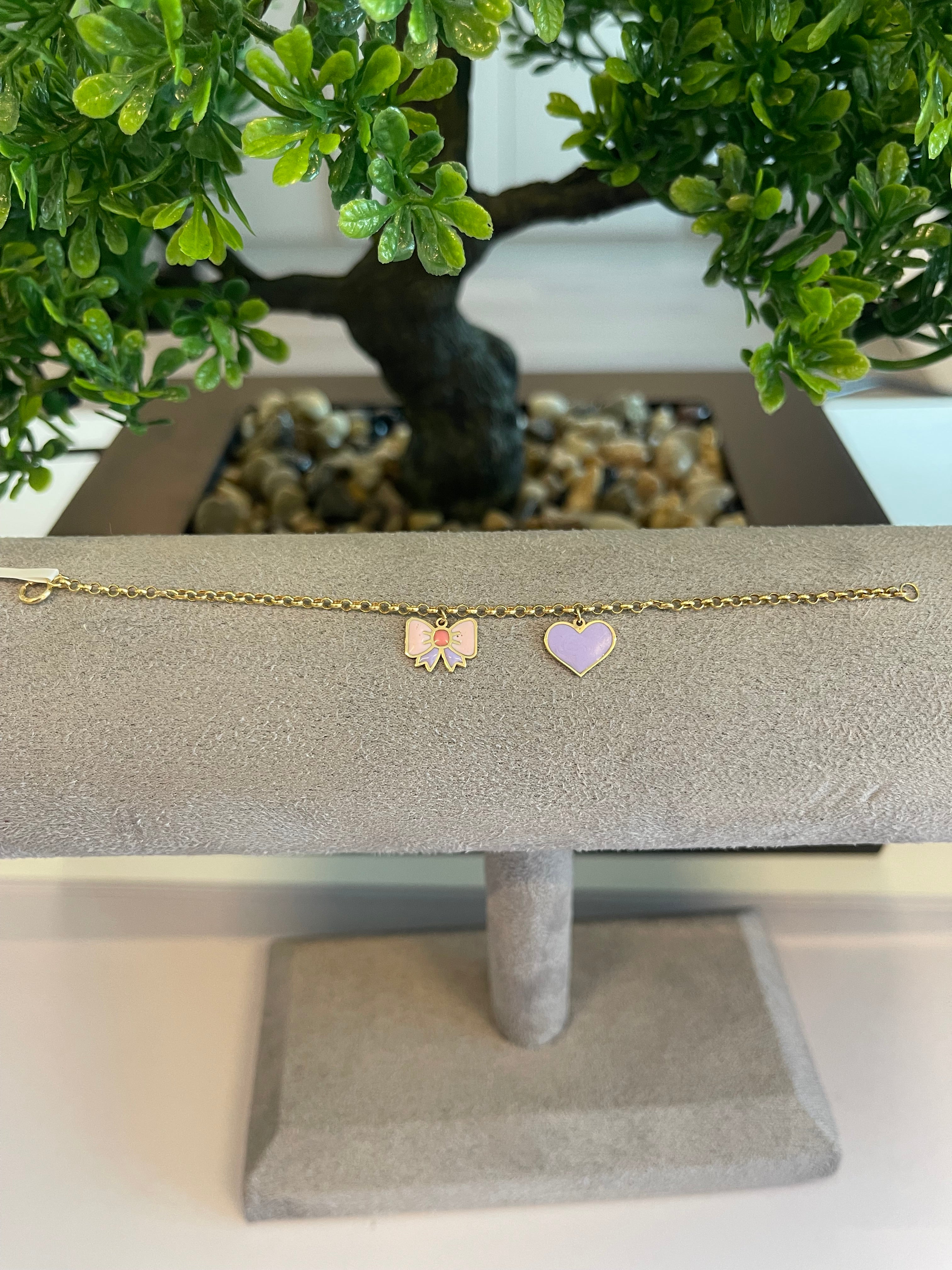 This elegant gold bracelet features two adorable charms: a pink bow and a purple heart. Crafted for both style and sophistication, it's perfect for adding a playful touch to any outfit.