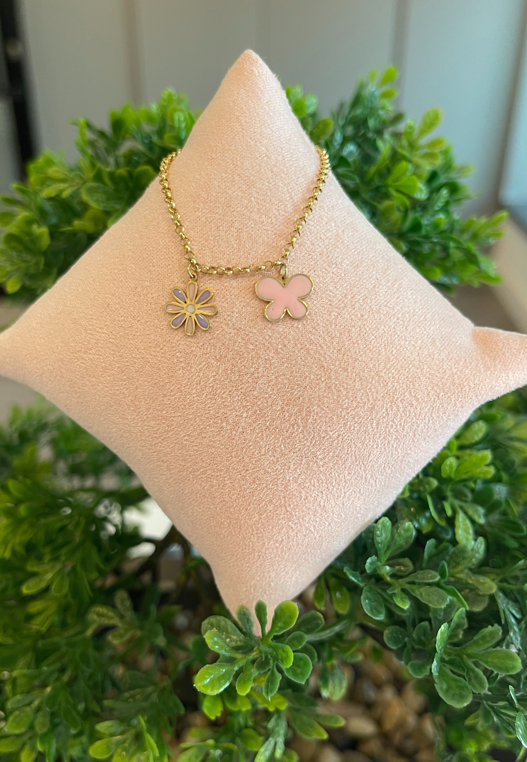 This elegant gold bracelet features two adorable charms: a pink bow and a purple heart. Crafted for both style and sophistication, it's perfect for adding a playful touch to any outfit.