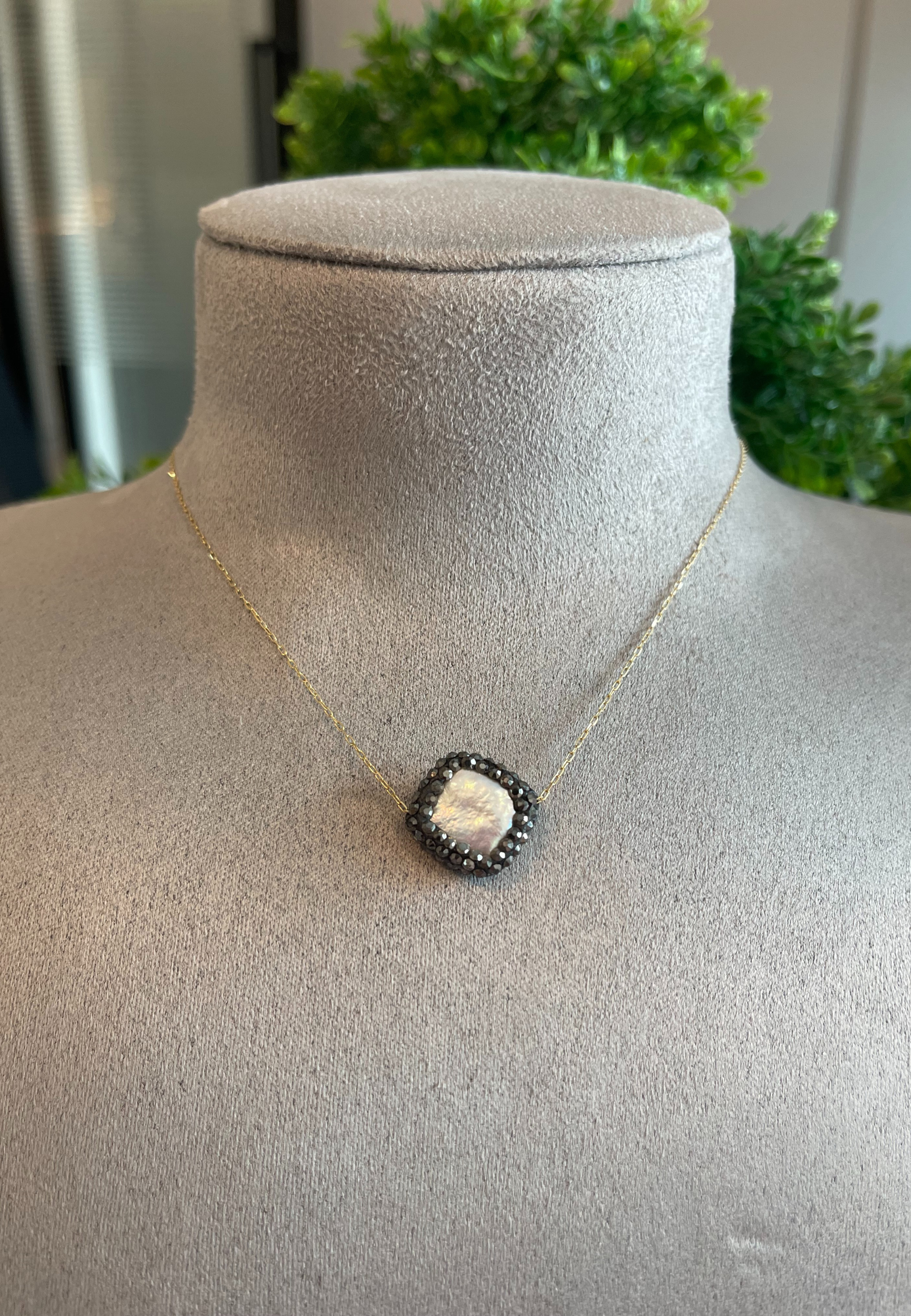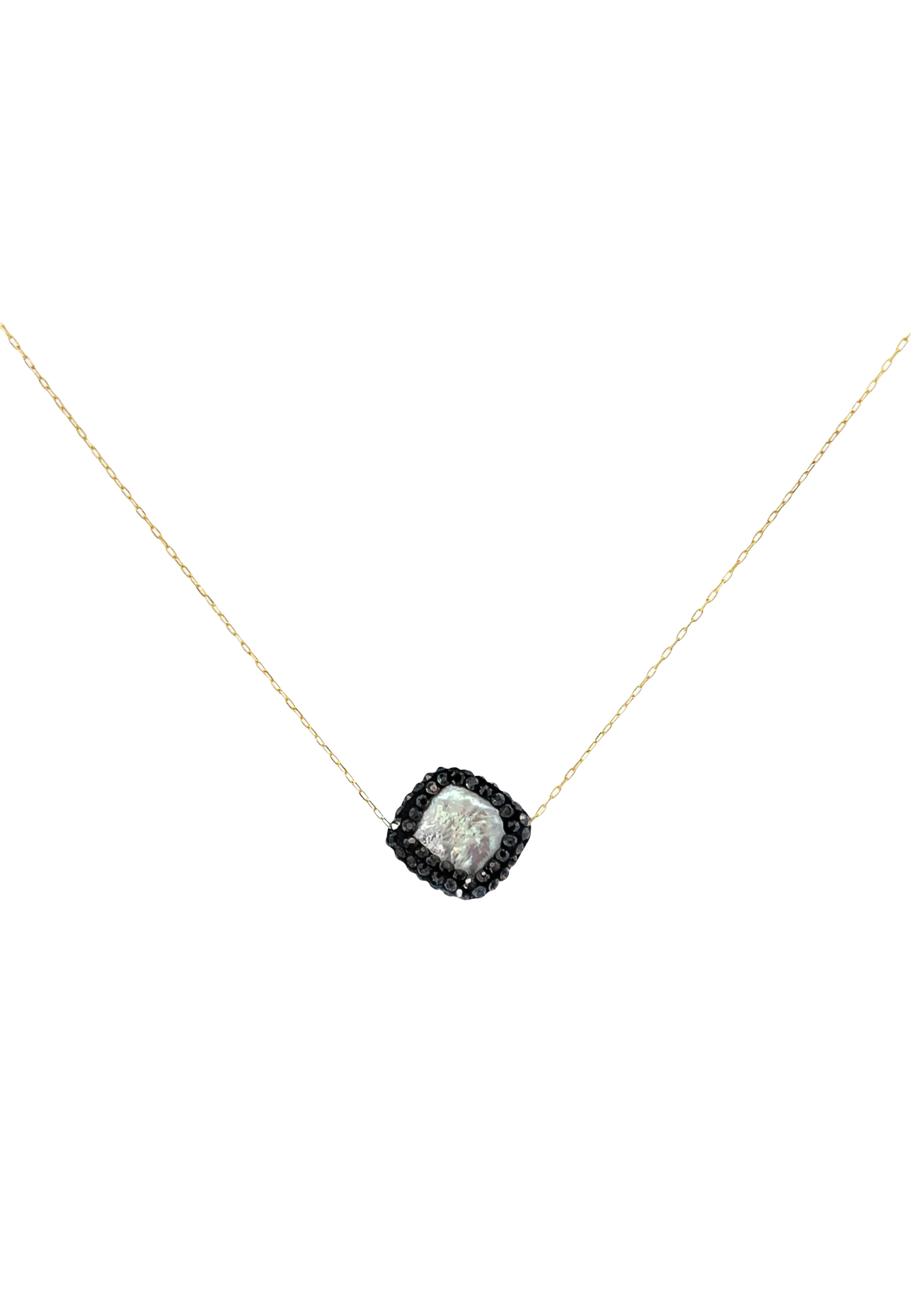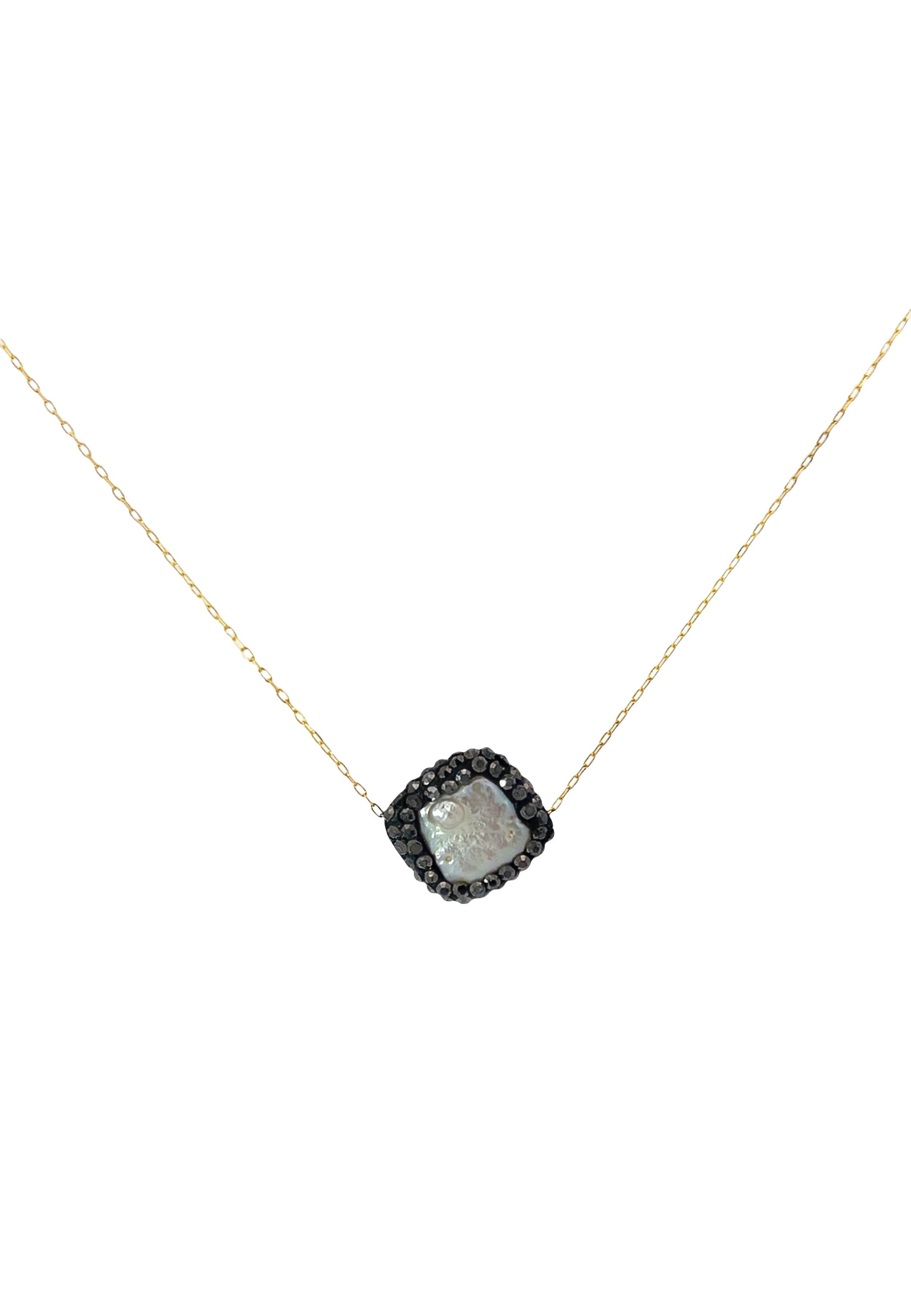 Elevate your style with our exquisite 18KT Gold Necklace, adorned with striking black zircons that elegantly frame a central square-shaped pearl. This Necklace embodies both opulence and refinement, making it a must have accessory for the modern trendsetter.