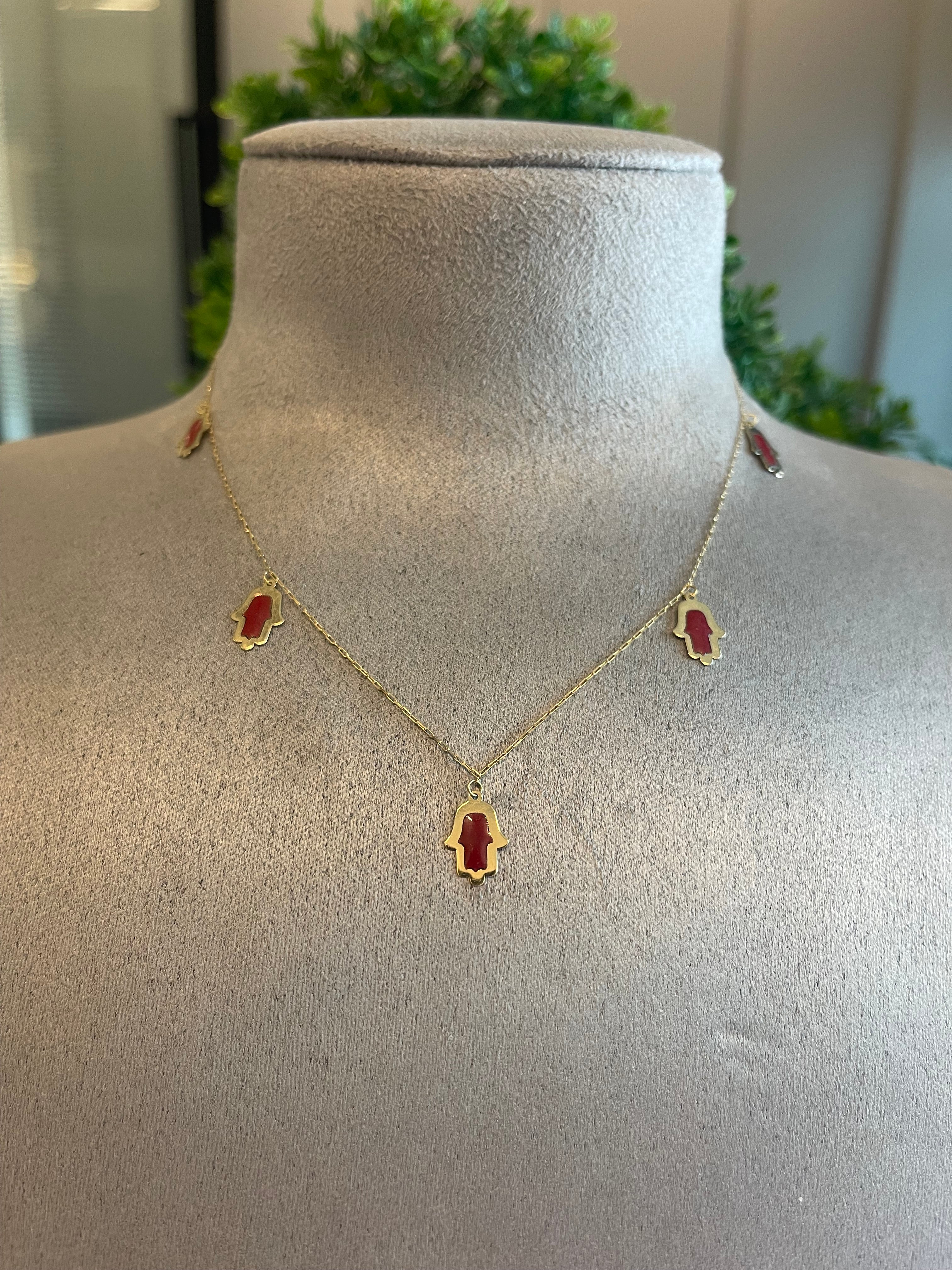 Elevate your look with our 18KT Gold Necklace adorned with intricate red enamel hamza hand charms encircling the chain. The rich red enamel adds a pop of color and cultural significance. Whether worn alone as a focal point or layered for a personalized style.