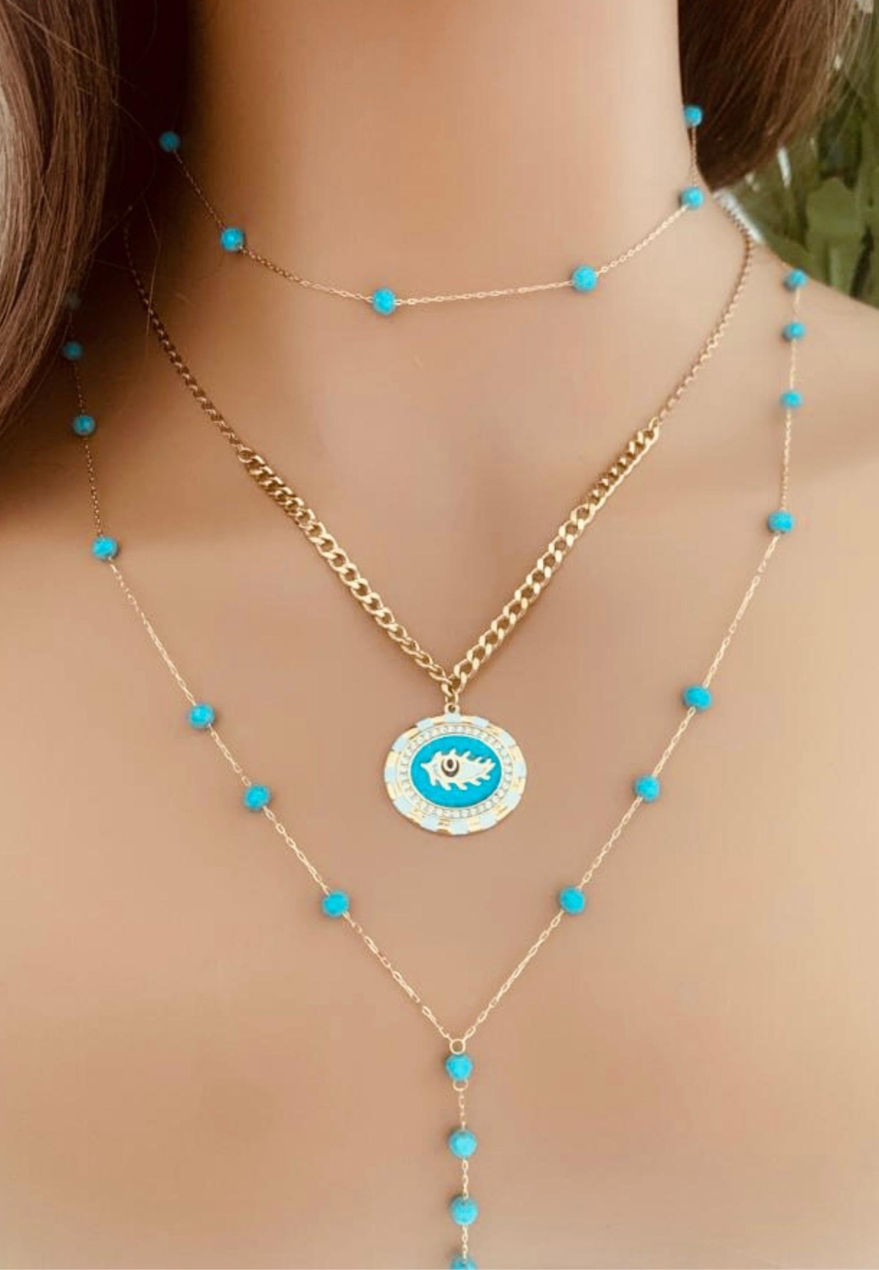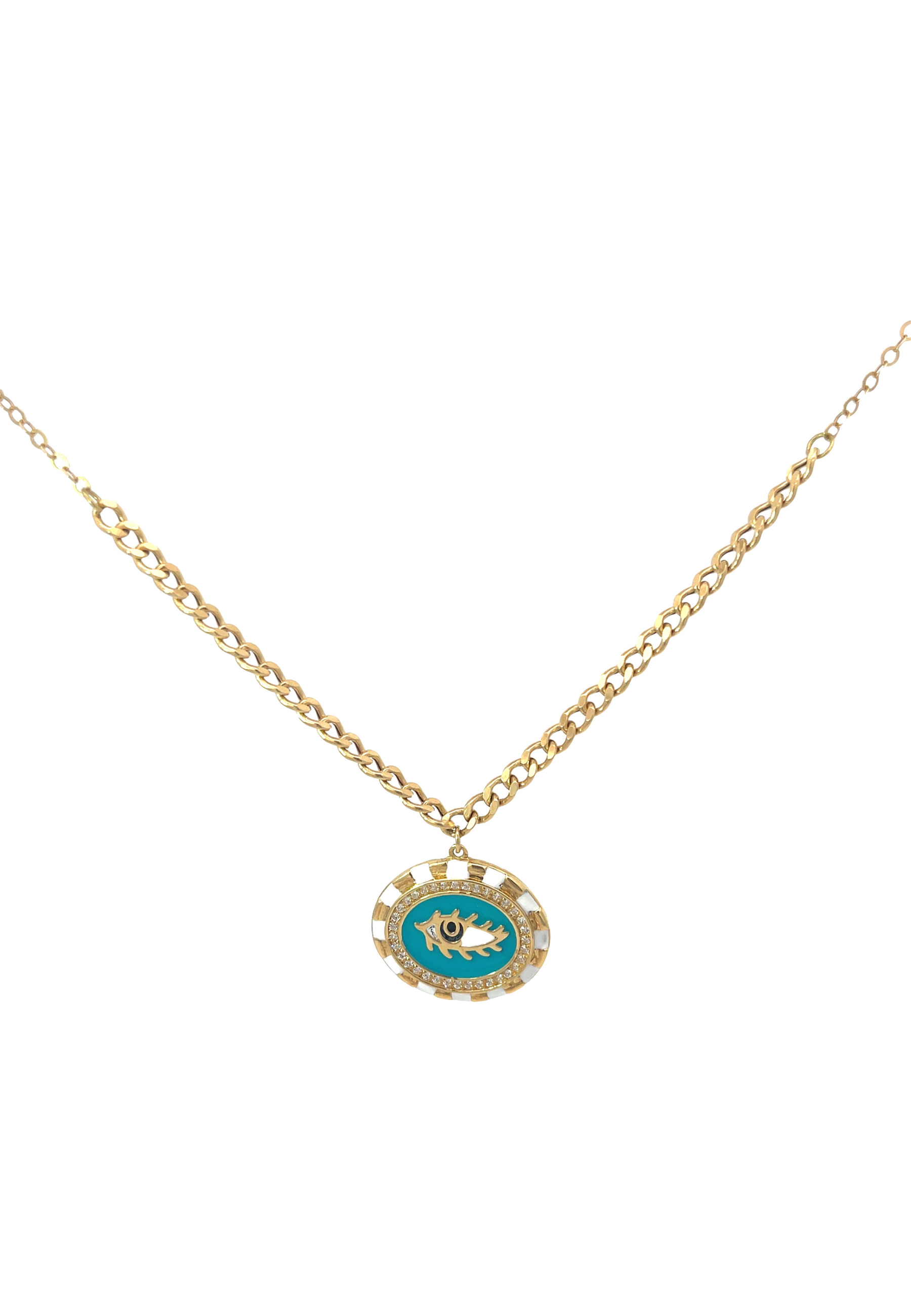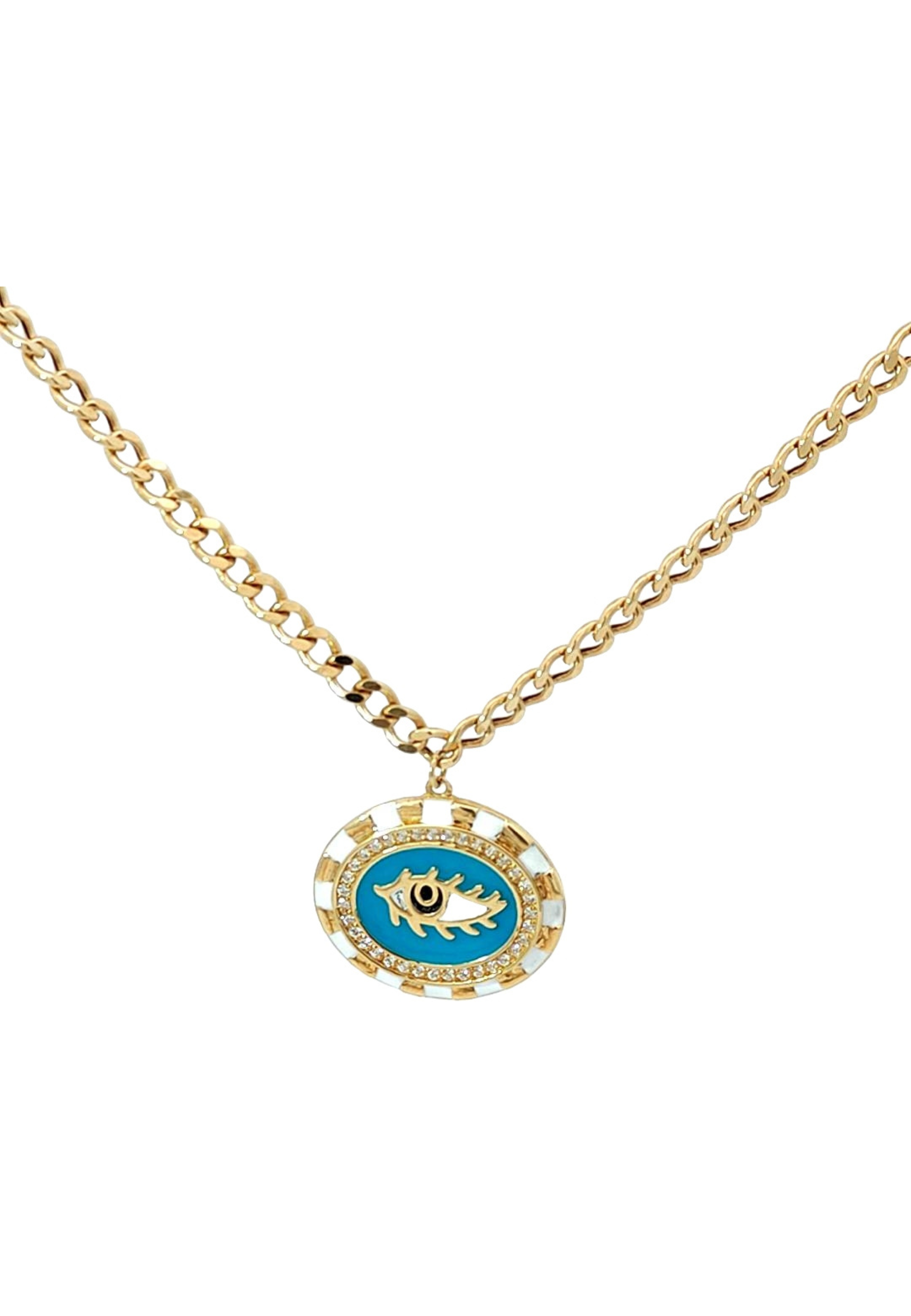 Elevate your look with our exquisite 18KT Gold necklace, adorned with intricate white and blue enamel detailing and a symbolic eye motif. This captivating piece seamlessly blends ancient symbolism with contemporary elegance, making it a timeless addition to any jewelry collection.