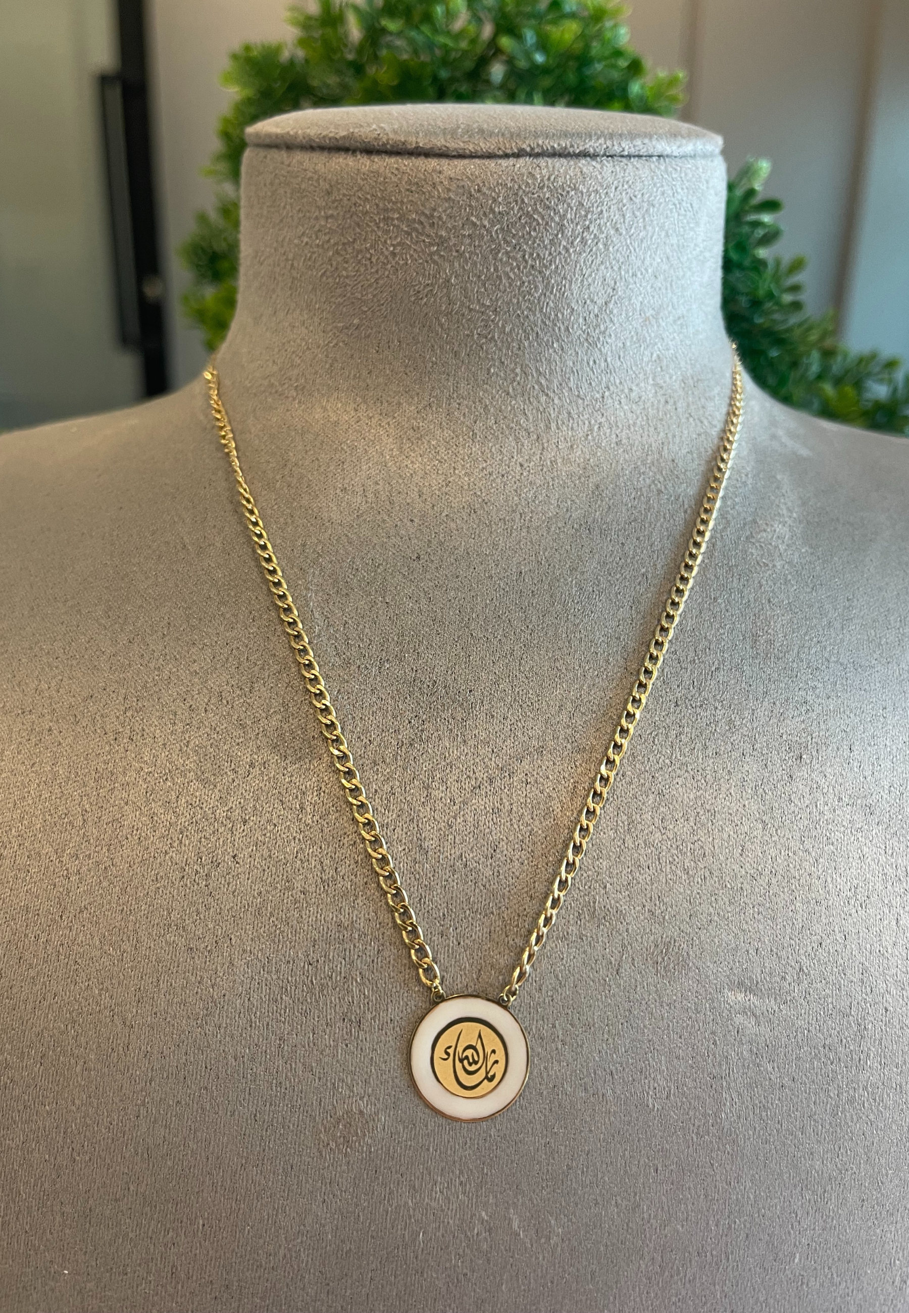 Our 18KT Gold Necklace, featuring a stunning circle pendant adorned with pristine white enamel and a beautifully inscription. This necklace combines timeless luxury with a personalized touch, creating a unique and meaningful accessory.