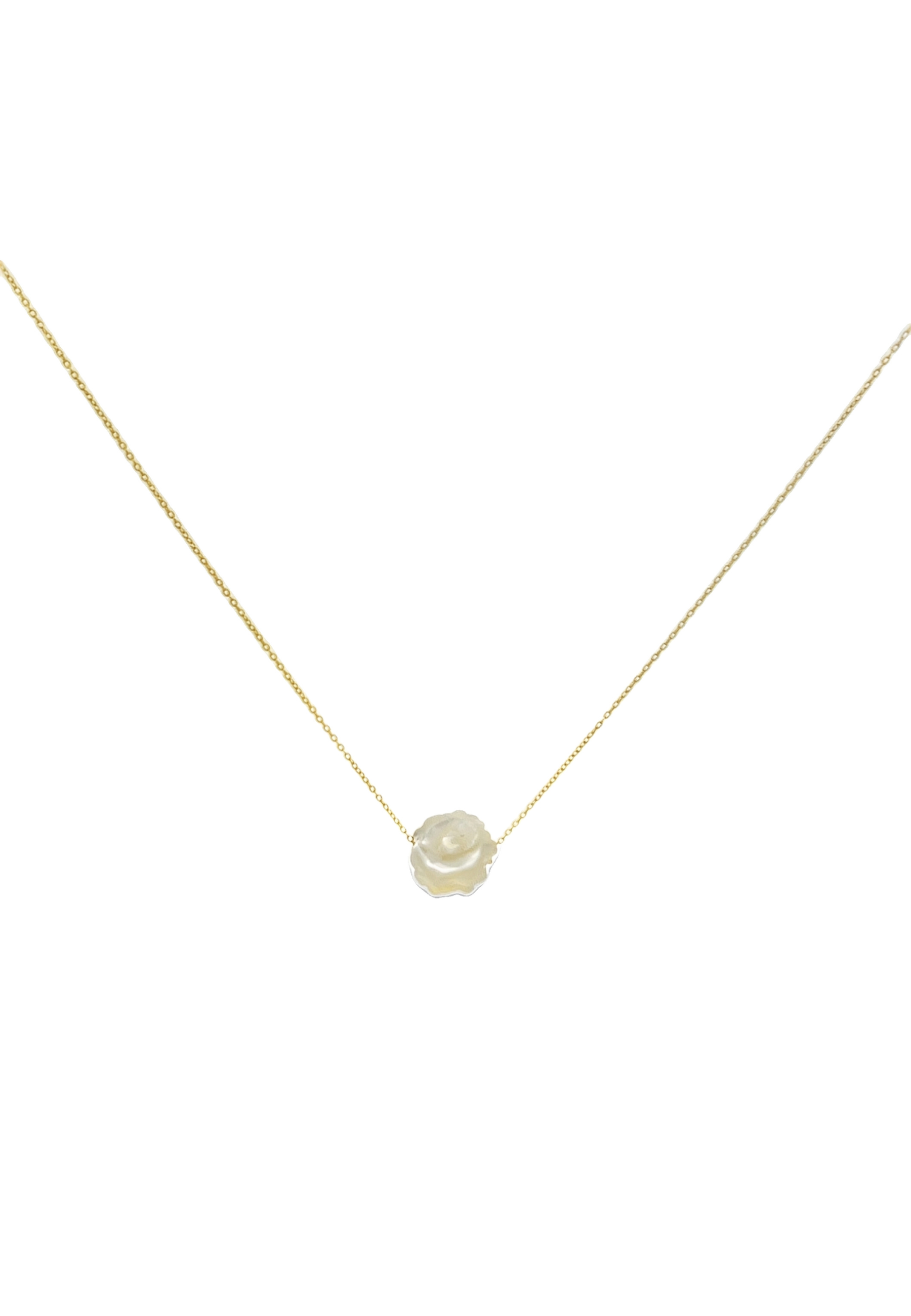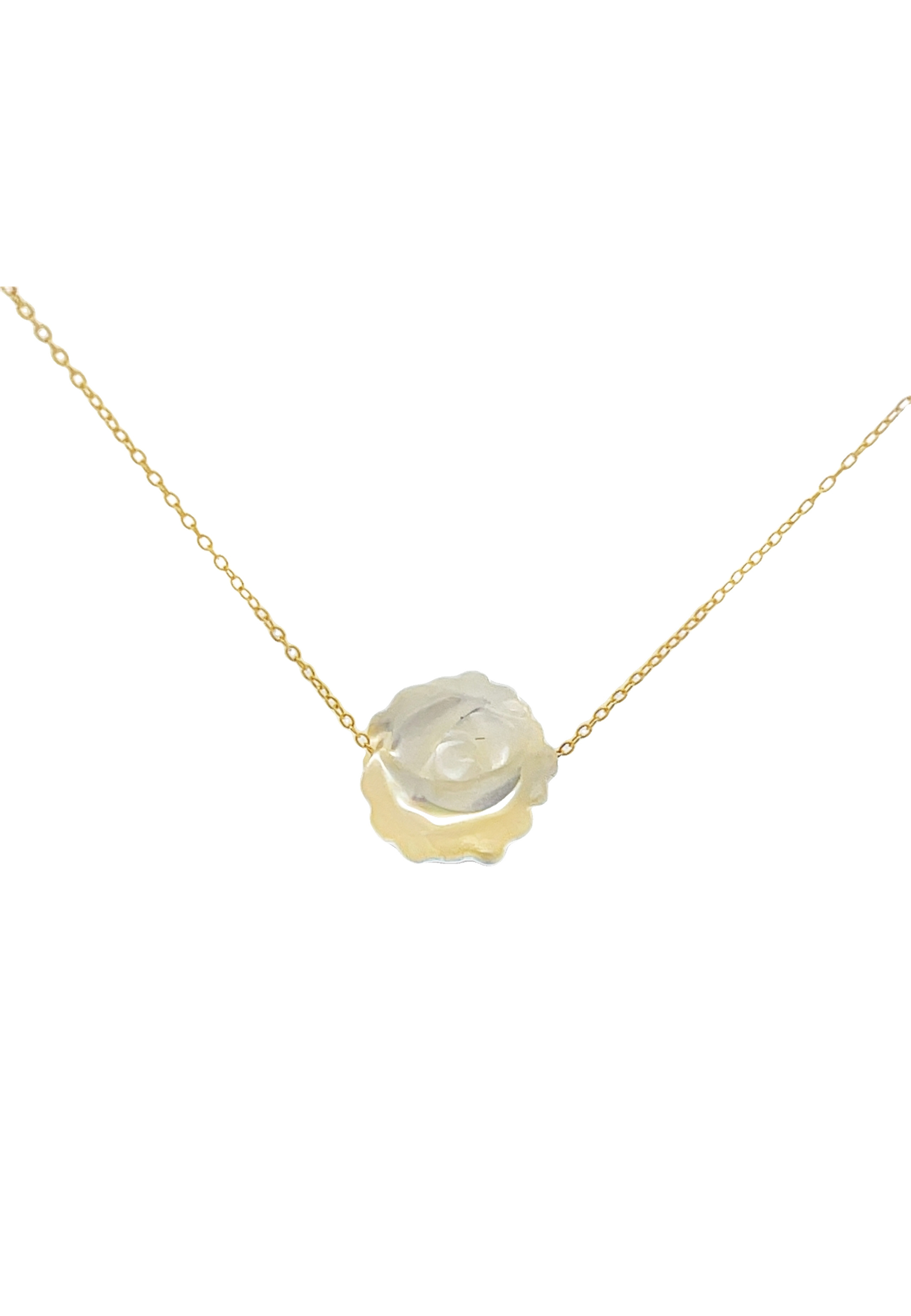 The 18KT Gold Pearl Rose Flower Necklace showcases a delicate rose flower pendant adorned with a lustrous pearl. Crafted from luxurious 18KT Gold, this elegant piece combines natural beauty with timeless sophistication, making it a perfect accessory for adding grace to any outfit.