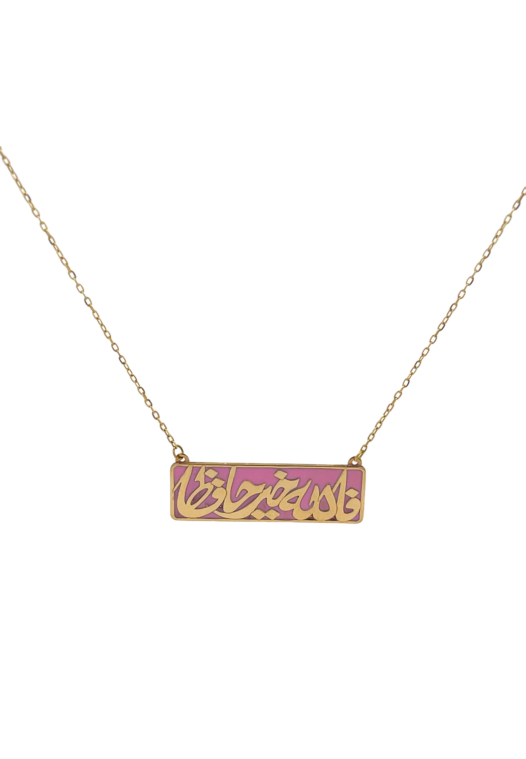 Elevate your spirit with our exquisite 18KT Gold Necklace adorned with a meaningful enamel pendant inscribed with 'God is the best protector'. The delicate pink enamel work and gold Arabic writing it stands out as a statement of faith and style.