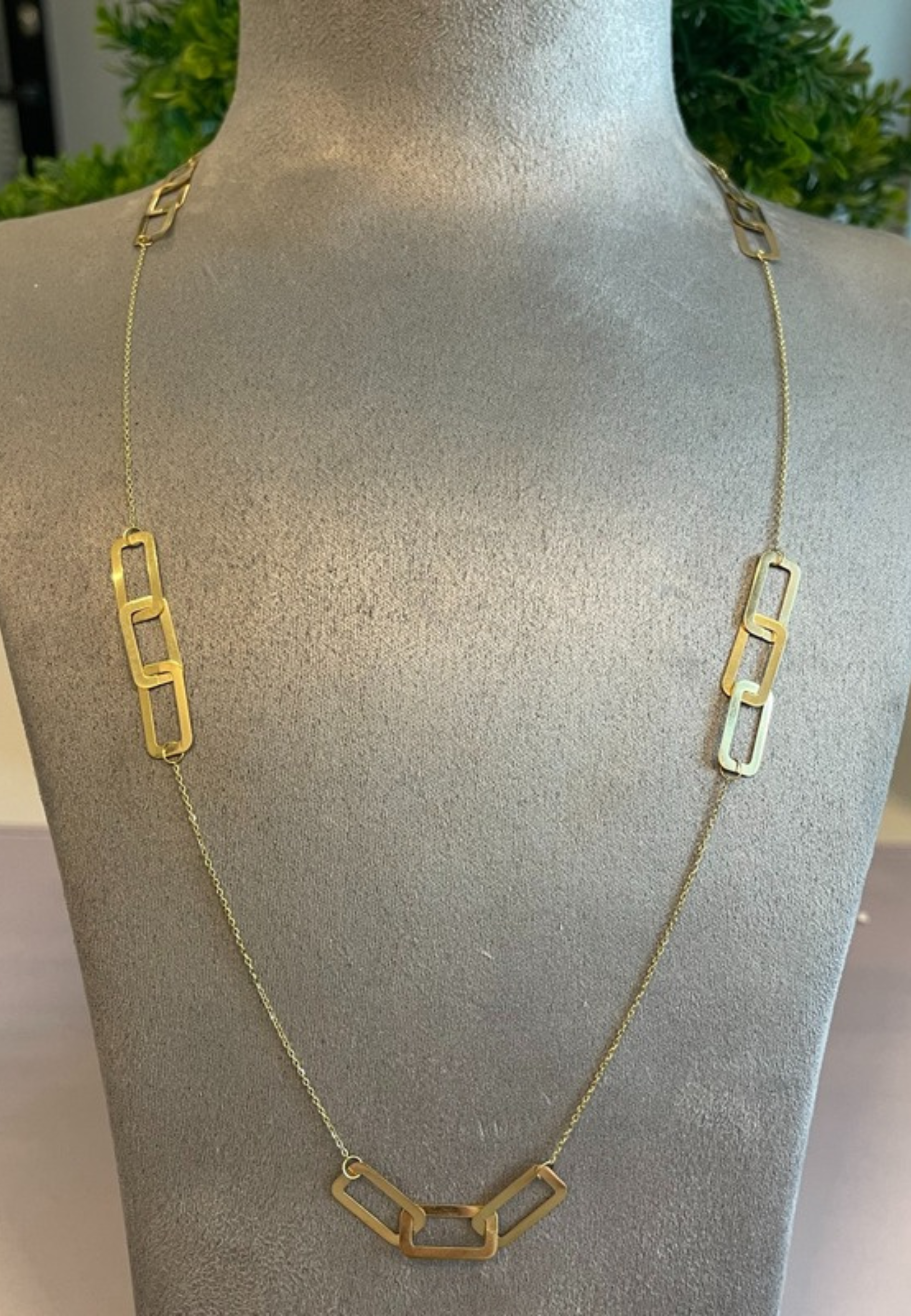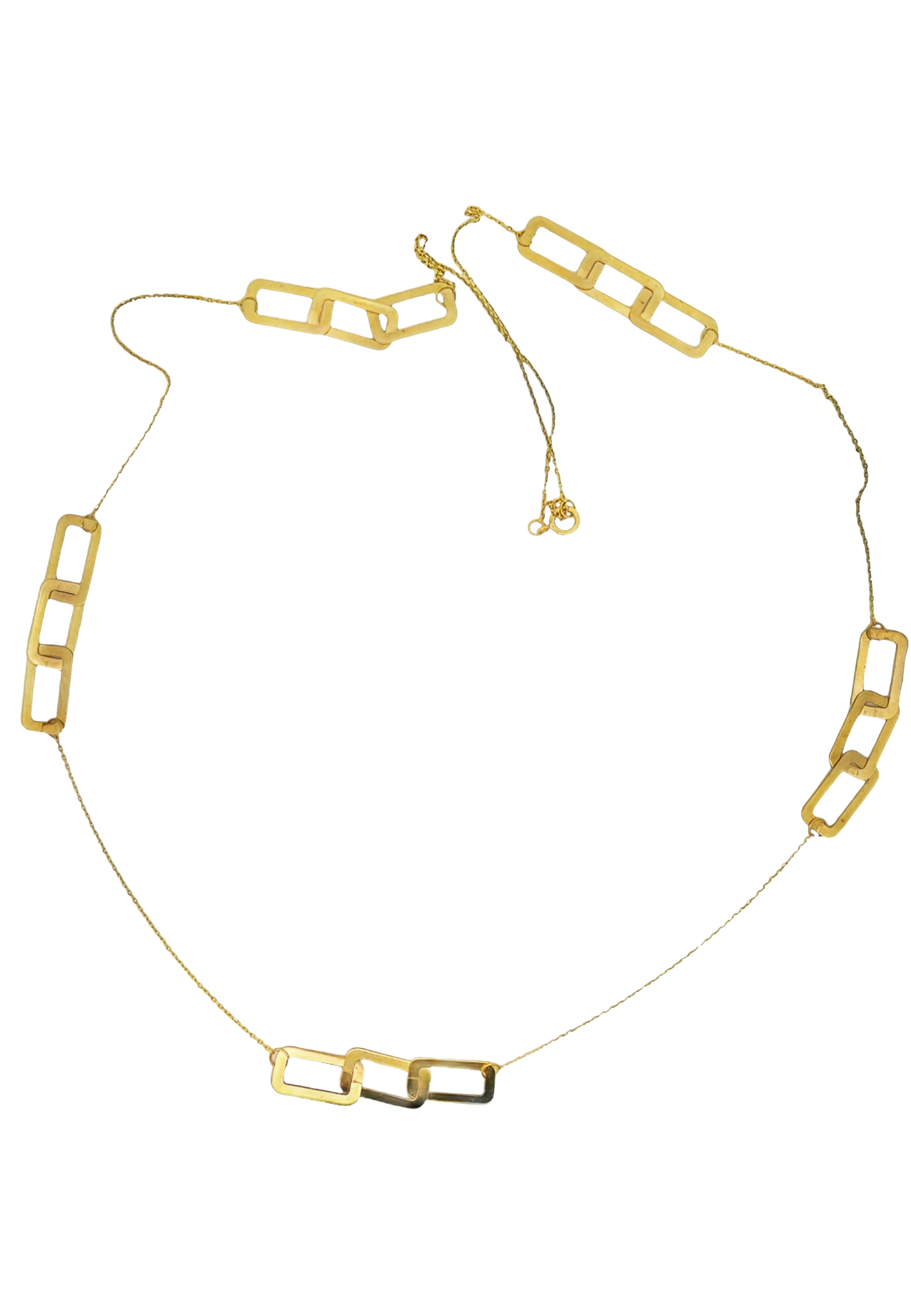 The 18KT Gold Rectangular Necklace features a sleek and modern rectangular pendant crafted from luxurious 18KT Gold. This elegant piece adds a touch of contemporary sophistication to any outfit, making it a versatile and stylish accessory.
