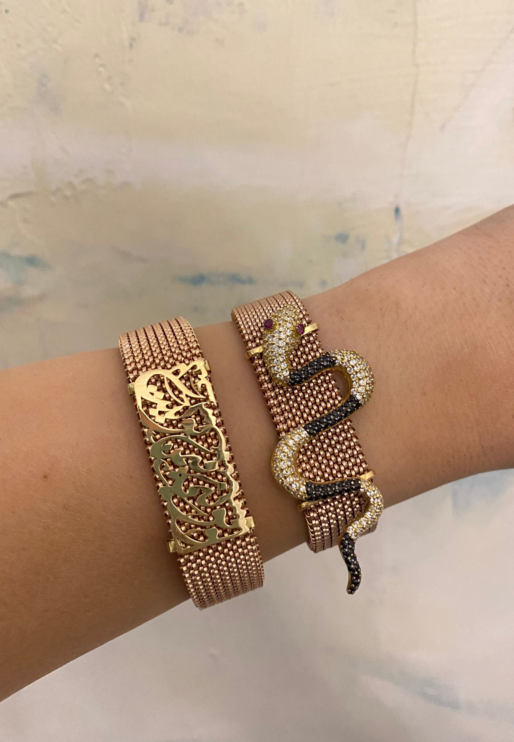 The 18KT Gold Snake Zircon Bracelet features an intricately designed snake motif adorned with sparkling zircon stones. Crafted from luxurious 18KT Gold, this elegant piece combines exotic allure with sophisticated style, making it a unique and captivating accessory.