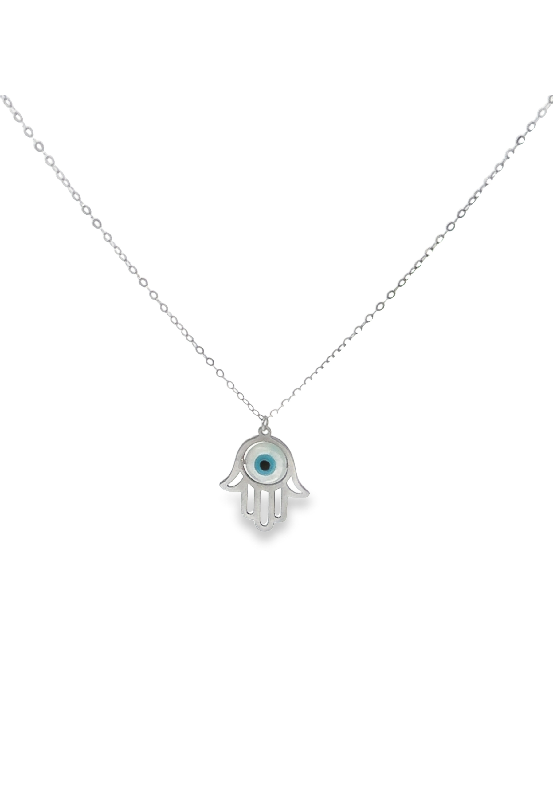 The 18KT White Gold Hamza Eye Necklace features an intricately designed pendant that combines the Hamza hand and the protective eye motif, crafted in elegant white gold. This piece blends spiritual symbolism with stylish elegance, making it a unique and meaningful accessory.