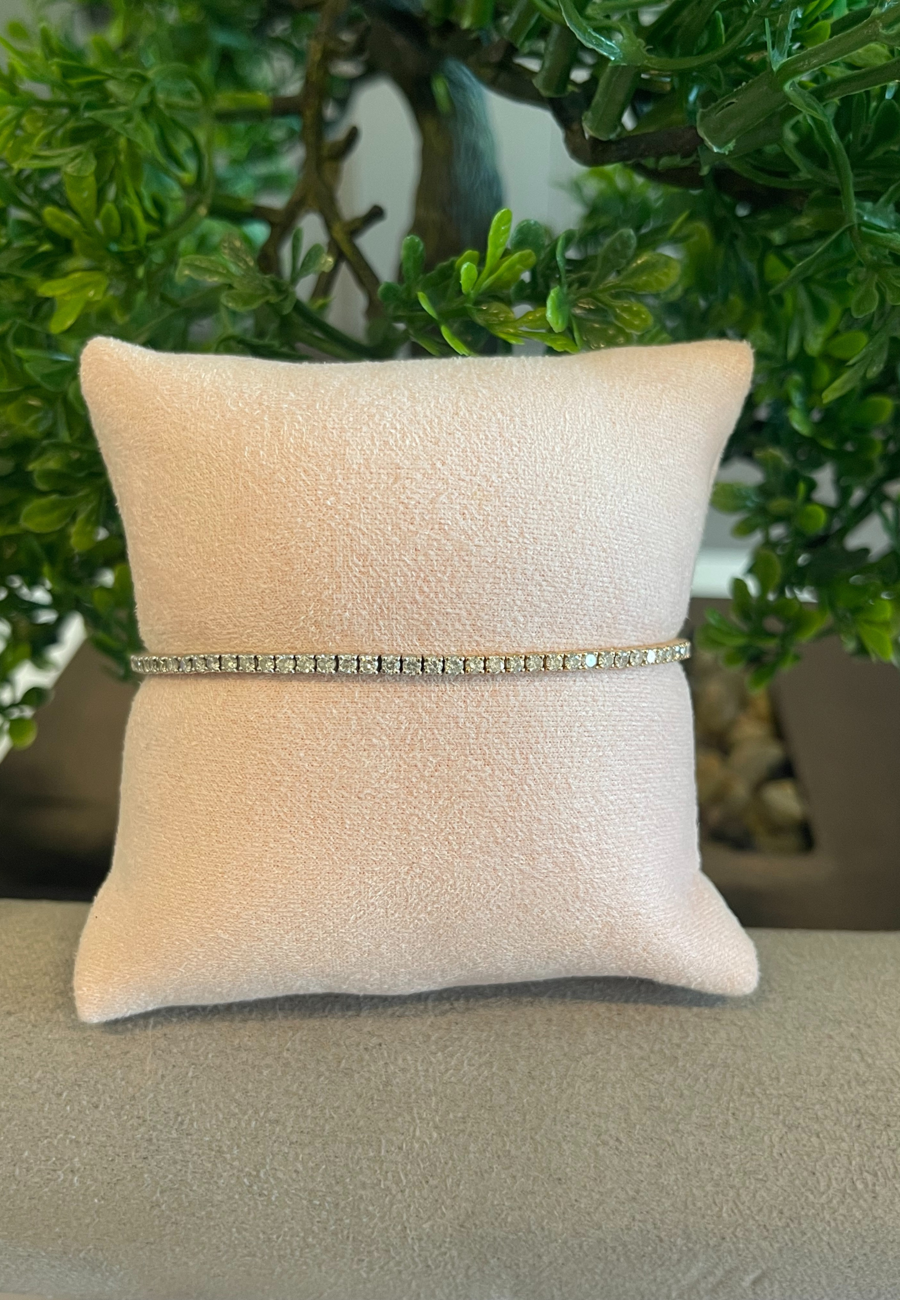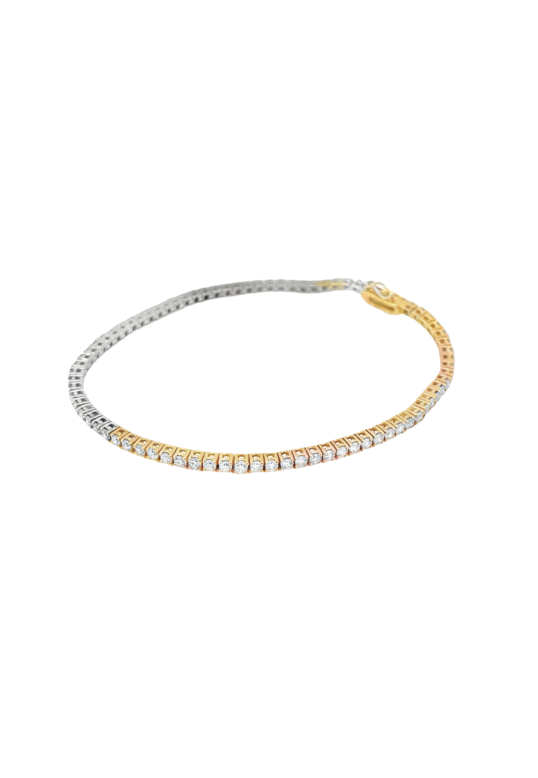 Our stunning 18KT Gold Tennis Bracelet, artfully designed with a unique half yellow gold and half white gold polish combines classic luxury. Whether worn solo as a statement piece or stacked with other favorites, its timeless design ensures effortless style and allure.