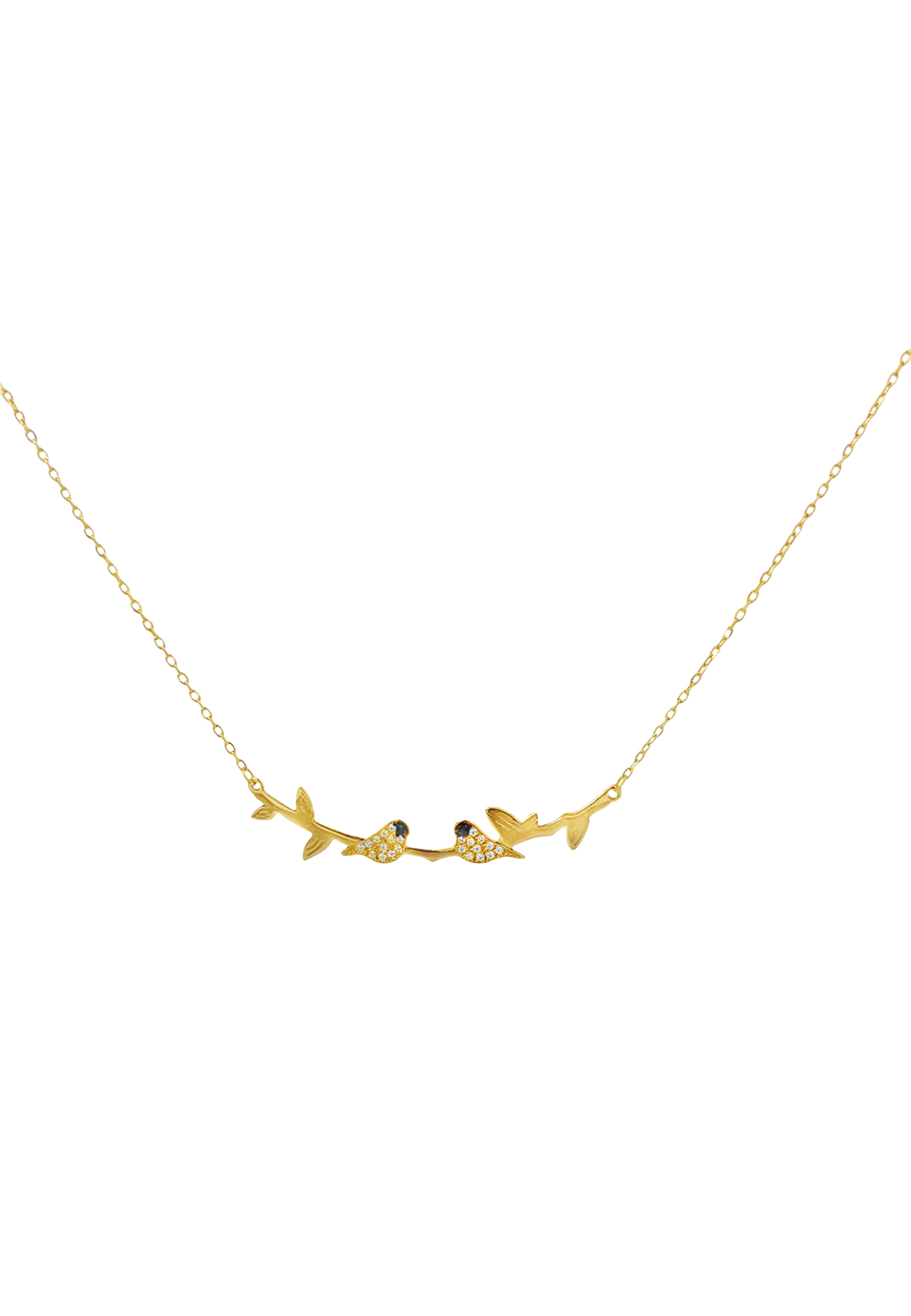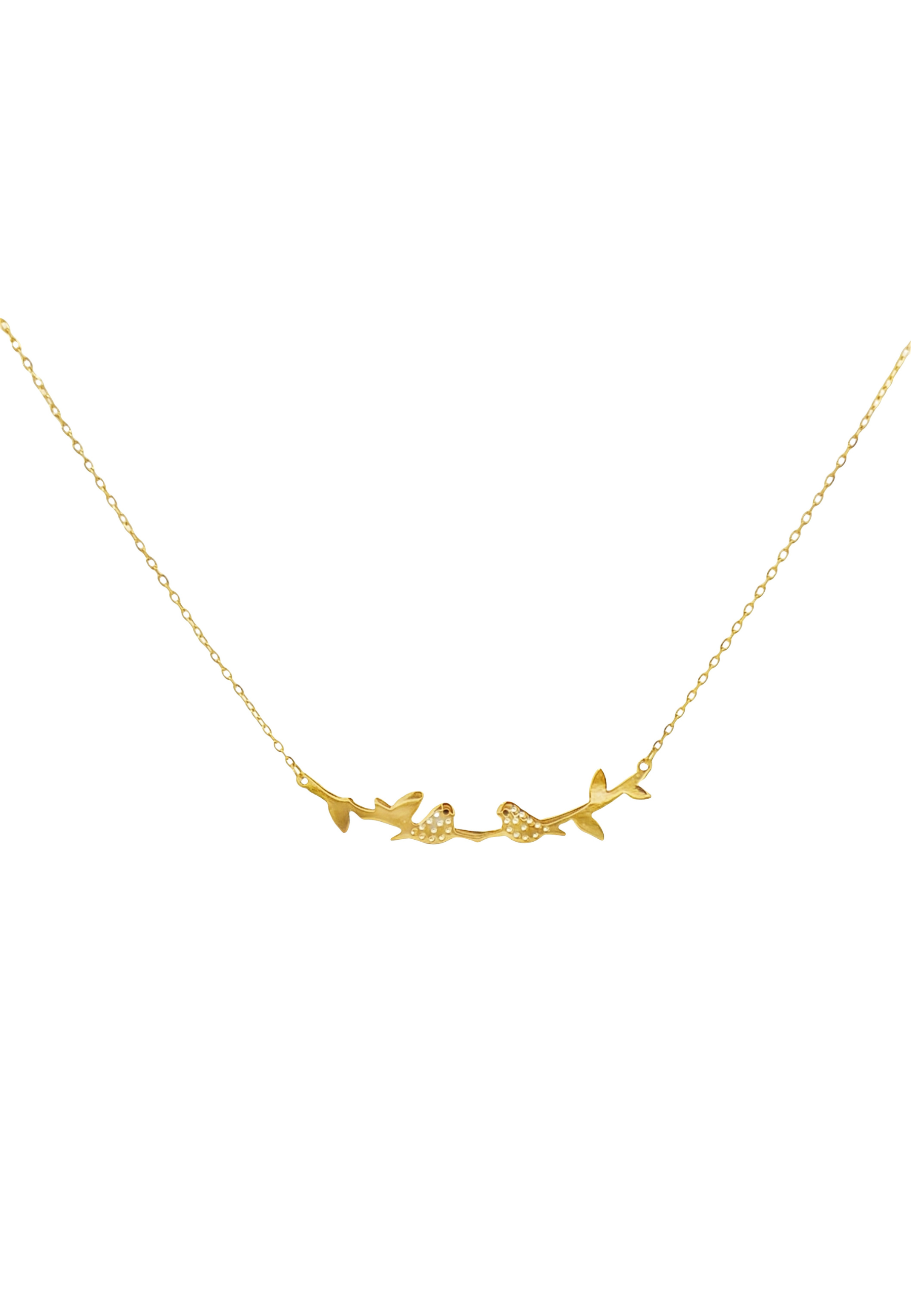 Embrace nature's beauty with our stunning 18KT Gold Necklace, showcasing two intricately designed birds chirping amidst shimmering zircon stones and delicate leaf motifs. The lifelike bird and leaf design symbolizes harmony and new beginnings, adding a touch of whimsy to your jewelry collection.