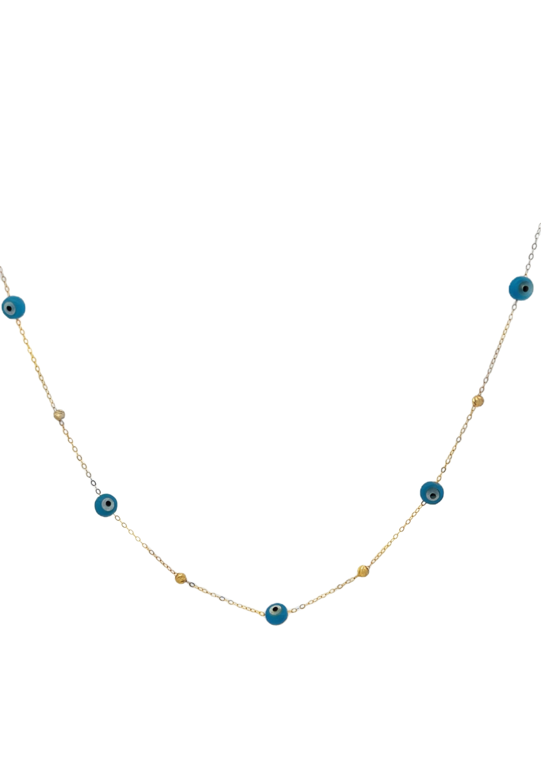 The 18KT Gold Blue Evil Eye Necklace features a protective blue enamel eye design set in radiant 18 karat gold. Symbolizing good luck and warding off negativity, this elegant piece blends meaning with timeless style.