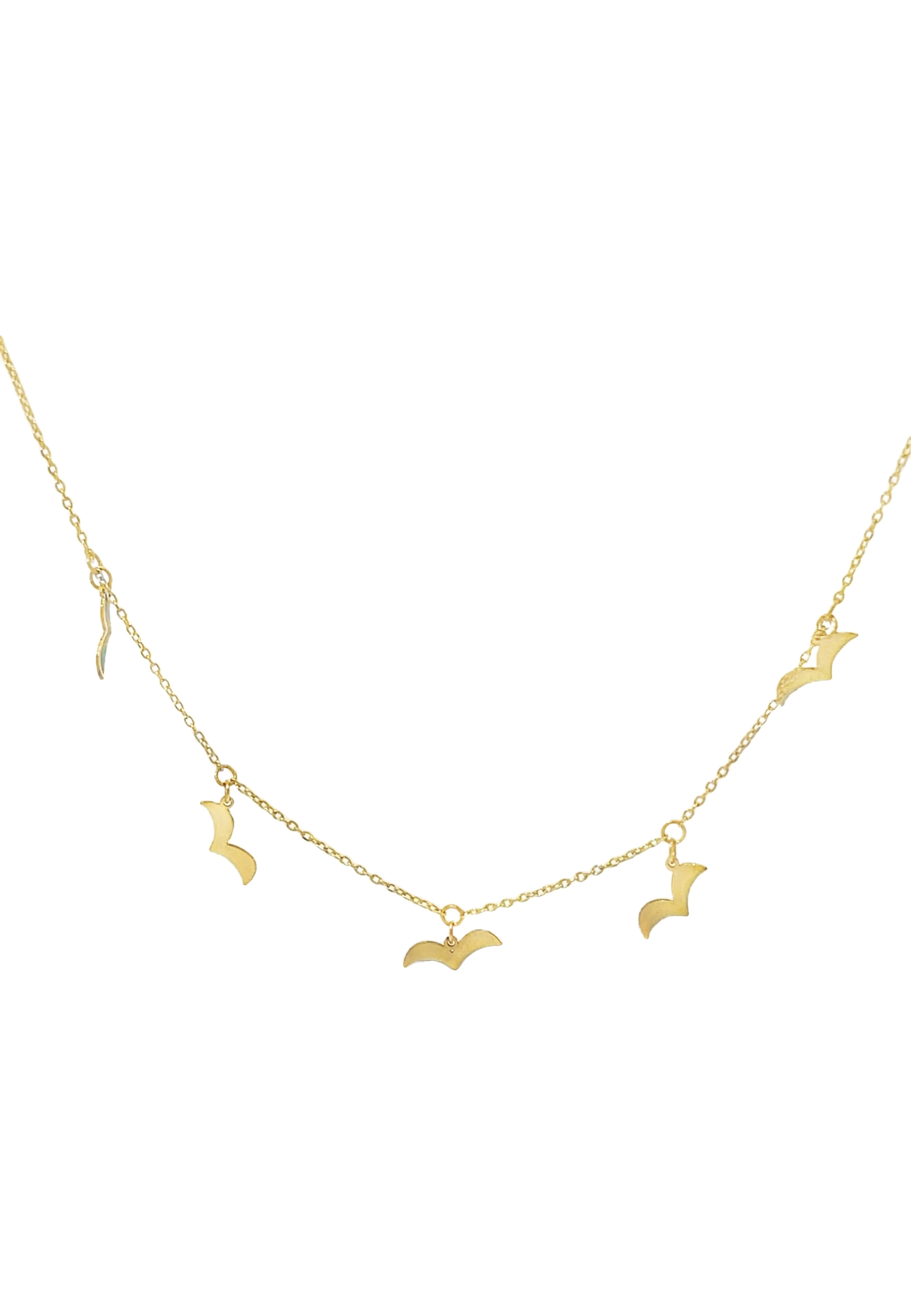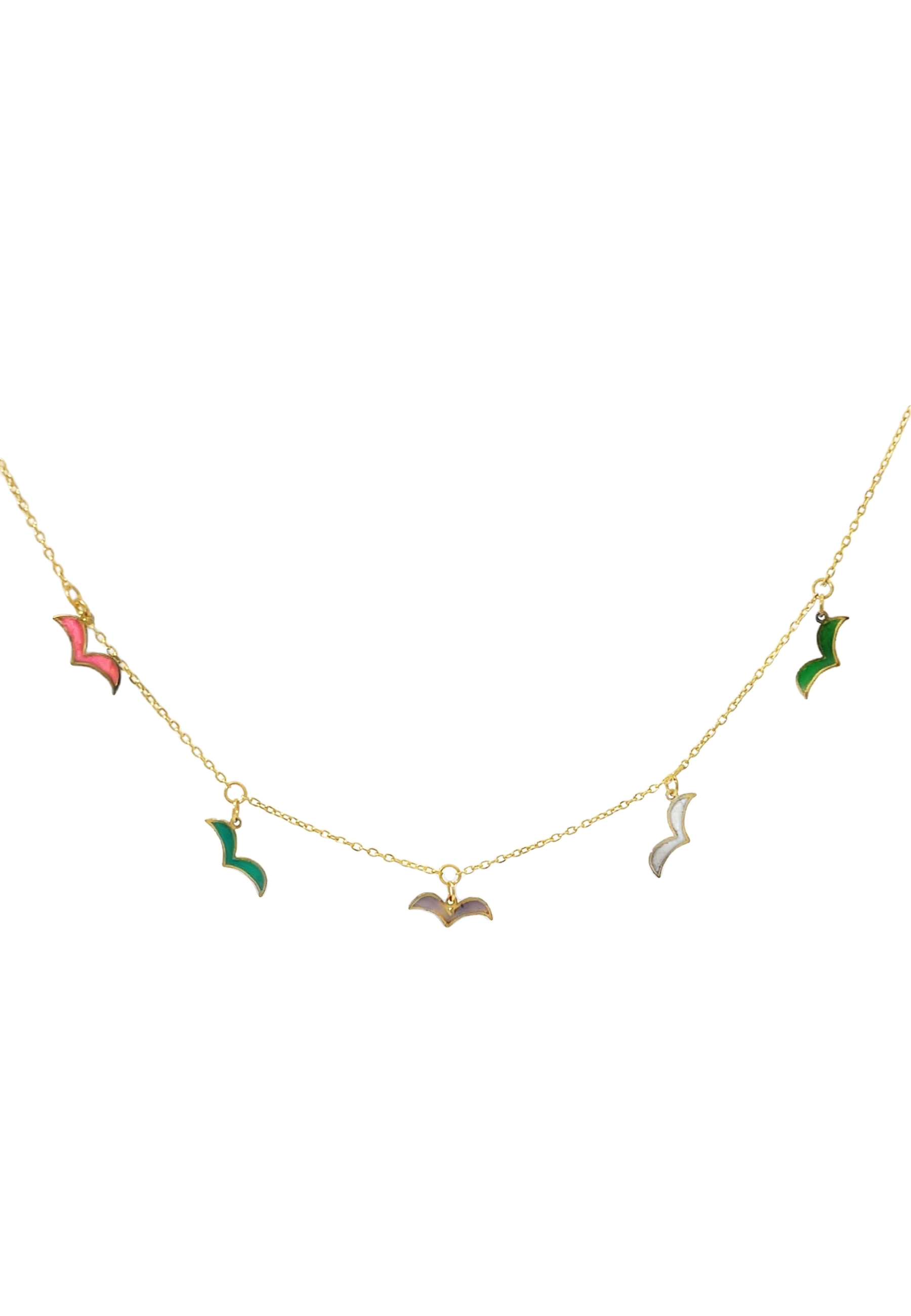 The 18KT Gold Colorful Birds Enamel Necklace features a delightful arrangement of bird motifs adorned with vibrant enamel, all crafted in 18KT Gold. This whimsical and elegant piece brings a joyful, nature-inspired charm to any outfit.