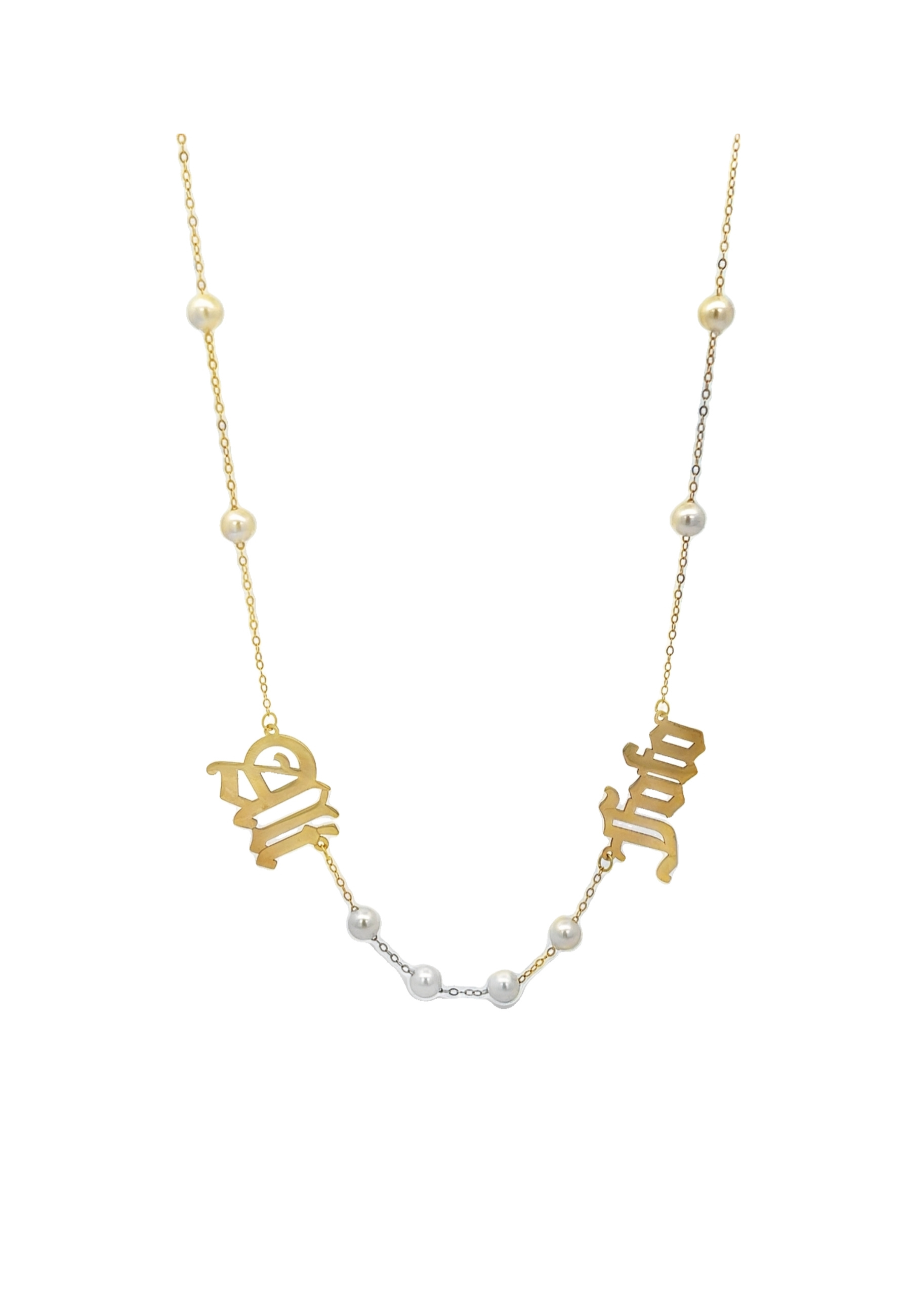 This 18KT gold necklace features a customizable design adorned with elegant white pearls, blending personal expression with classic sophistication. A timeless piece perfect for any occasion.