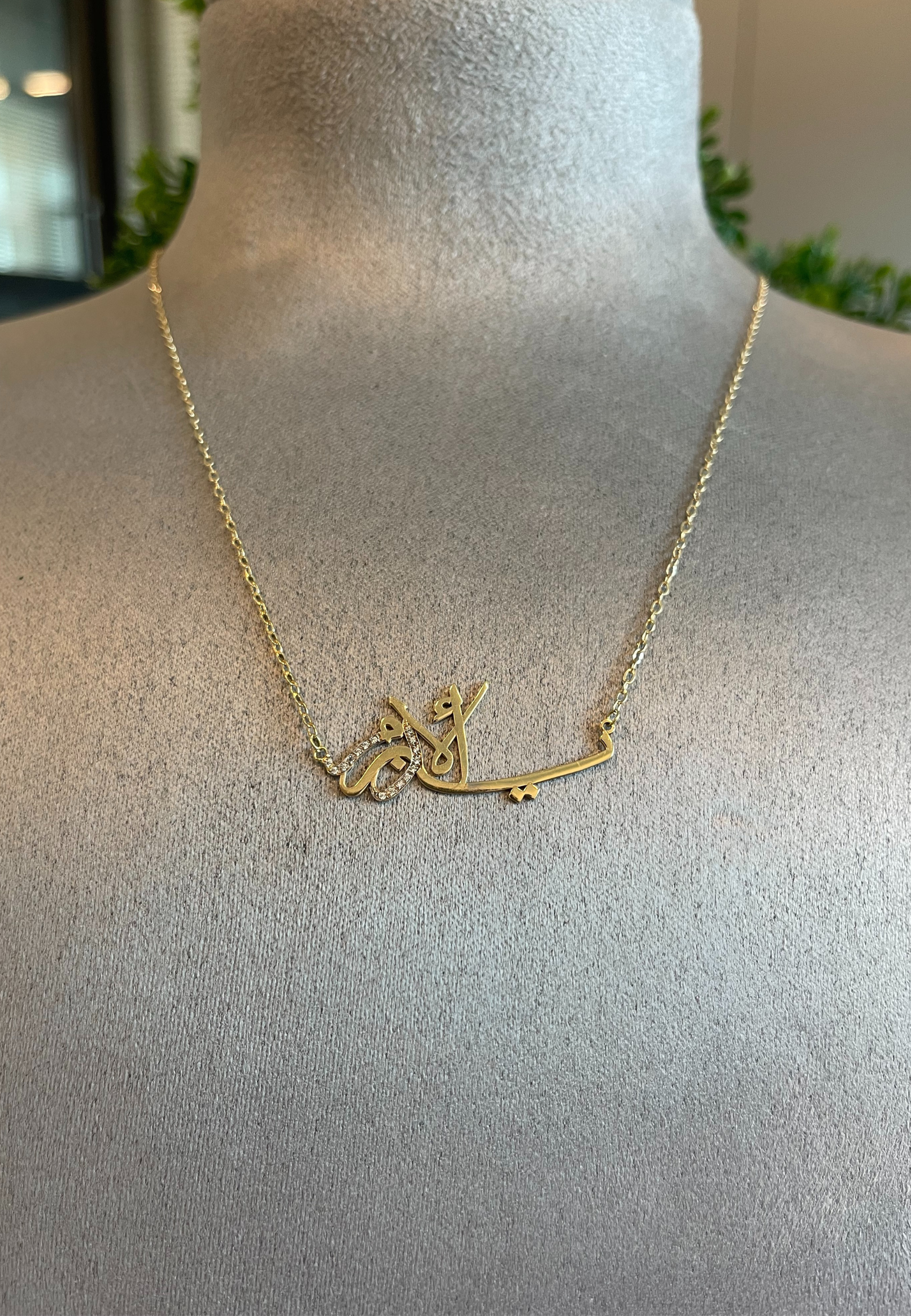 This 18KT gold necklace features a customizable design adorned with shimmering zircon stones, offering a personal touch with timeless elegance. Perfect for creating a meaningful and stylish accessory.