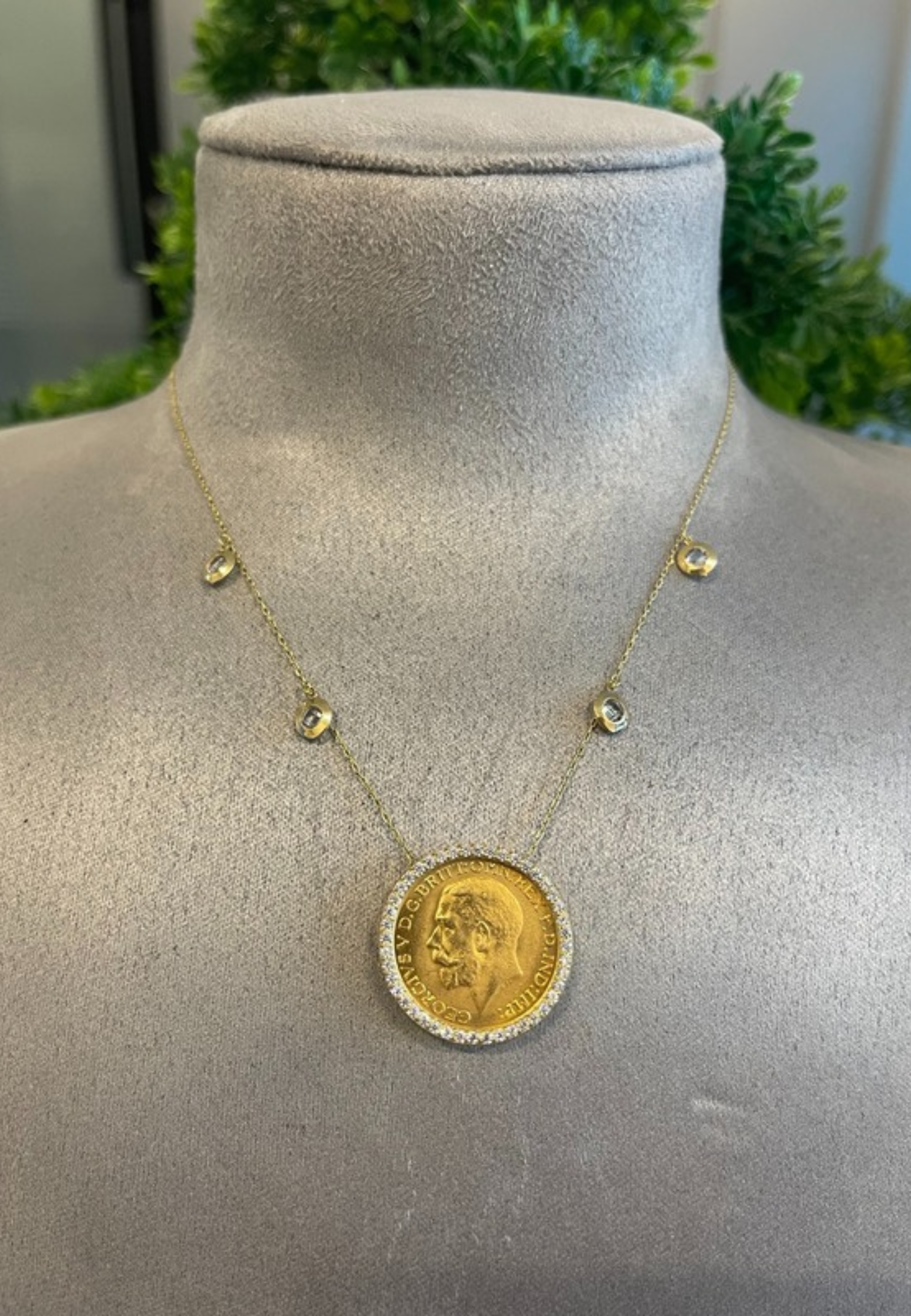 18KT Gold Dangling Zircon with British Coin Necklace