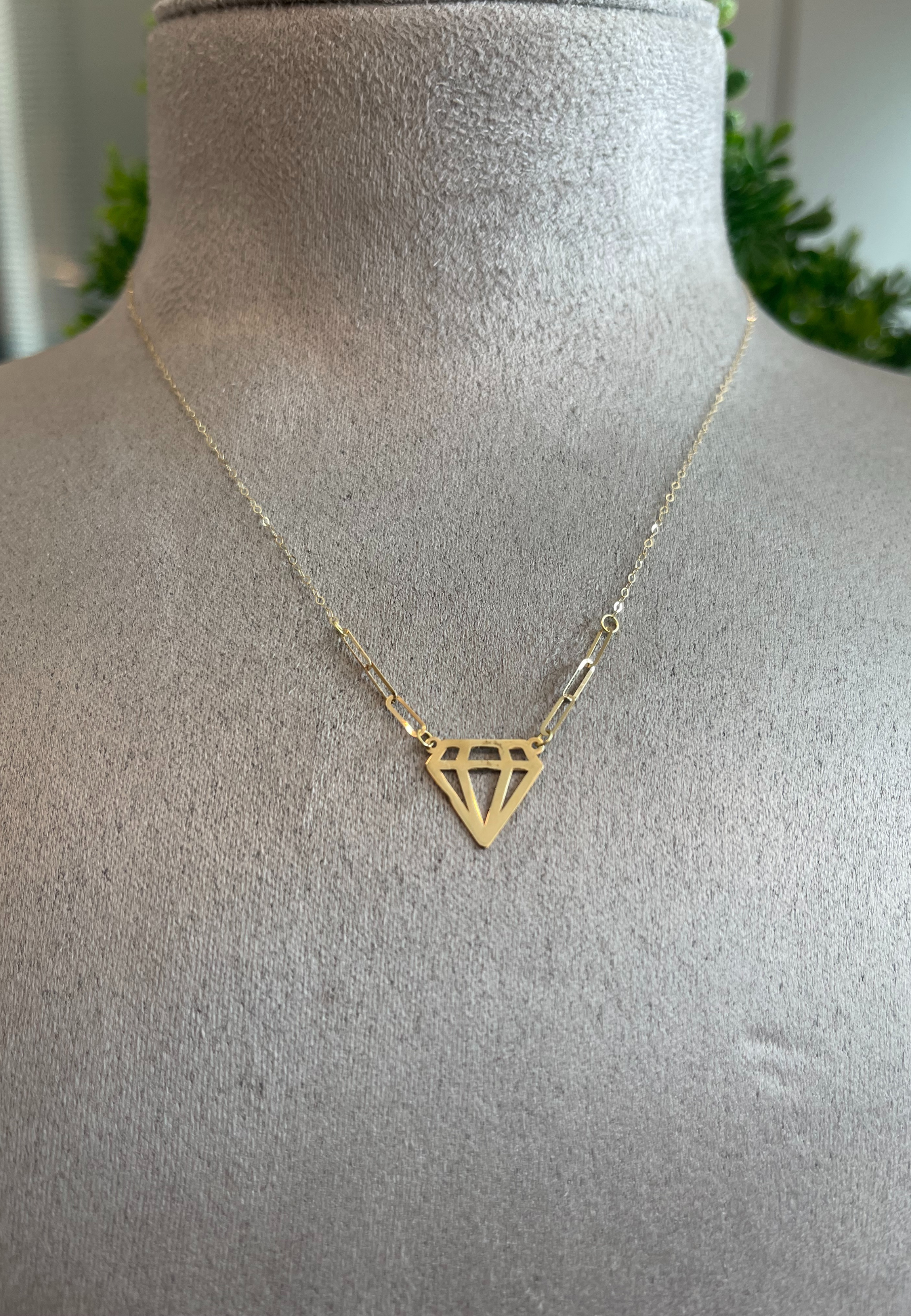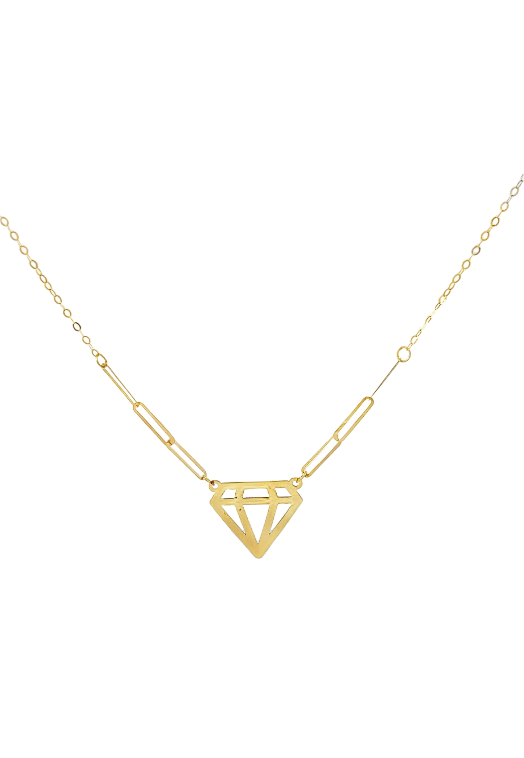 The 18KT Gold Diamond Shaped Charm Necklace features a sleek geometric pendant in a diamond silhouette, crafted in 18KT Gold. Elegant and modern, this piece adds a refined touch to both casual and formal looks.