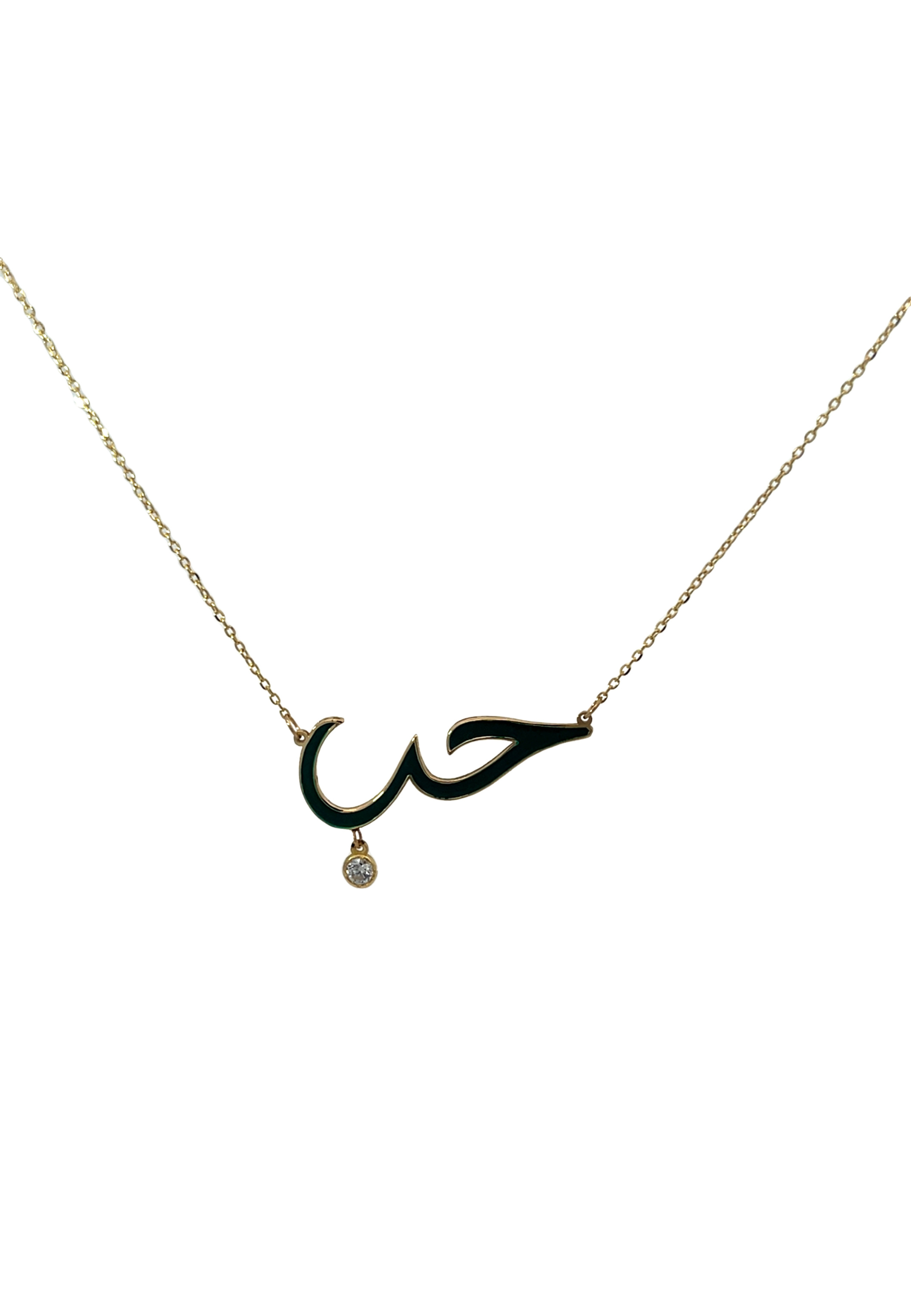 The 18KT Gold Green Enamel Love Necklace with Zircon features a stylish "Love" design crafted in 18KT Gold, accented with vibrant green enamel and a sparkling zircon stone. This elegant piece adds a touch of color and charm, making it a perfect everyday accessory or heartfelt gift.