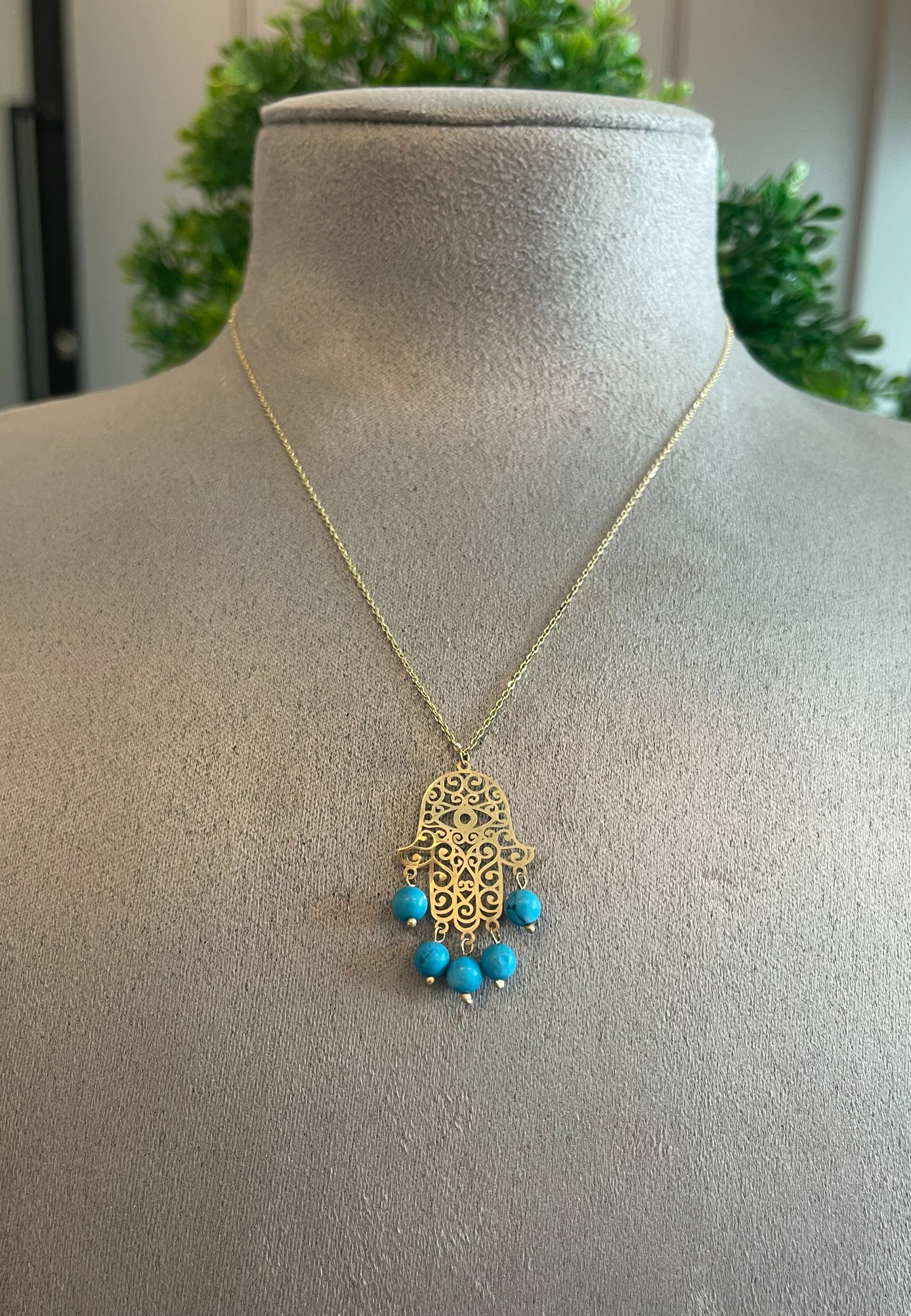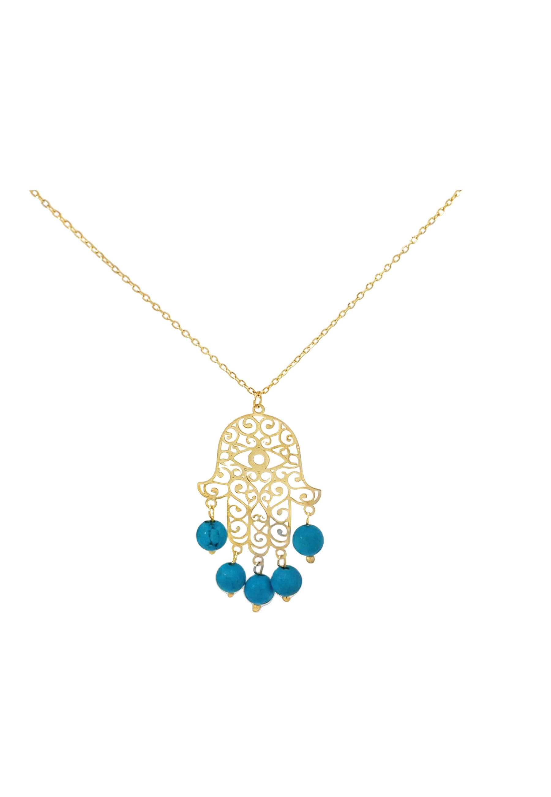 The 18KT Gold Hamsa Hand with Fairouz Necklace features a protective Hamsa hand design paired with the elegant Fairouz stone all crafted in 18KT Gold. This meaningful piece symbolizes protection, beauty, and cultural pride.