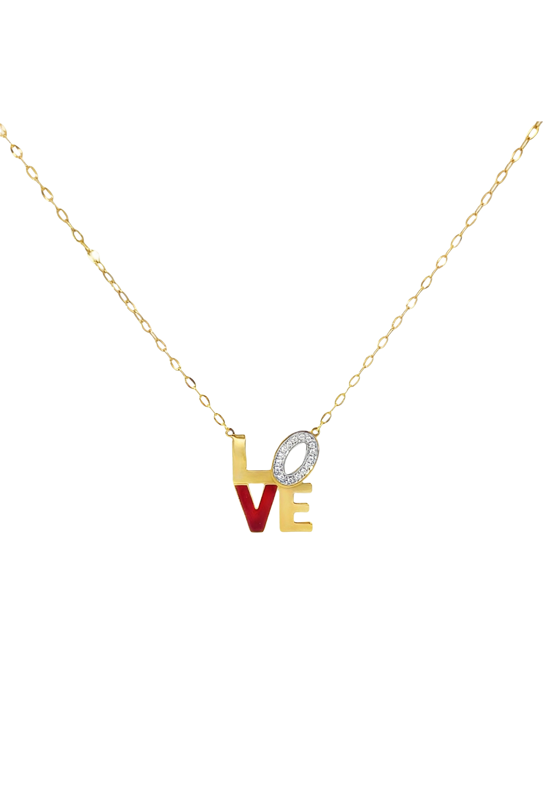 أضفي لمسة من الأناقة على إطلالتك مع قلادتنا الرائعة المصنوعة من الذهب عيار 18 قيراطًا، والتي تتميز بقلادة آسرة تحمل كلمة "حب" مرصعة بالزركون المتلألئ والمينا الحمراء النابضة بالحياة على الذهب المتألق. إنها الإضافة المثالية لمجموعتك من المجوهرات، حيث تجمع بين الحرفية العالية والتعبير العاطفي.