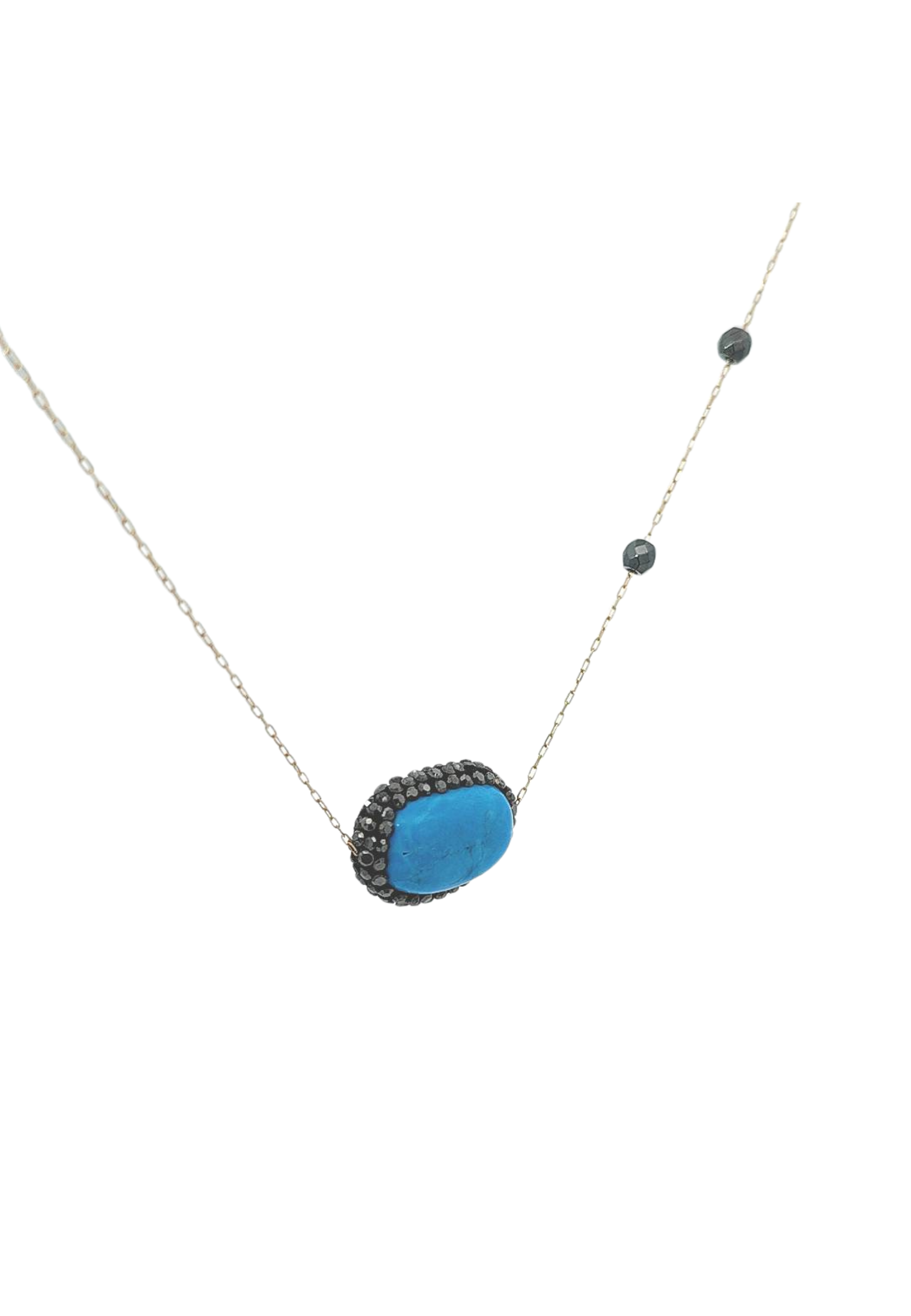 دللي نفسكِ بإطلالة راقية مع قلادتنا الذهبية الرائعة عيار 18 قيراطًا، والمزينة بحجر فيروز ساحر محاط ببراعة بأحجار الزركون السوداء المتلألئة. ارتقي بإطلالتكِ مع هذه القلادة المذهلة، التي تُجسّد براعة الصنع وجمالًا خالدًا.