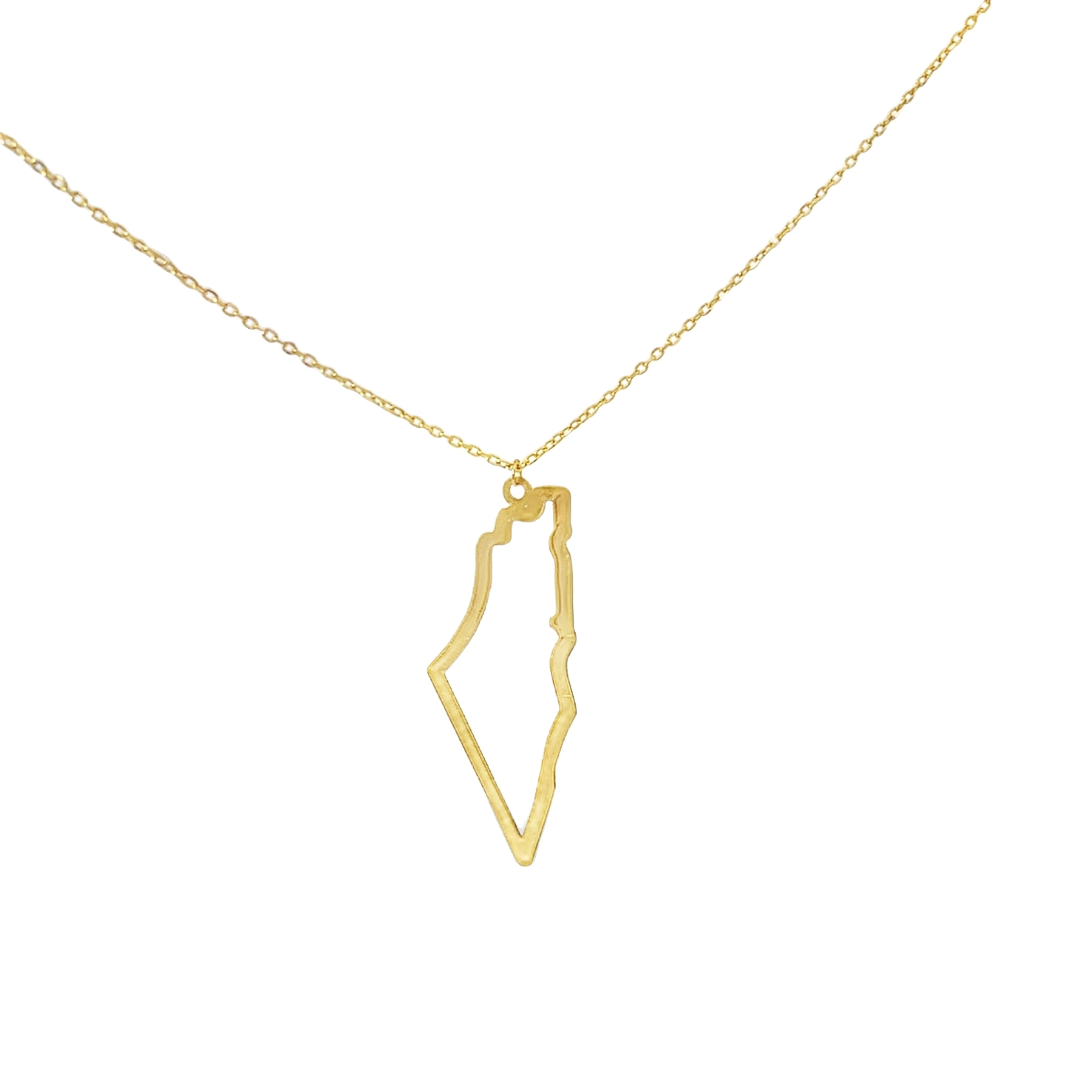 The 18KT Gold Palestine Map Necklace features a finely crafted map of Palestine in 18KT Gold, symbolizing heritage and pride. This meaningful piece combines elegance with cultural significance, making it a powerful and stylish accessory.