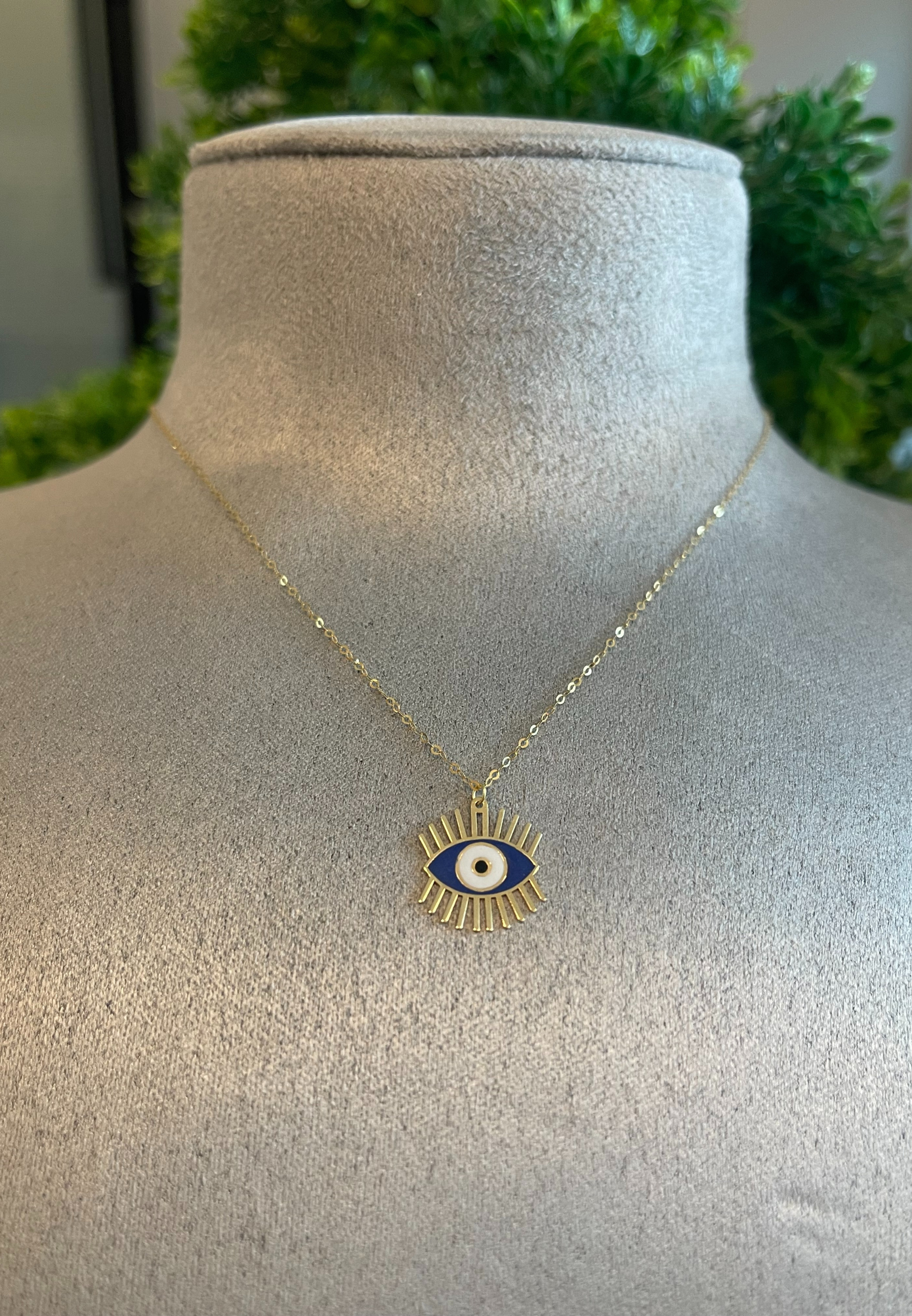 This exquisite necklace features a delicate chain adorned with a striking eye-shaped pendant. The intricate design and fine craftsmanship make it an elegant accessory for any occasion.