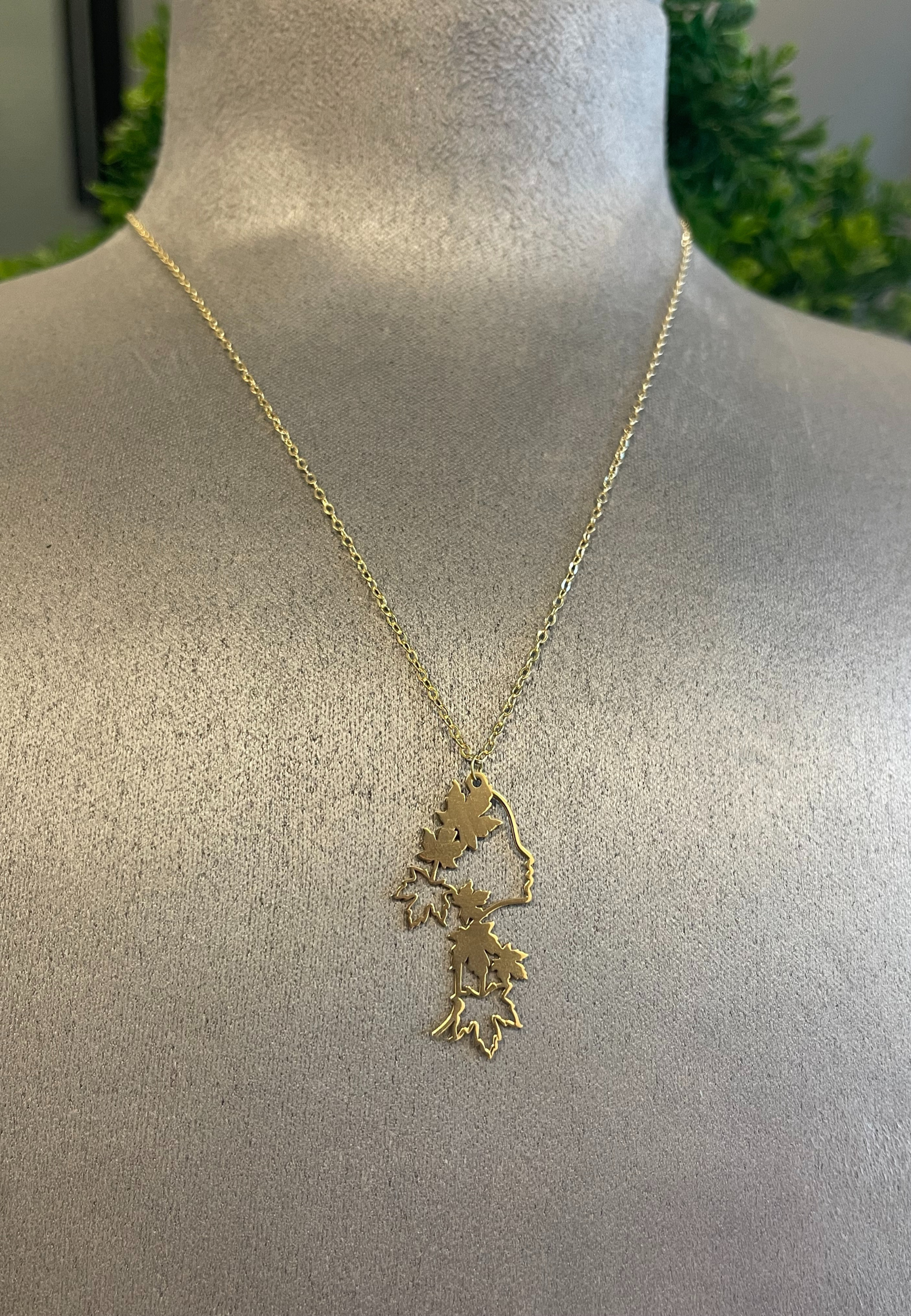 The 18KT Gold Face with Maple Leaves Necklace showcases an artistic face design adorned with delicate maple leaf accents, crafted from luxurious 18KT Gold. This distinctive piece combines natural beauty with elegance, making it a stylish and eye-catching accessory.