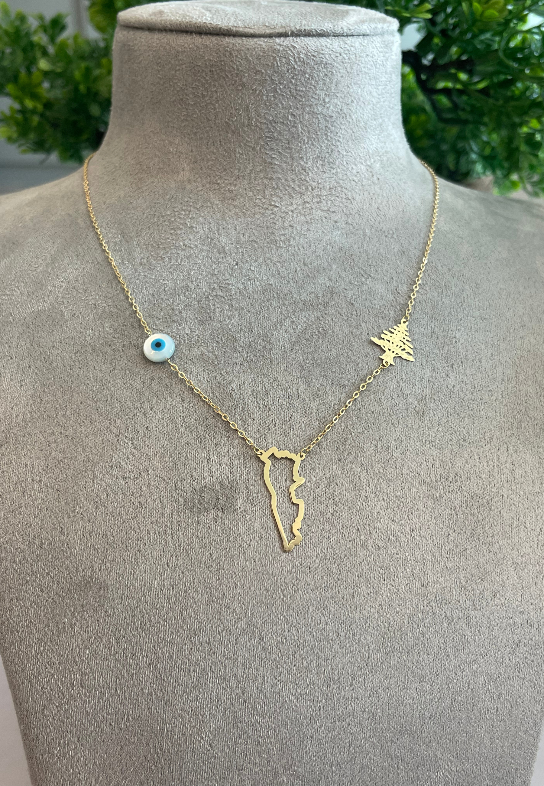 18KT Gold Map Necklace with Evil Eye and Cedar Tree