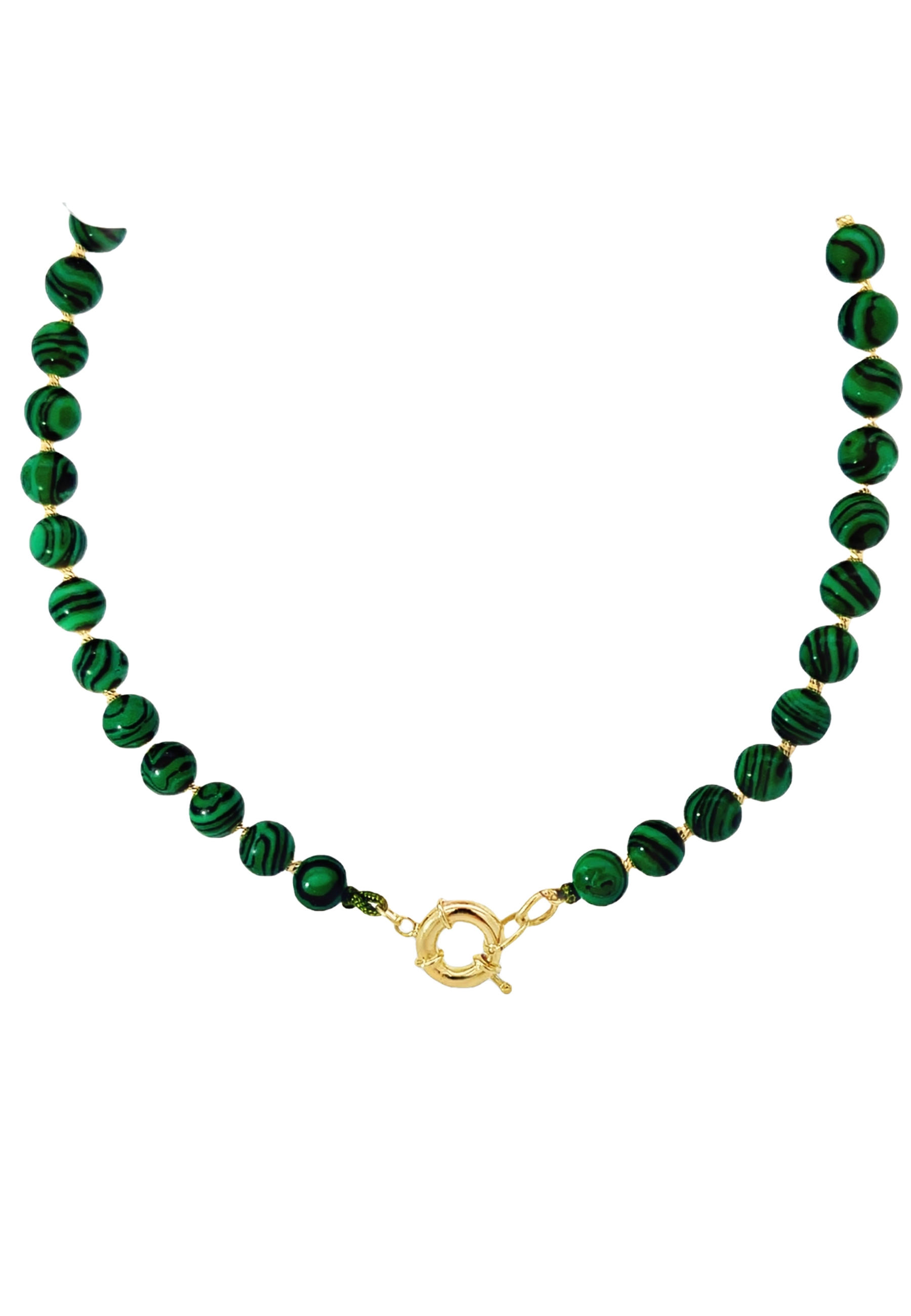 Indulge in luxury and embrace the beauty of nature with our 18KT Gold Round Pendant and Malachite Stone Chain, crafted to elevate your everyday style.