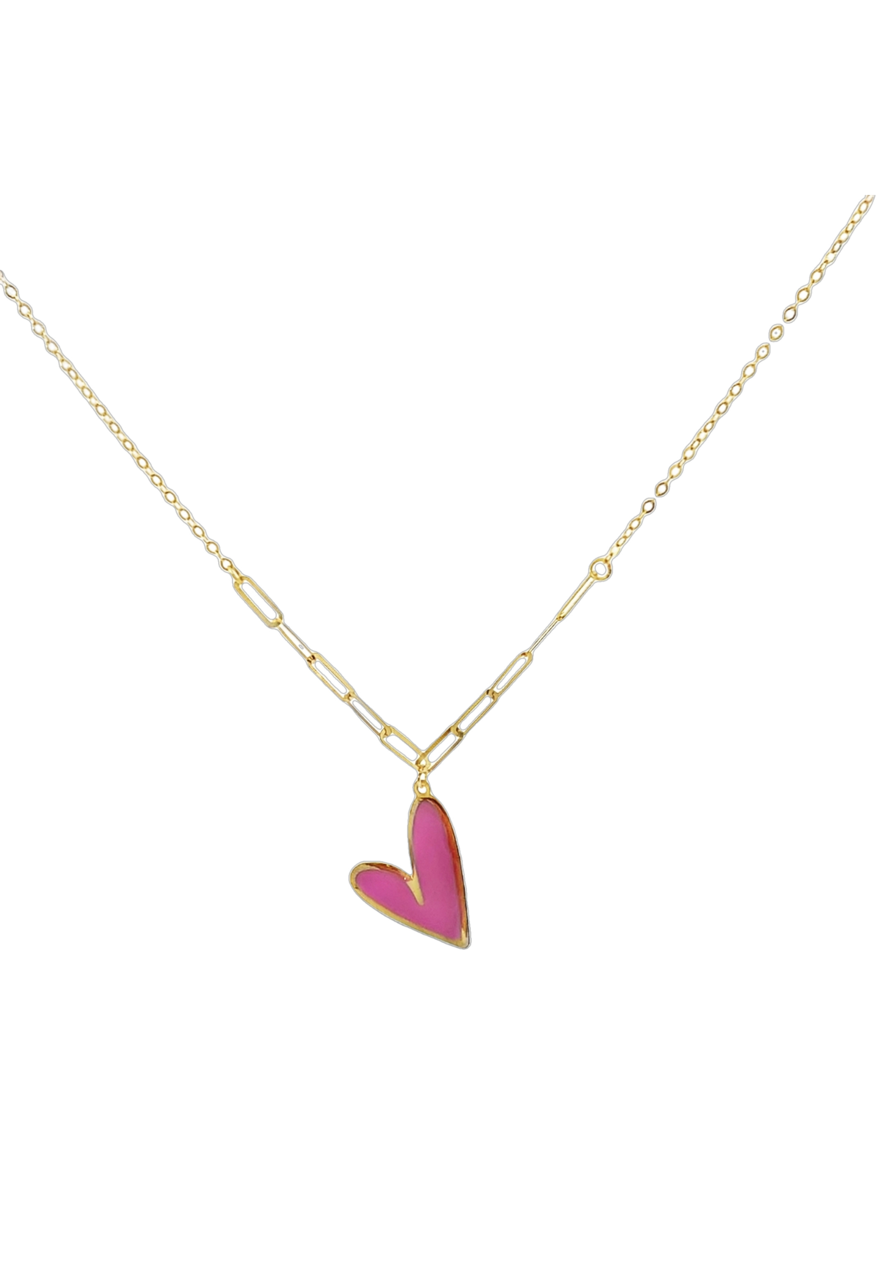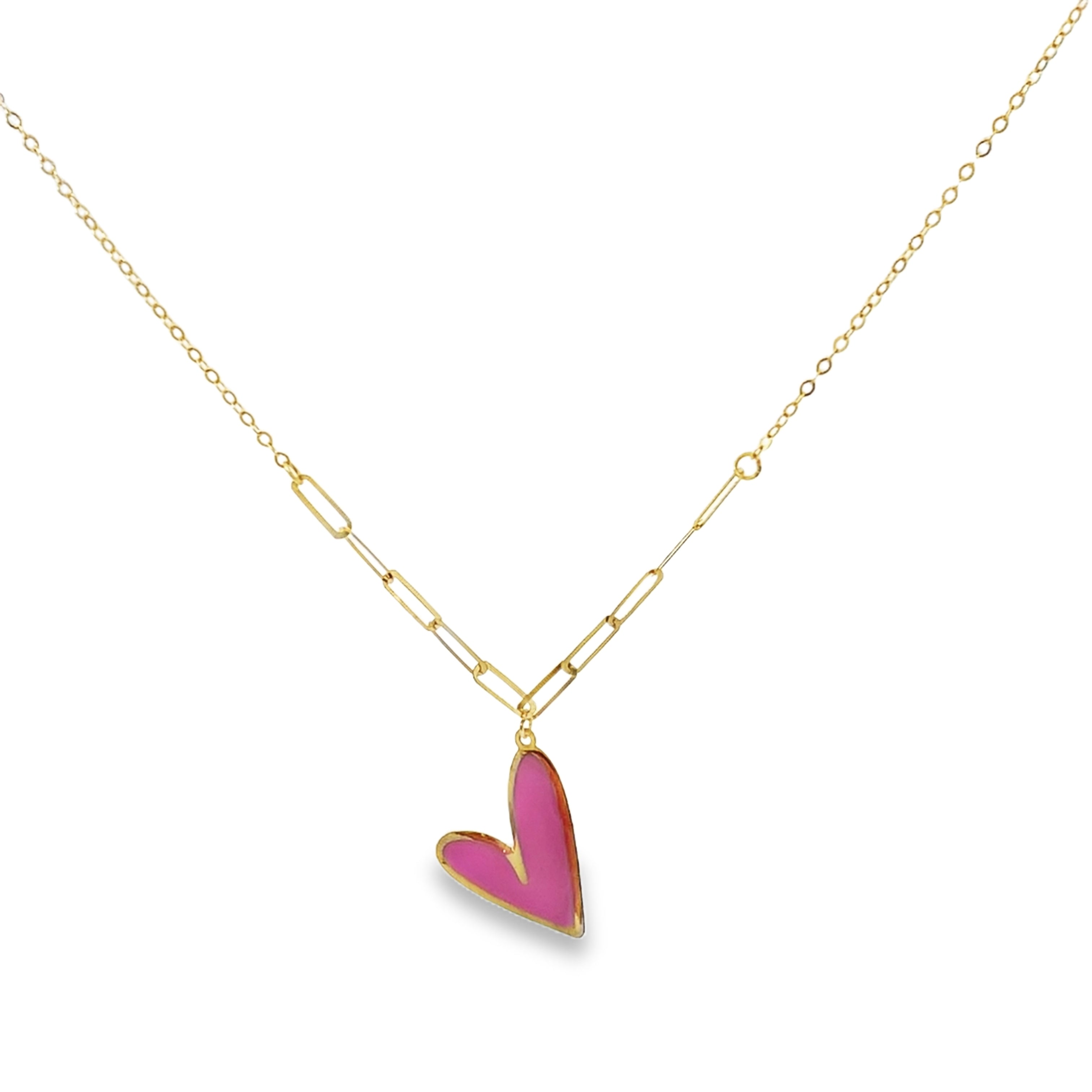 The 18KT Gold Pink Enamel Heart Necklace features a charming heart-shaped pendant crafted in 18KT Gold with a vibrant pink enamel finish. This delicate and playful piece adds a touch of romance and elegance to any look.