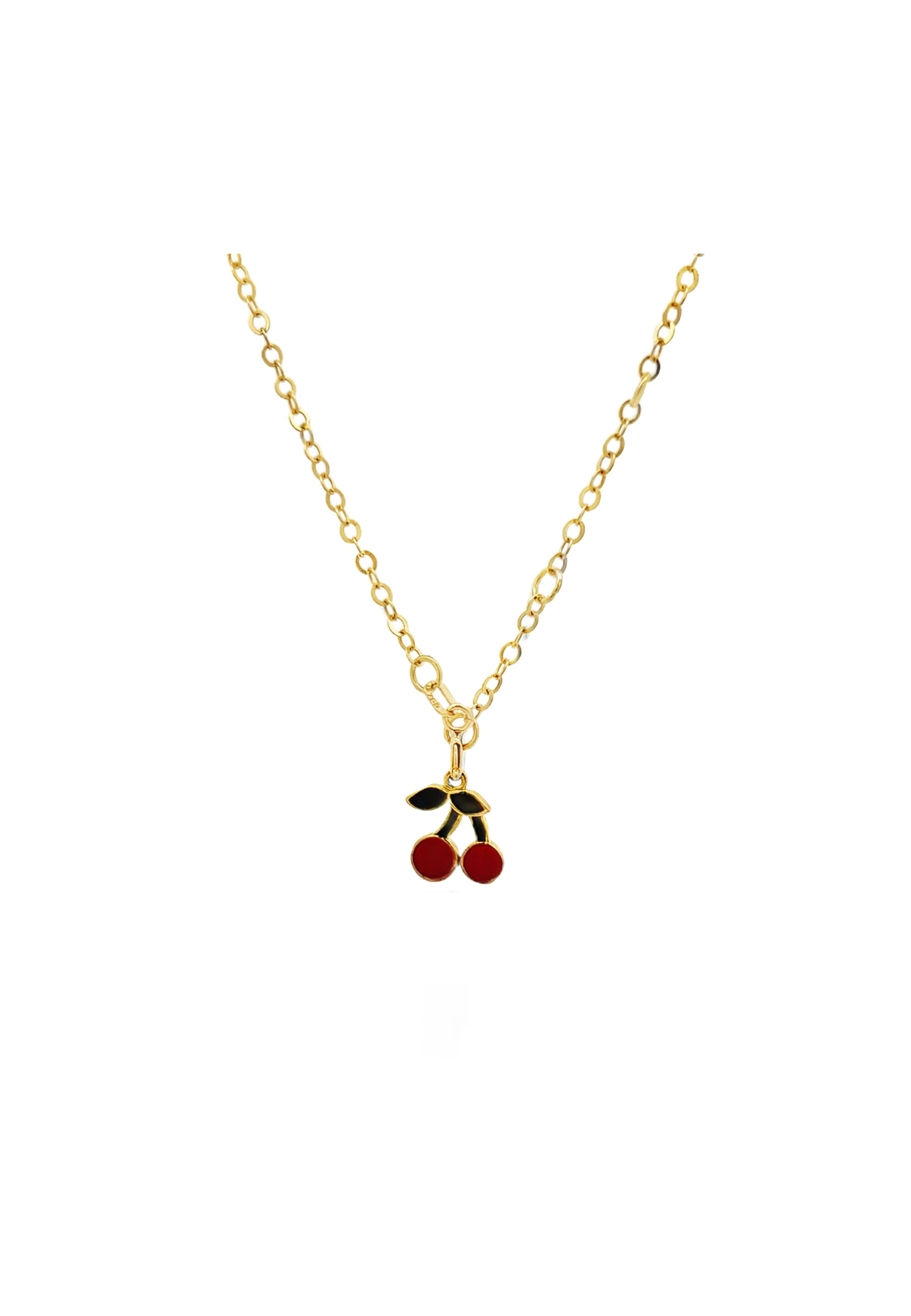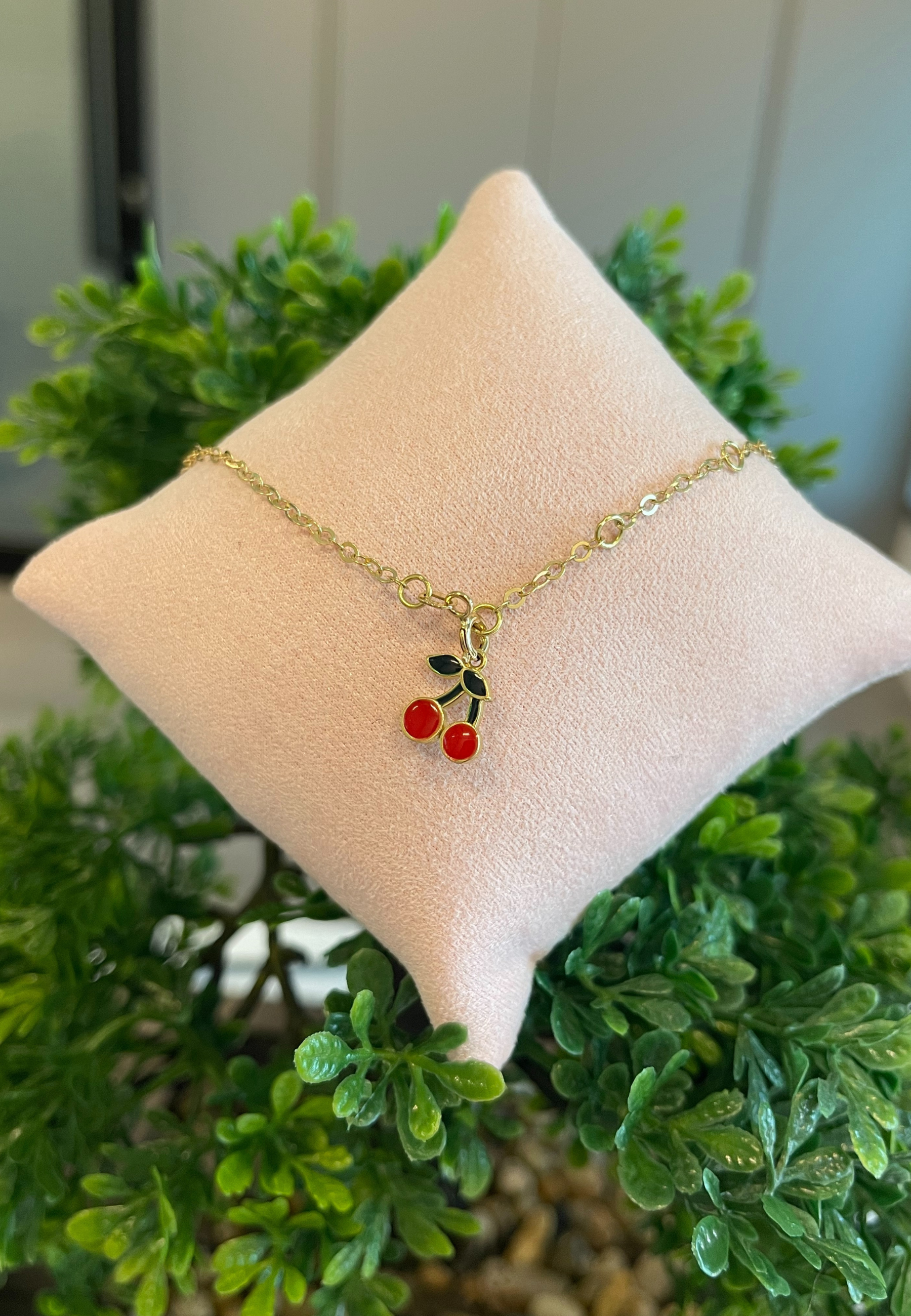 This 18KT gold anklet features playful cherry charms accented with vibrant enamel, adding a sweet and colorful touch to your look. A fun and stylish accessory perfect for everyday wear or summer vibes.