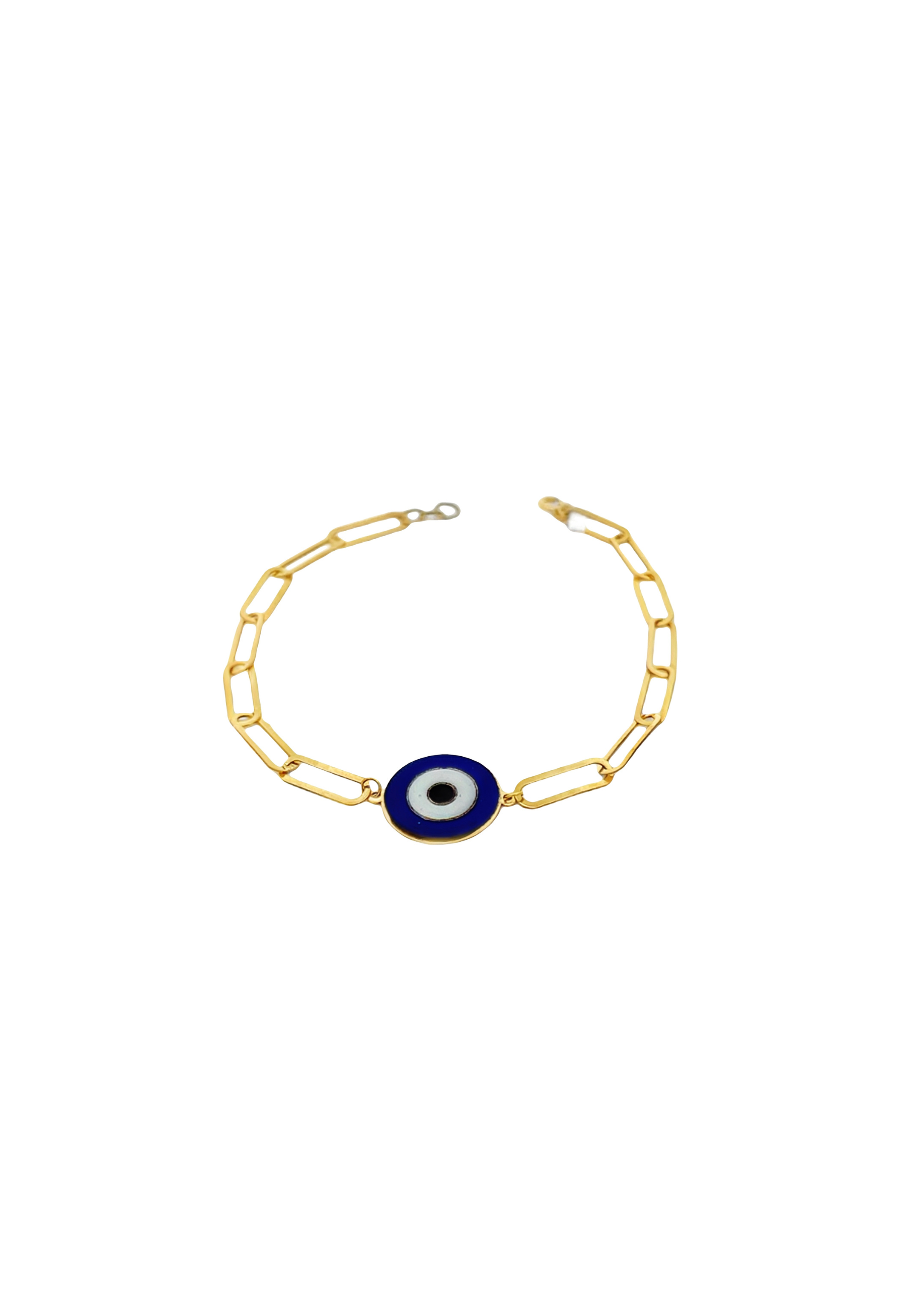 Crafted with meticulous attention to detail, this bracelet with 18KT Gold blends timeless elegance with symbolic meaning, offering both fashion and protection. The sturdy paperclip chain adds a contemporary touch, ensuring durability and everyday wearability.