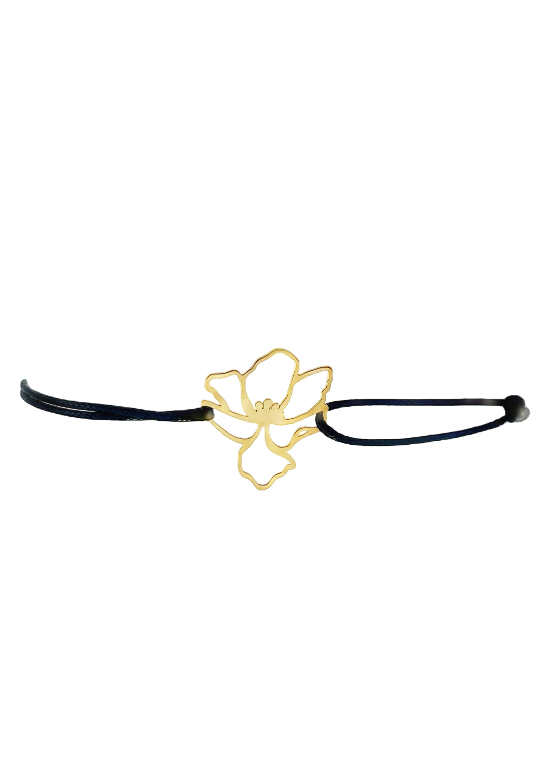 The 18KT Gold Flower with Black Thread Bracelet features a delicate gold flower charm on a sleek black thread, combining elegance with a modern, minimalistic touch. Perfect for layering or everyday wear.