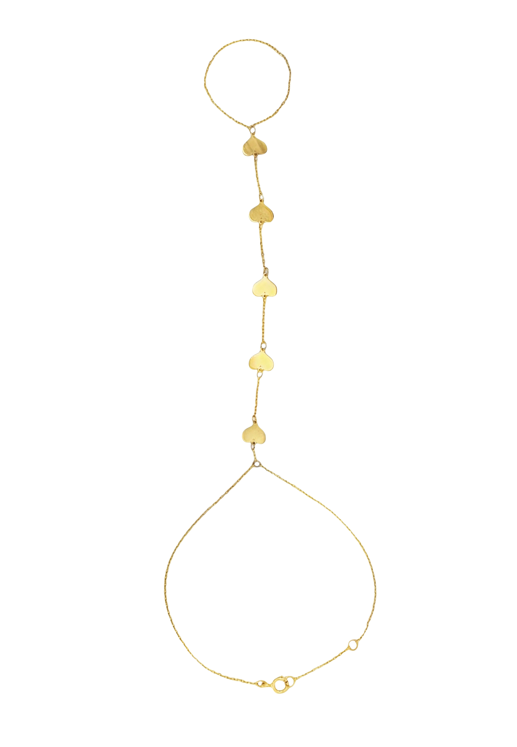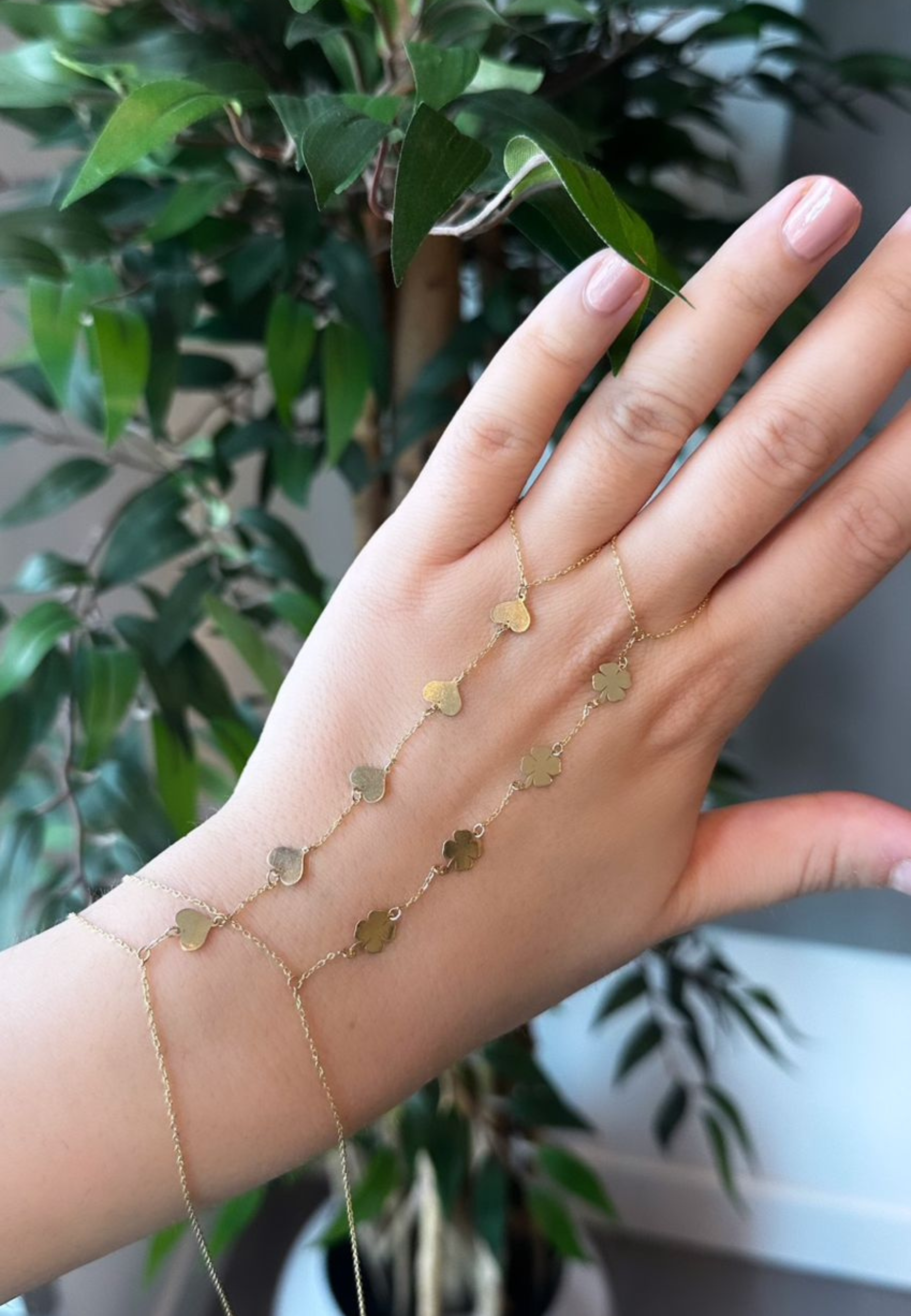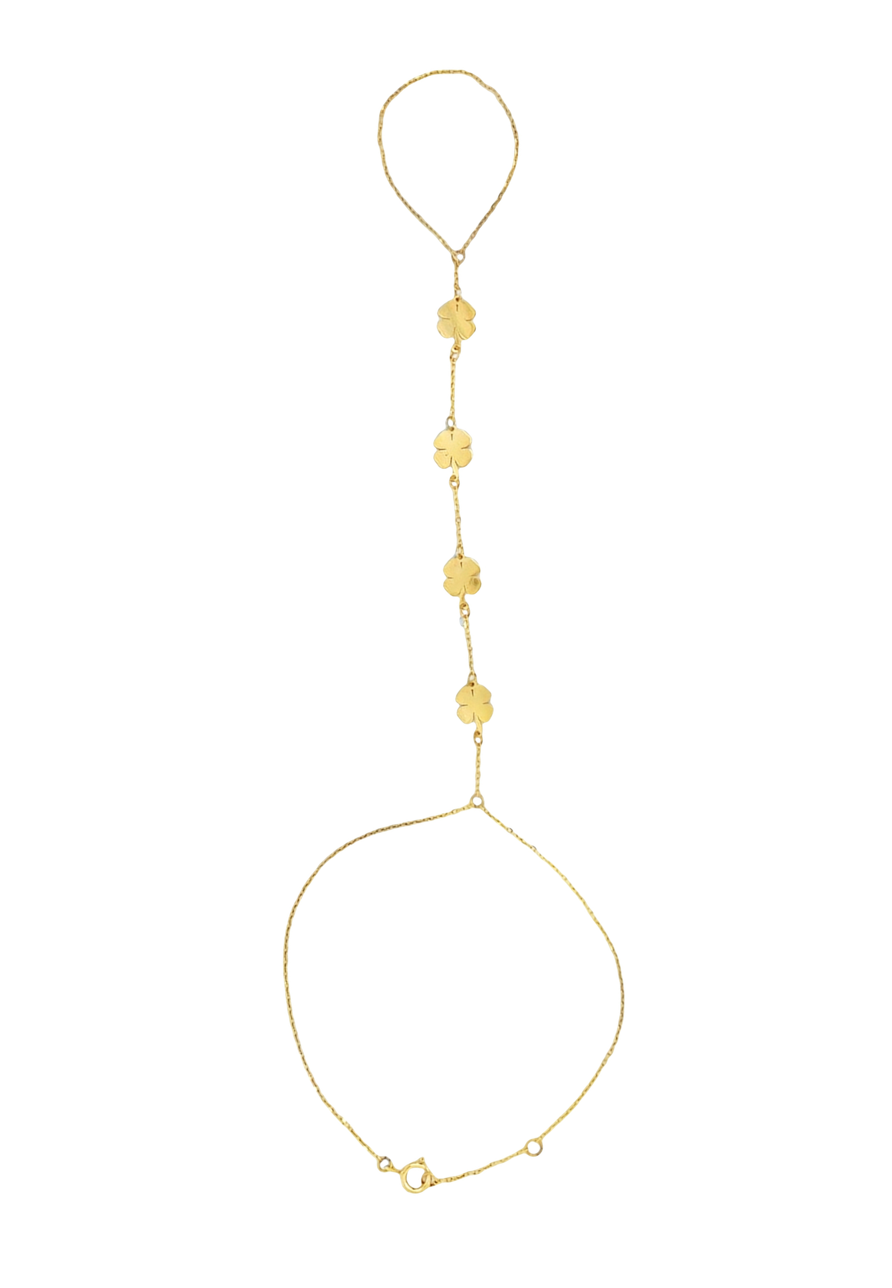 18KT Gold Hand Chain with Heart and Clover Accents