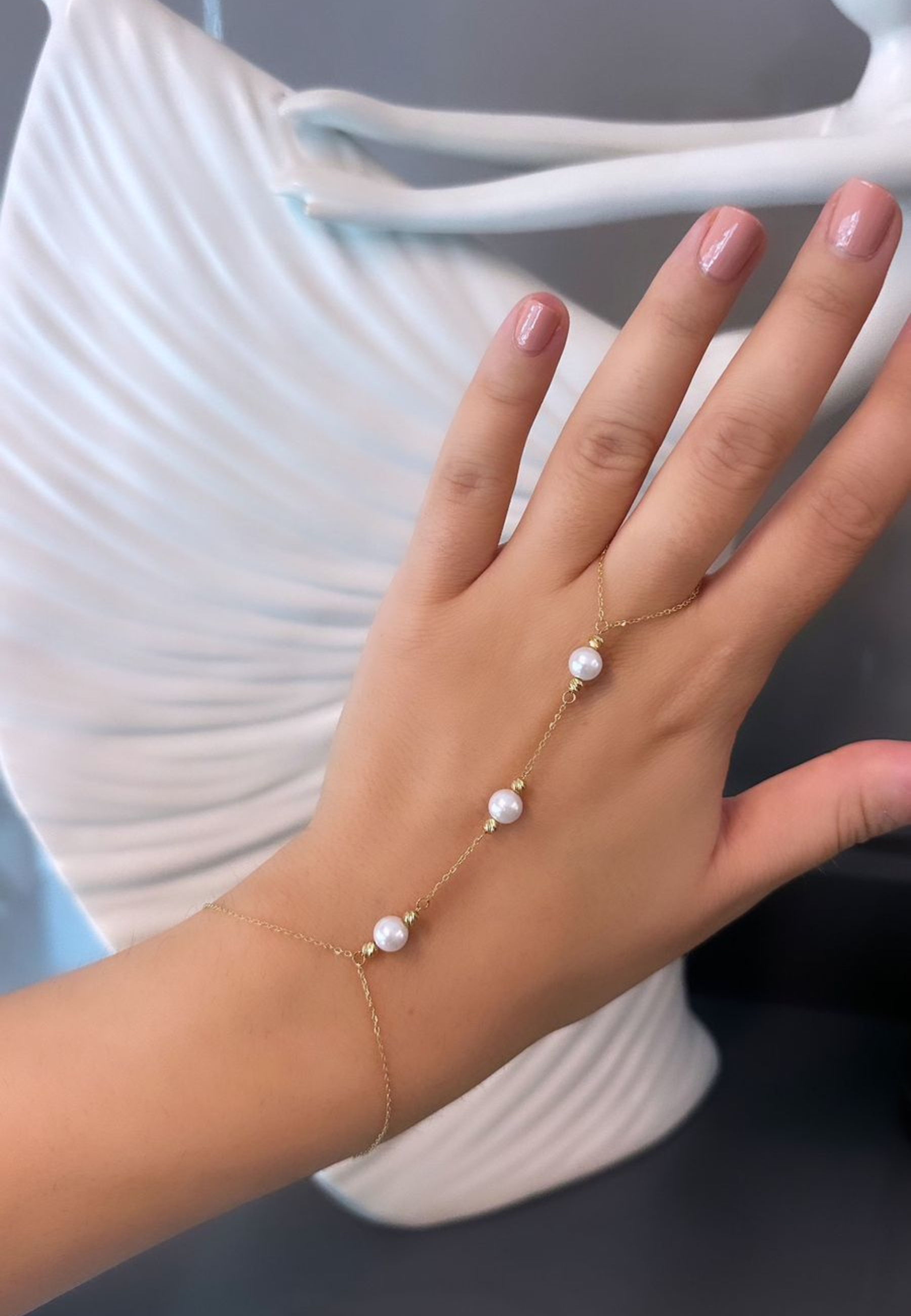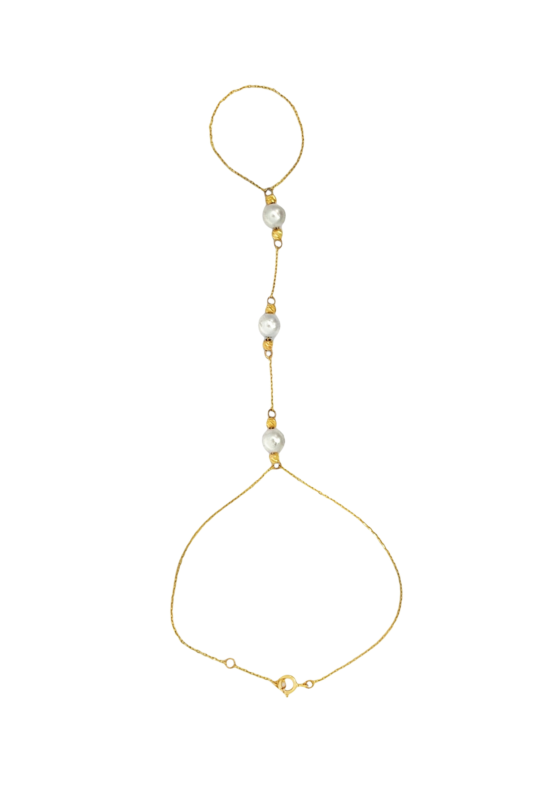 The 18KT Gold Planted Pearls Hand Chain features delicate pearls artfully placed along a graceful gold chain that connects the wrist to the finger. Crafted in luxurious 18KT Gold, this elegant piece blends timeless sophistication with modern style.