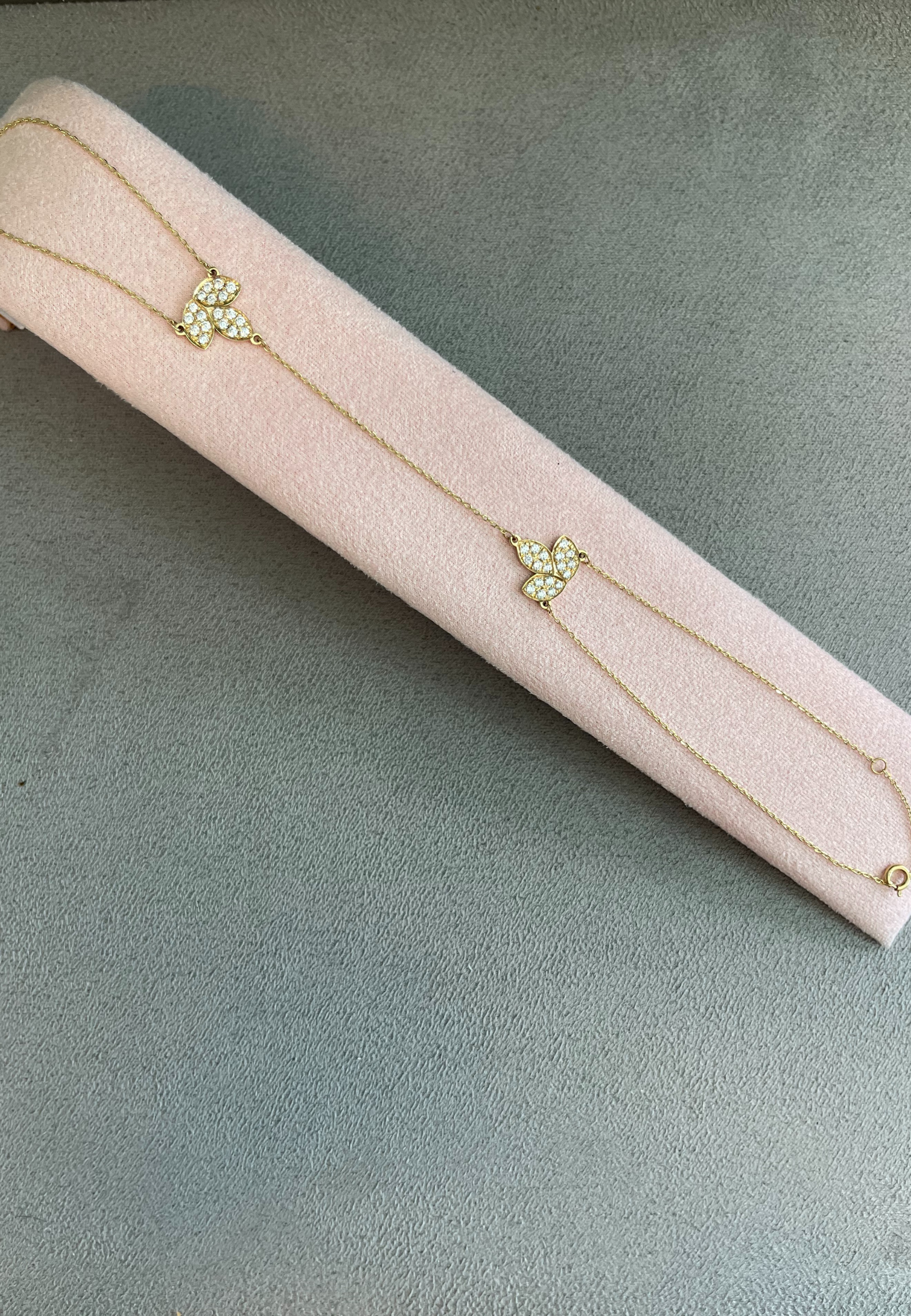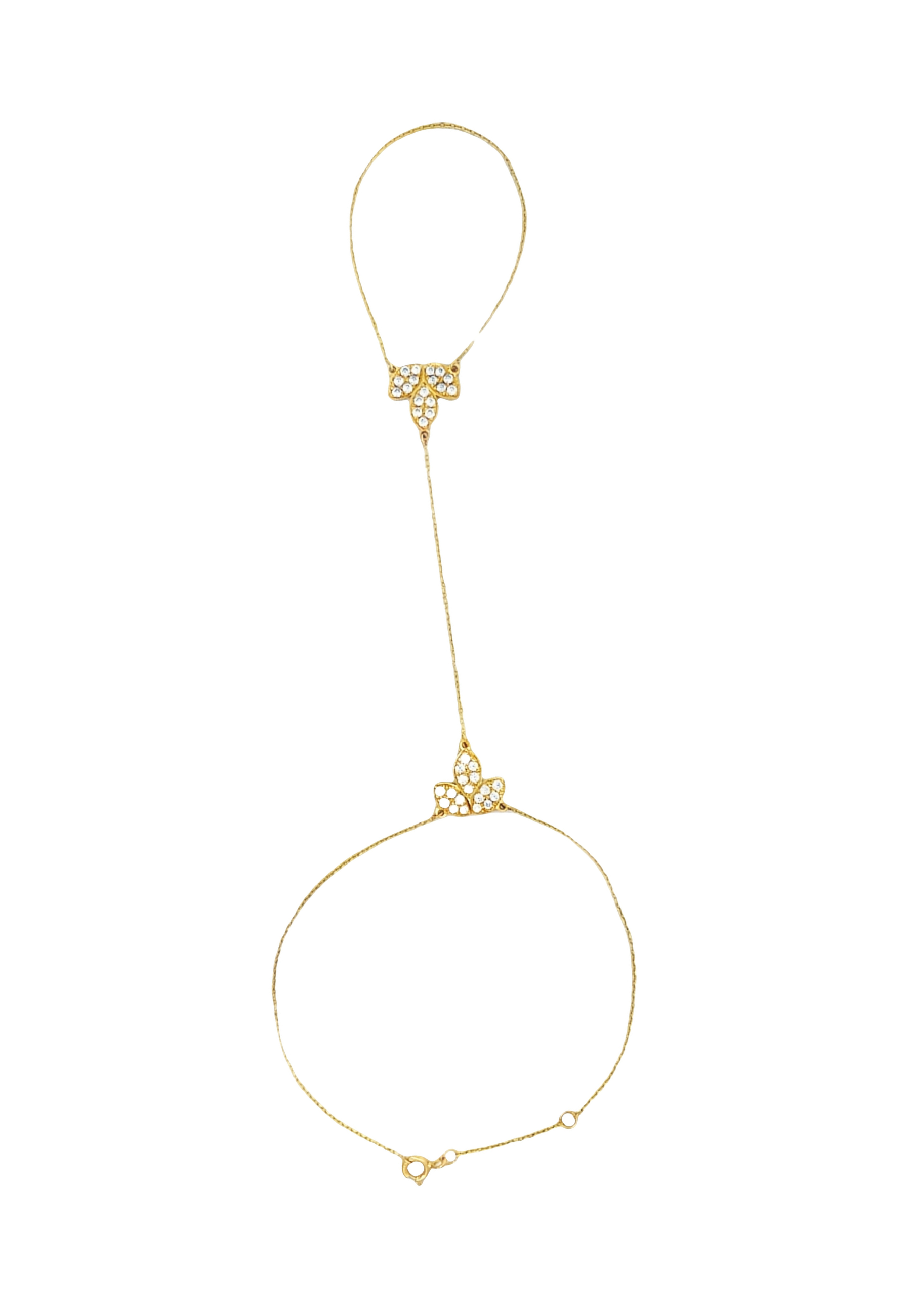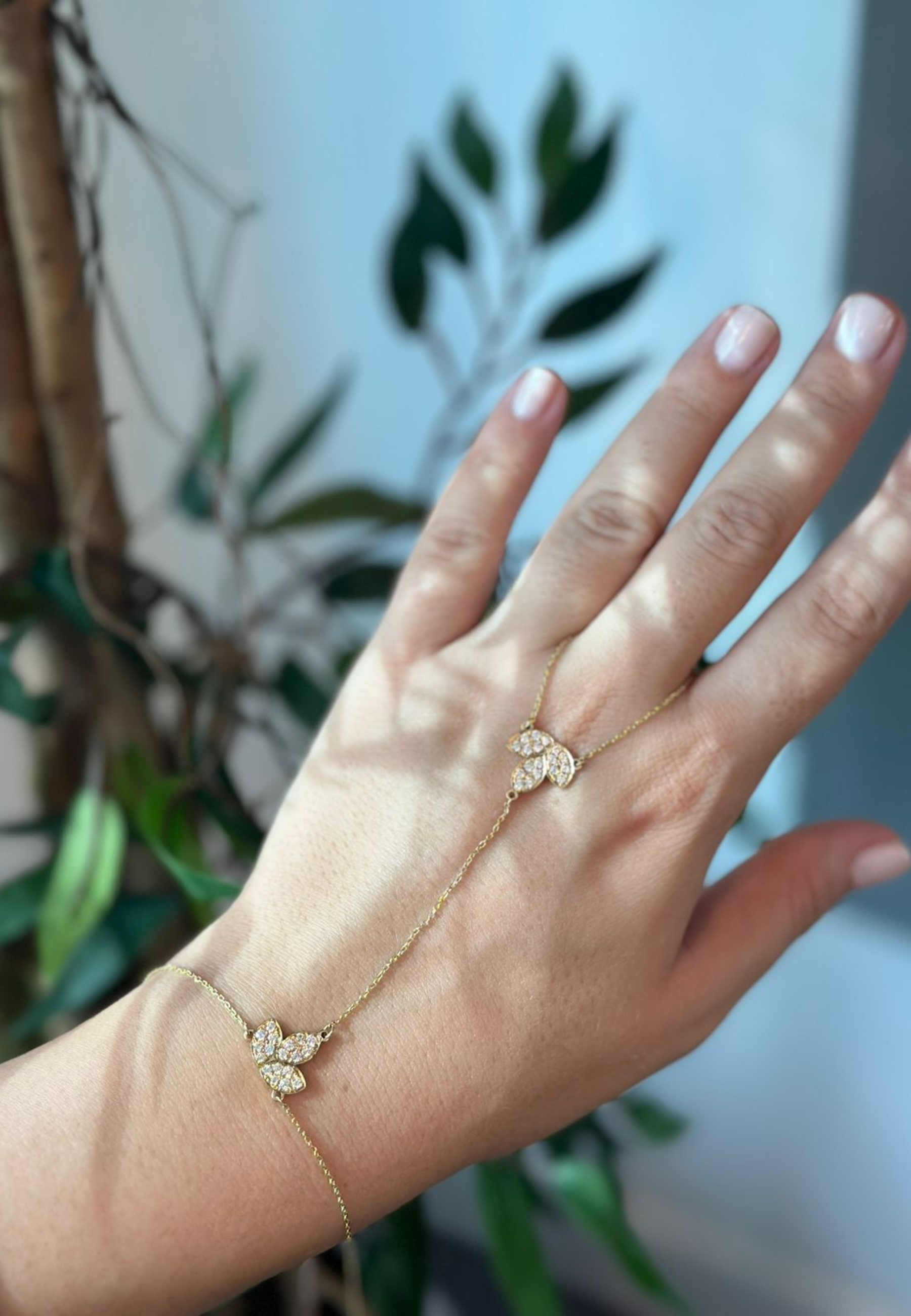 This 18KT gold hand chain features delicate leaf motifs accented with sparkling zircon stones, blending nature-inspired elegance with refined sparkle. A graceful accessory perfect for adding subtle sophistication to any look.