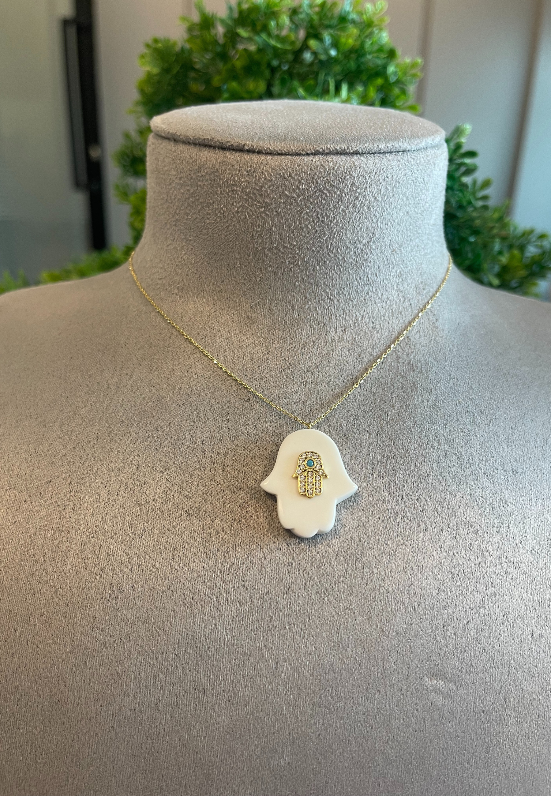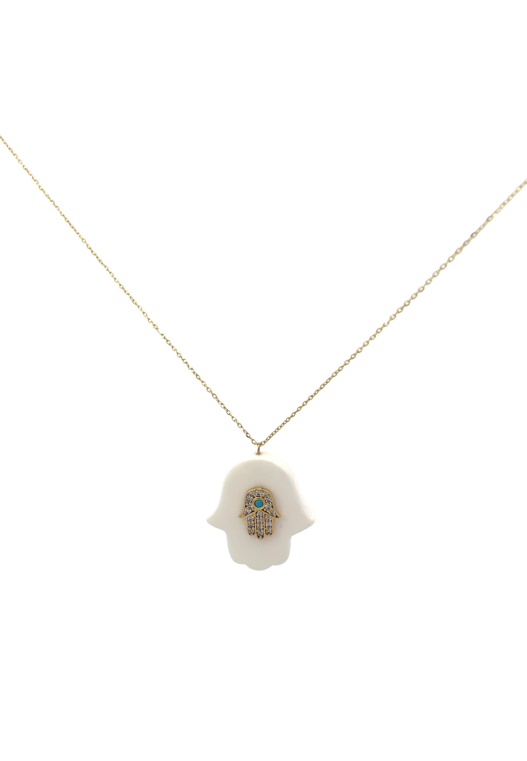 Discover divine protection and elegance with our 18KT Gold Necklace, featuring a white Hamza hand adorned with a sparkling zircon Hamza hand at its center. Crafted with meticulous attention to detail and premium materials, this necklace blends cultural symbolism with luxurious aesthetics.