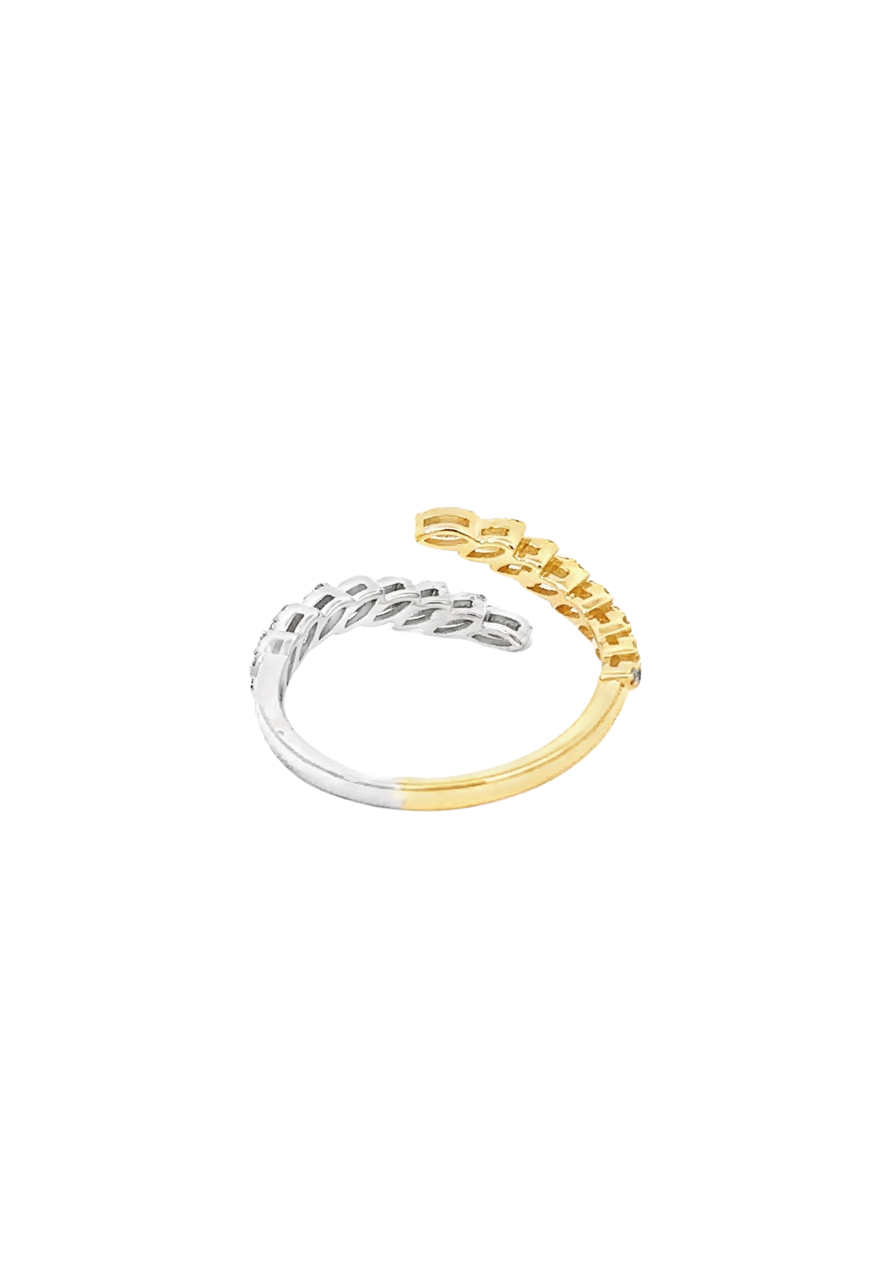 Nestled within a meticulously crafted two-tone 18KT Gold band, this diamond is encased in a harmonious fusion of premium metals. The interplay of contrasting tones enriches the diamond's brilliance, imbuing the ring with a captivating allure and contemporary charm.