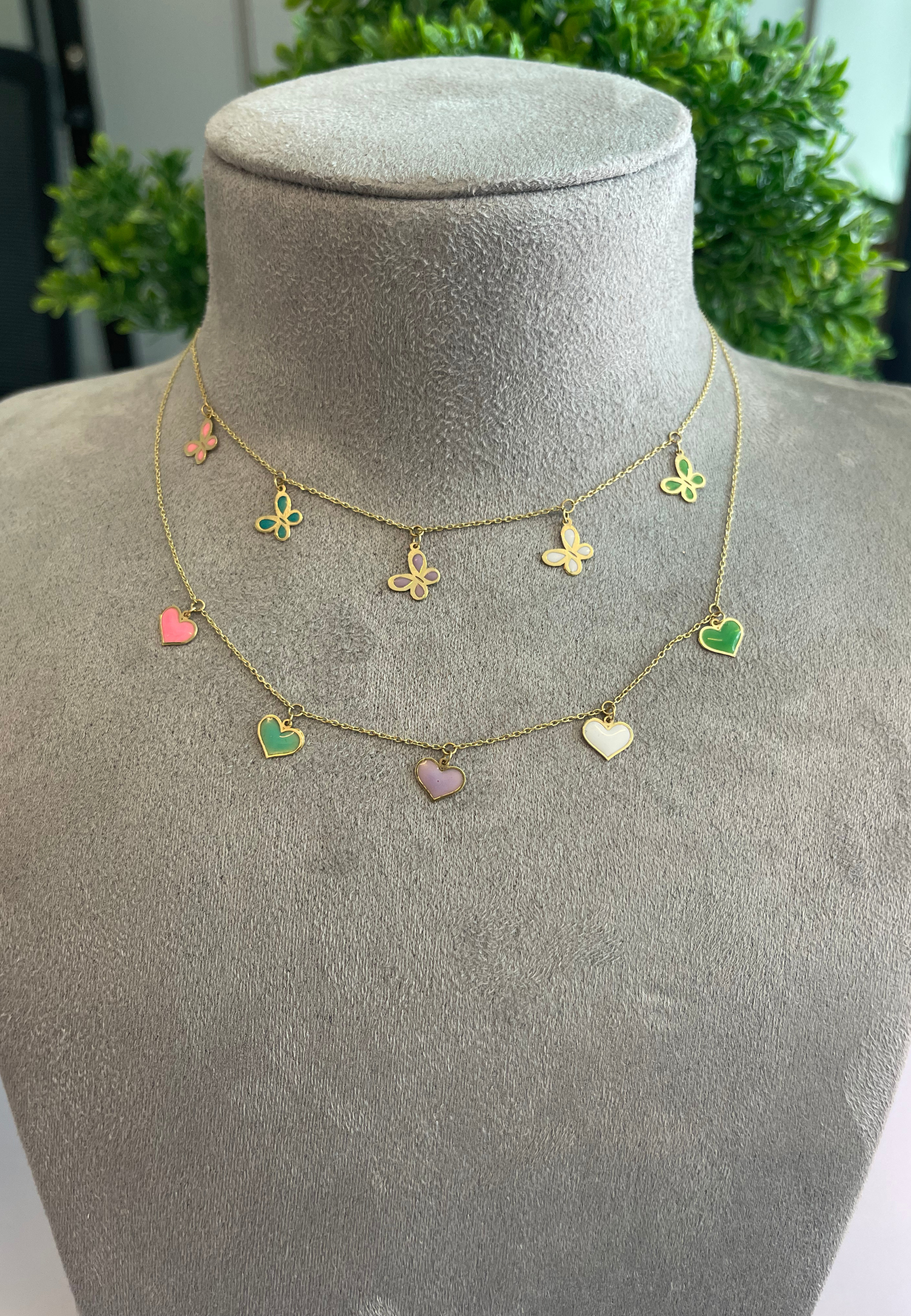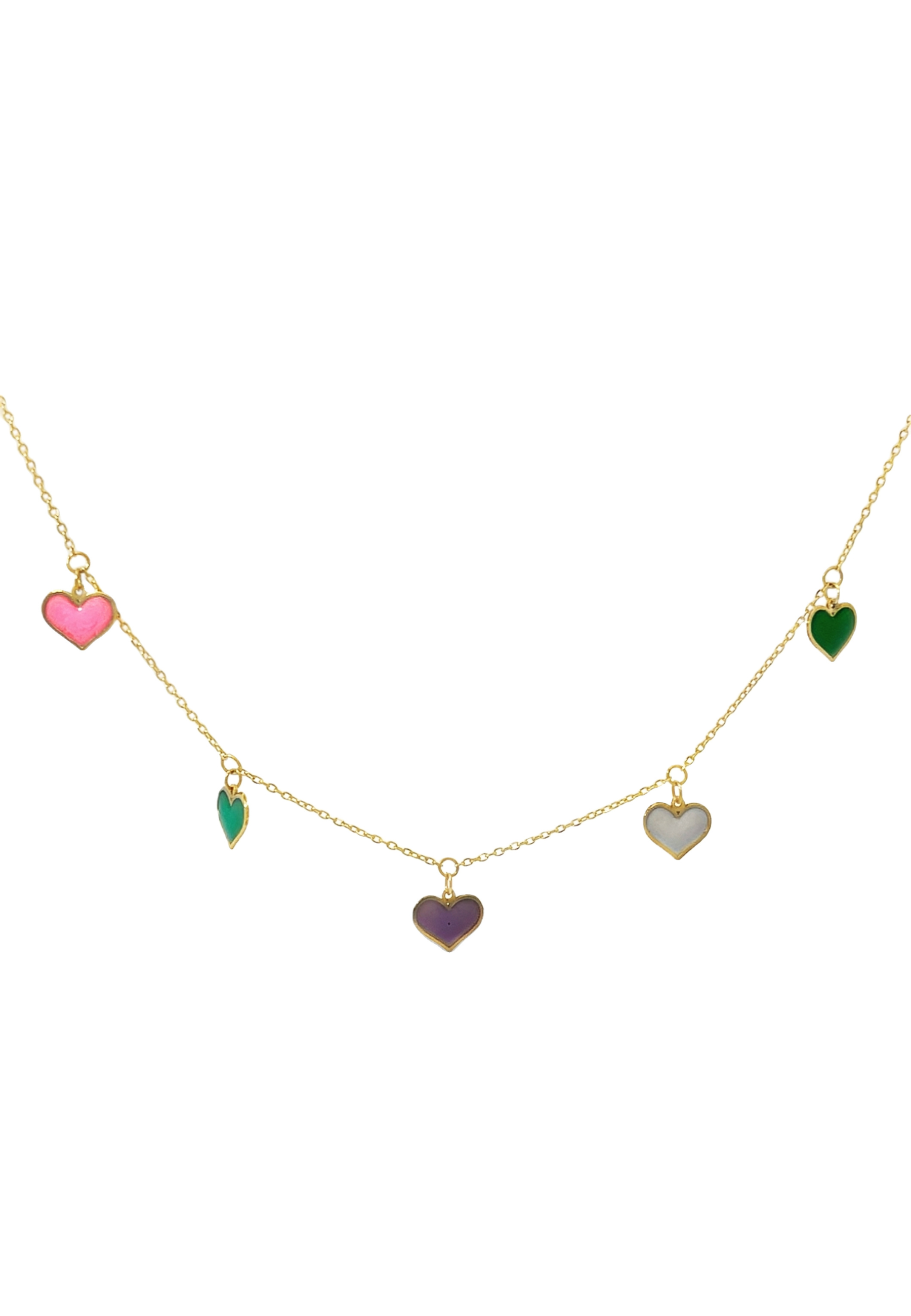 The 18KT Gold Colorful Hearts Enamel Necklace features a series of vibrant enamel heart charms set in 18KT Gold. Playful and elegant, this piece adds a cheerful pop of color and love to any look.