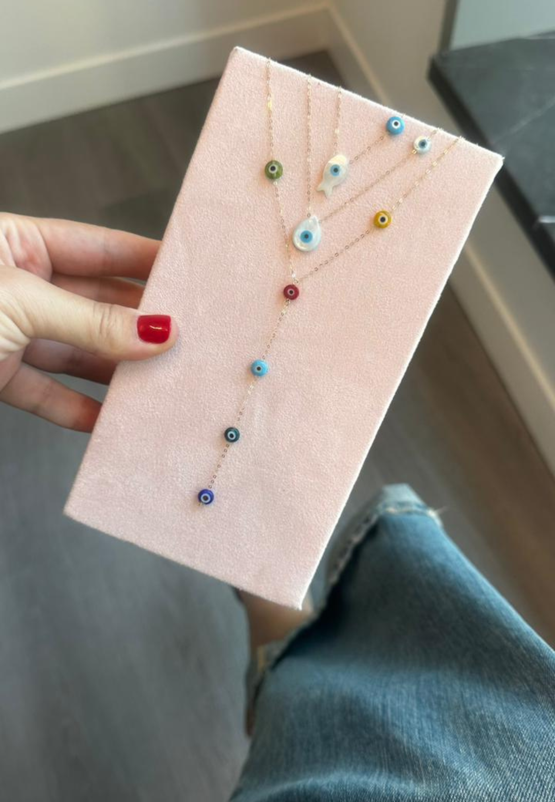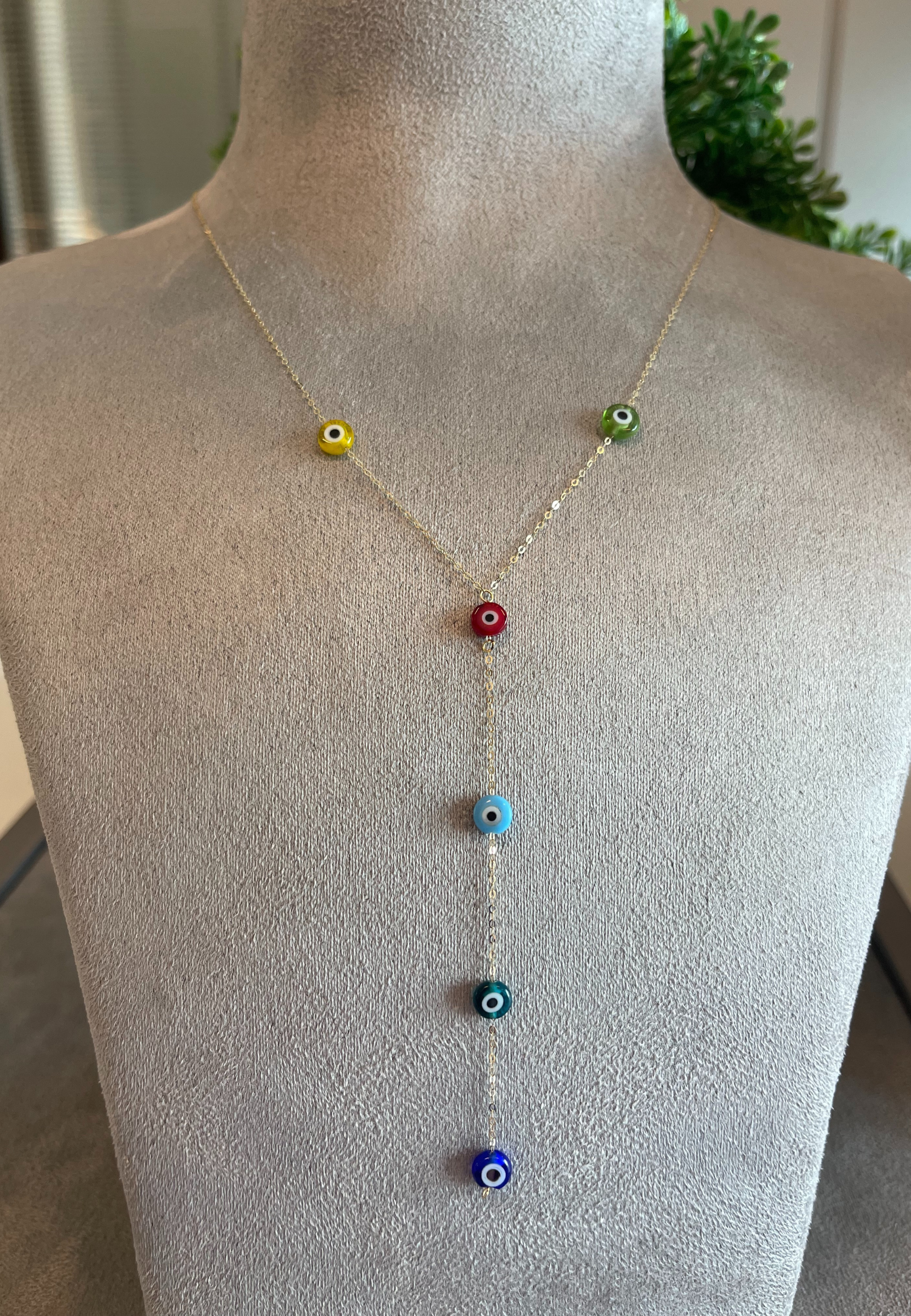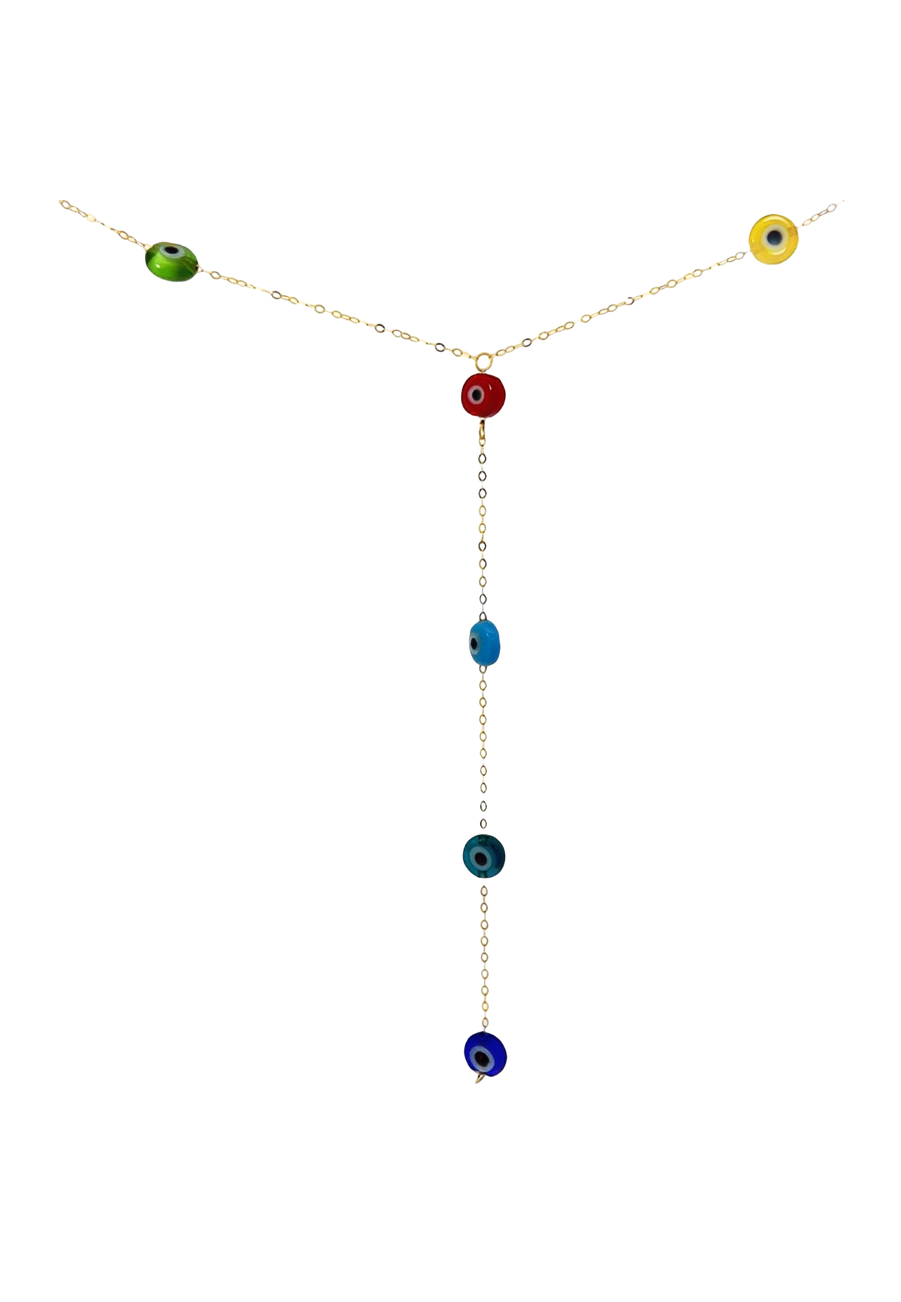 This 18KT gold necklace features playful drop charms with colorful resin eyes, symbolizing protection and positivity. A vibrant and stylish piece perfect for everyday wear.