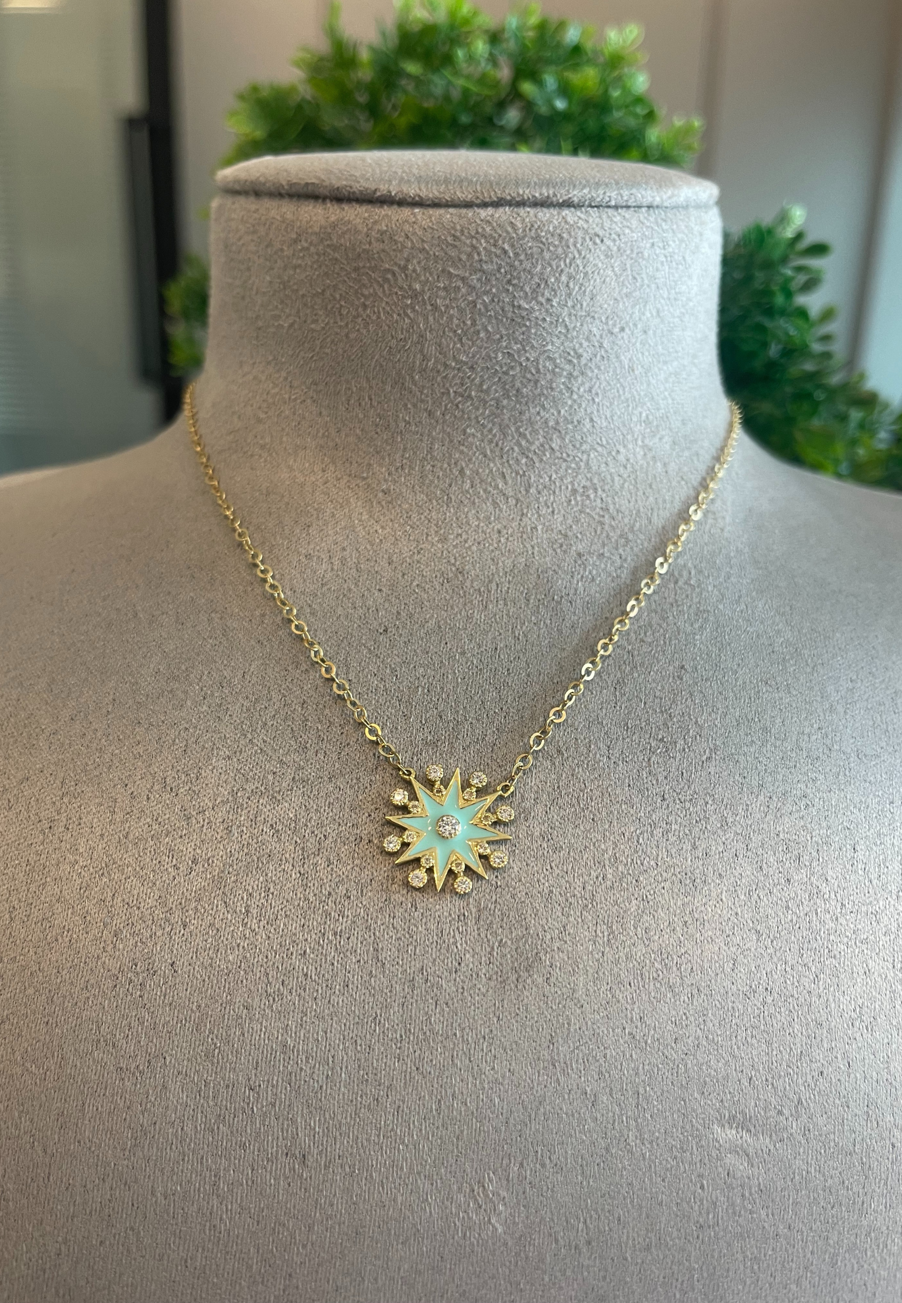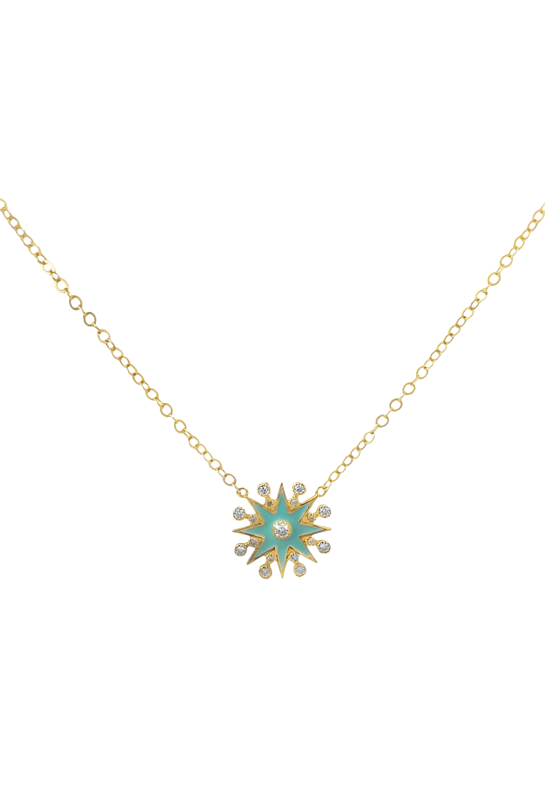 This 18KT gold necklace features a vibrant green enamel star design, beautifully accented with a sparkling zircon at its center. A radiant piece that adds a touch of color and elegance to any look.