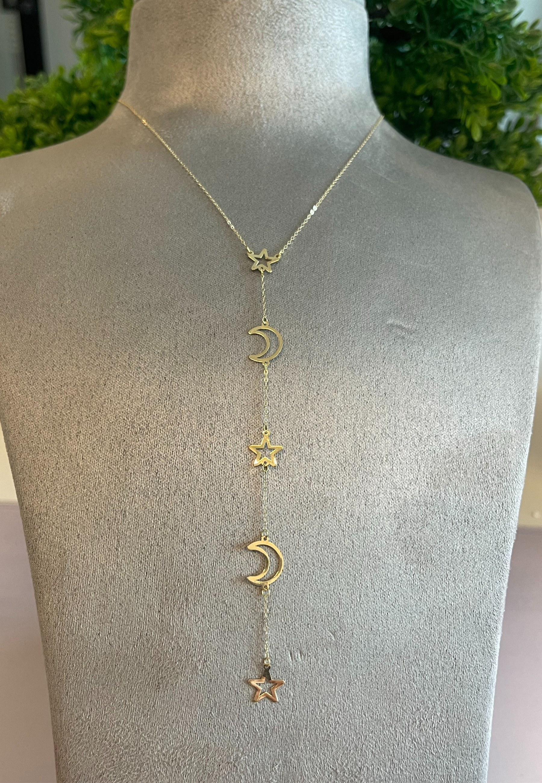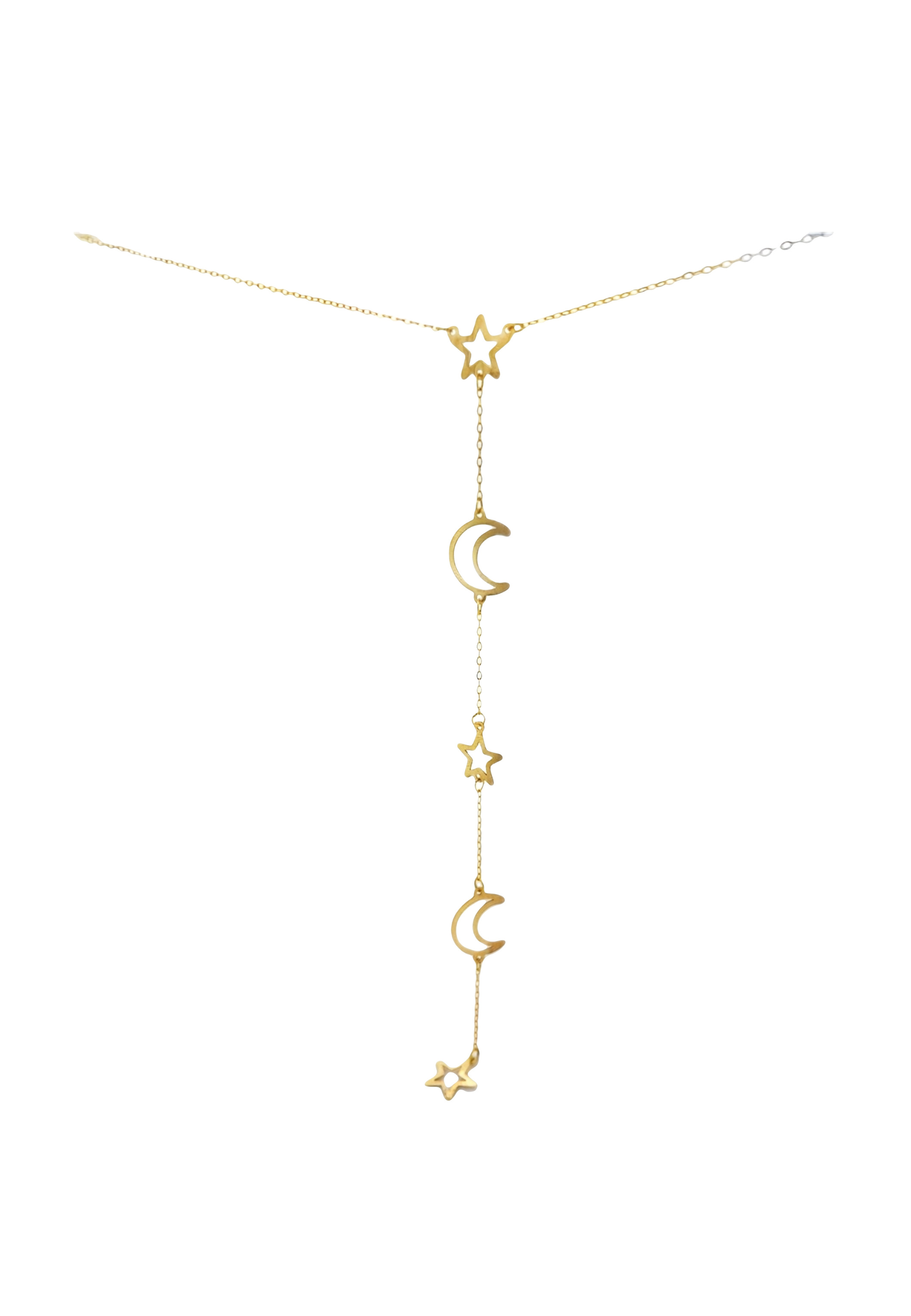 The 18KT Gold Moon and Stars Drop Necklace features a celestial-inspired design with a delicate moon and dangling stars, crafted from luxurious 18KT Gold. This enchanting piece adds a touch of elegance and cosmic charm to any look.