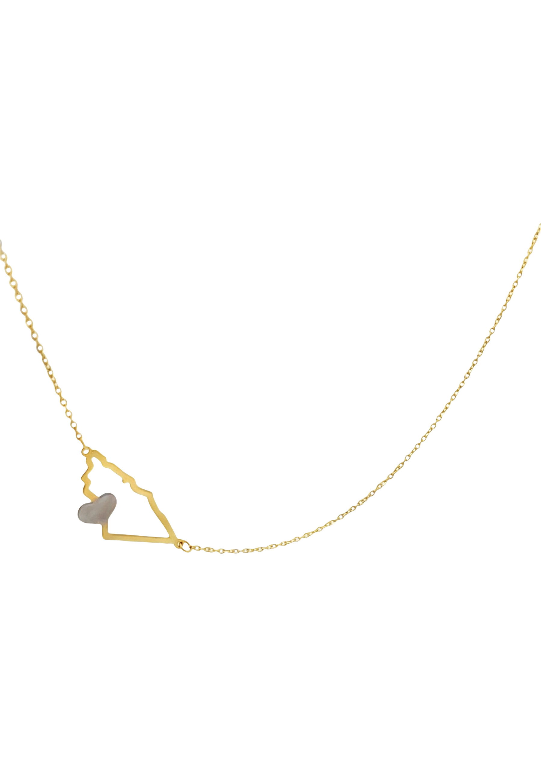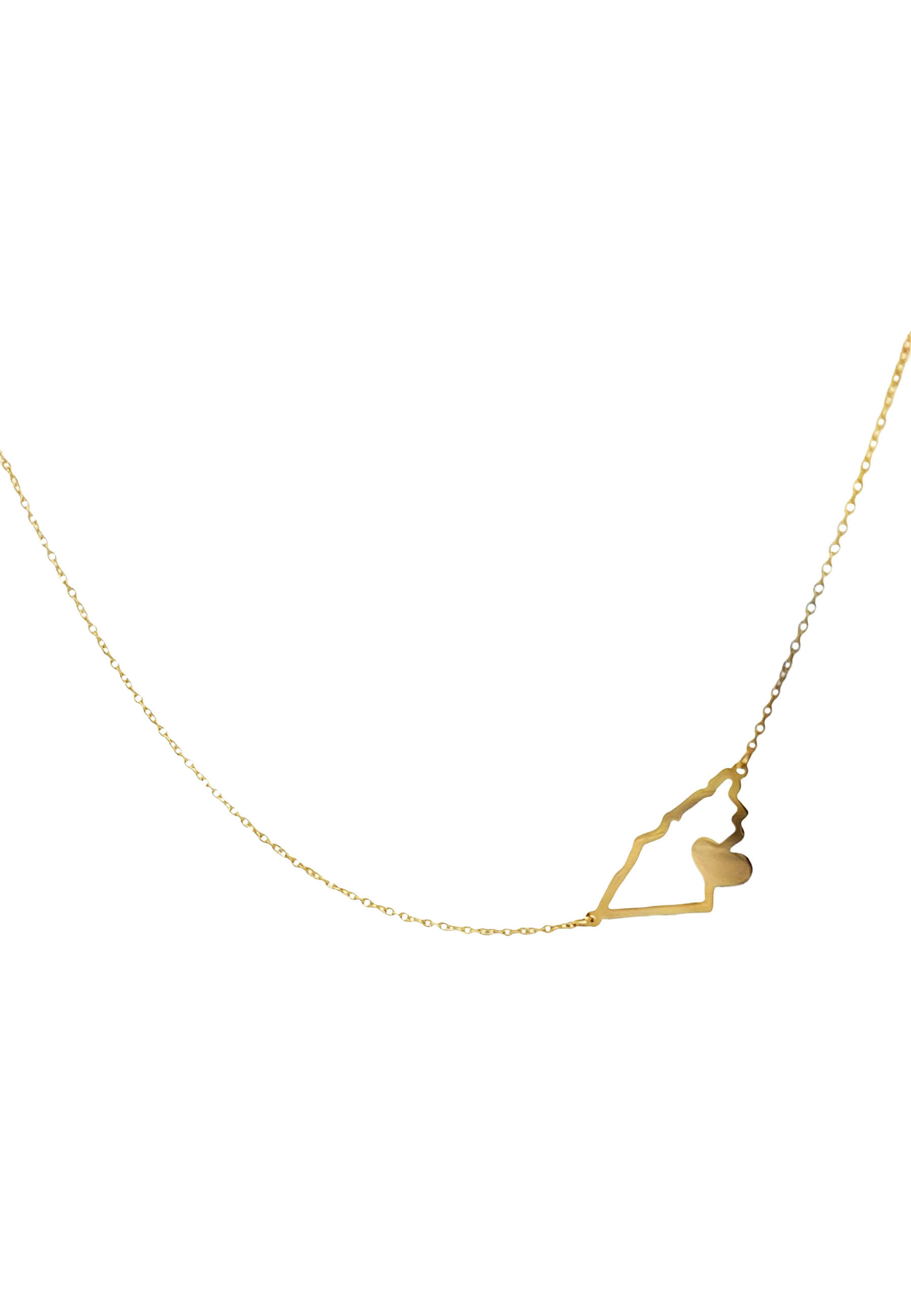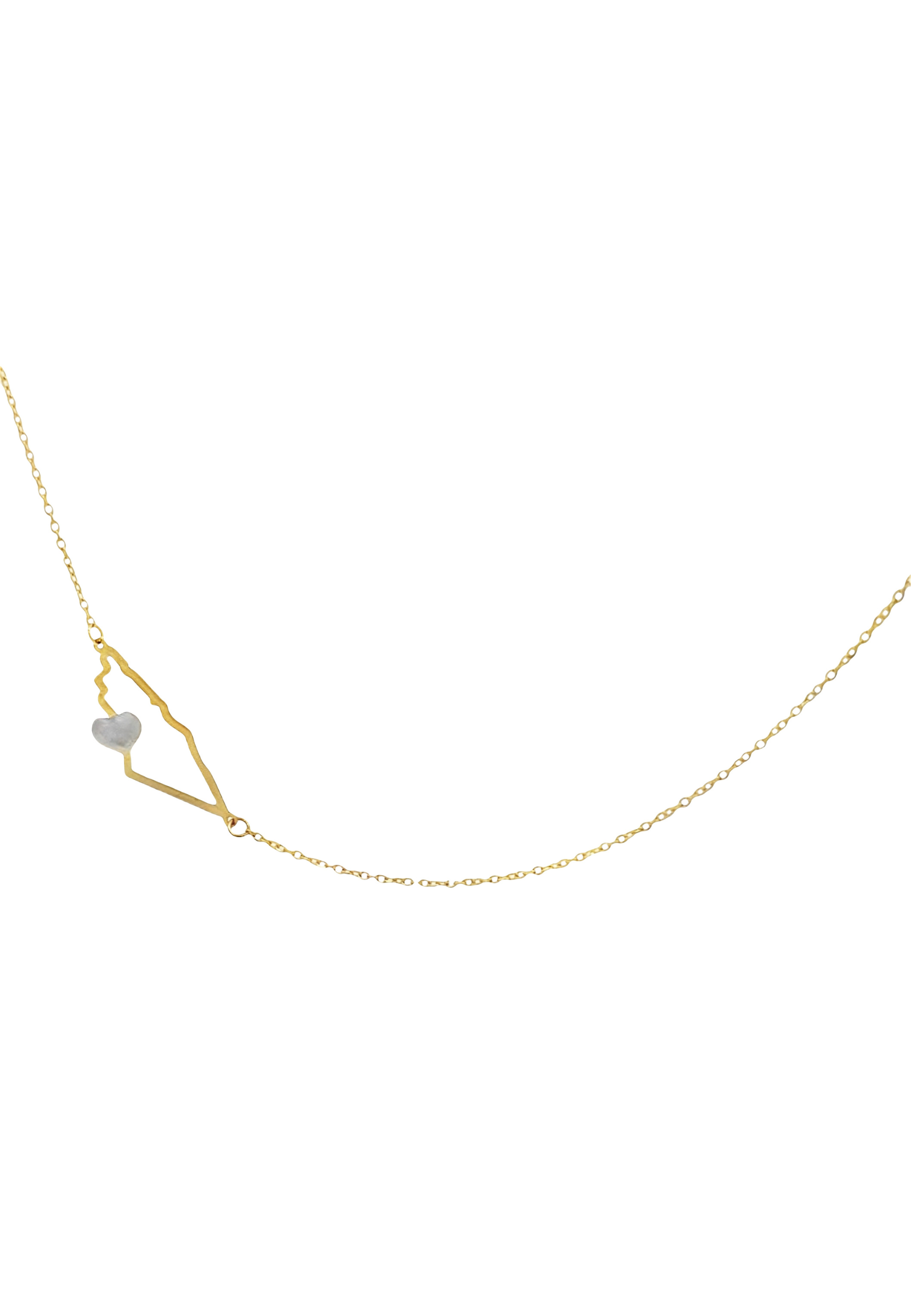 The 18KT Gold Palestine Map with Heart Necklace features a finely detailed map of Palestine accented with a heart motif, all crafted in 18KT Gold. This elegant piece symbolizes love, heritage, and cultural pride.