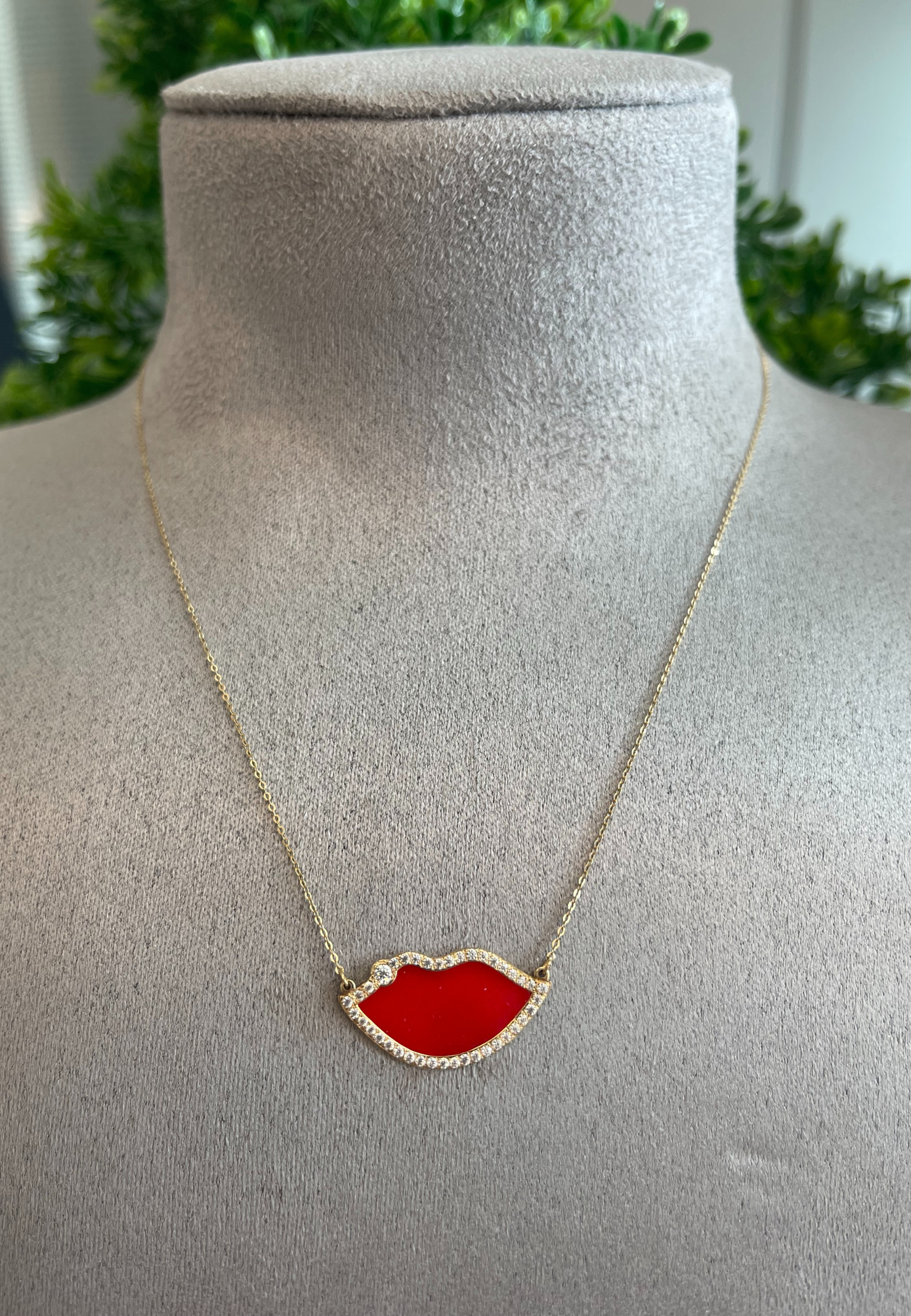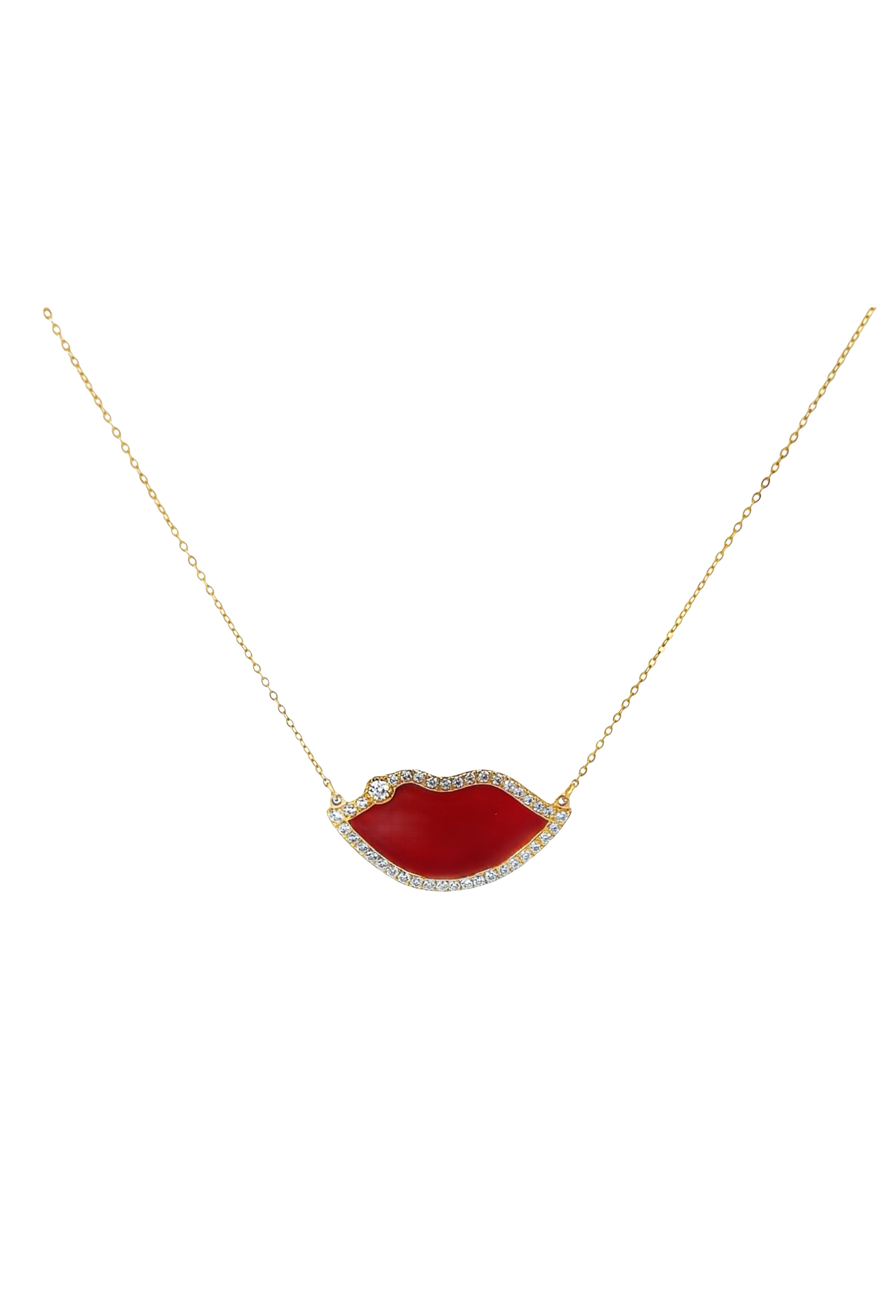 This 18KT gold piece features striking red enamel lips accented with sparkling zircon, blending playful allure with elegant sparkle. A bold and stylish accessory that adds a fun statement to any look.