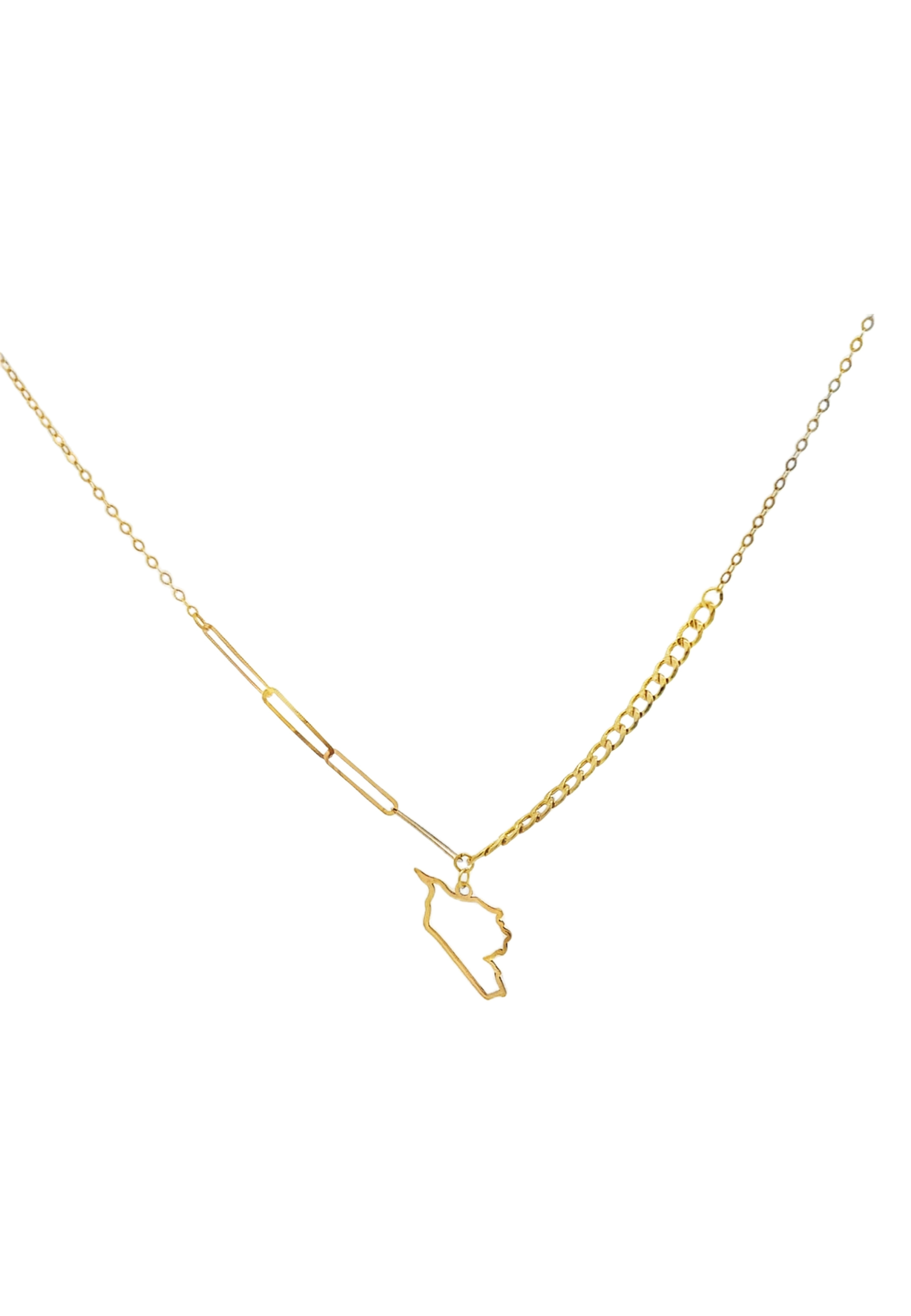 This 18KT gold necklace features a Syria map pendant paired with a mix of curb and paperclip chains, blending cultural significance with modern style. A meaningful and fashionable statement piece.