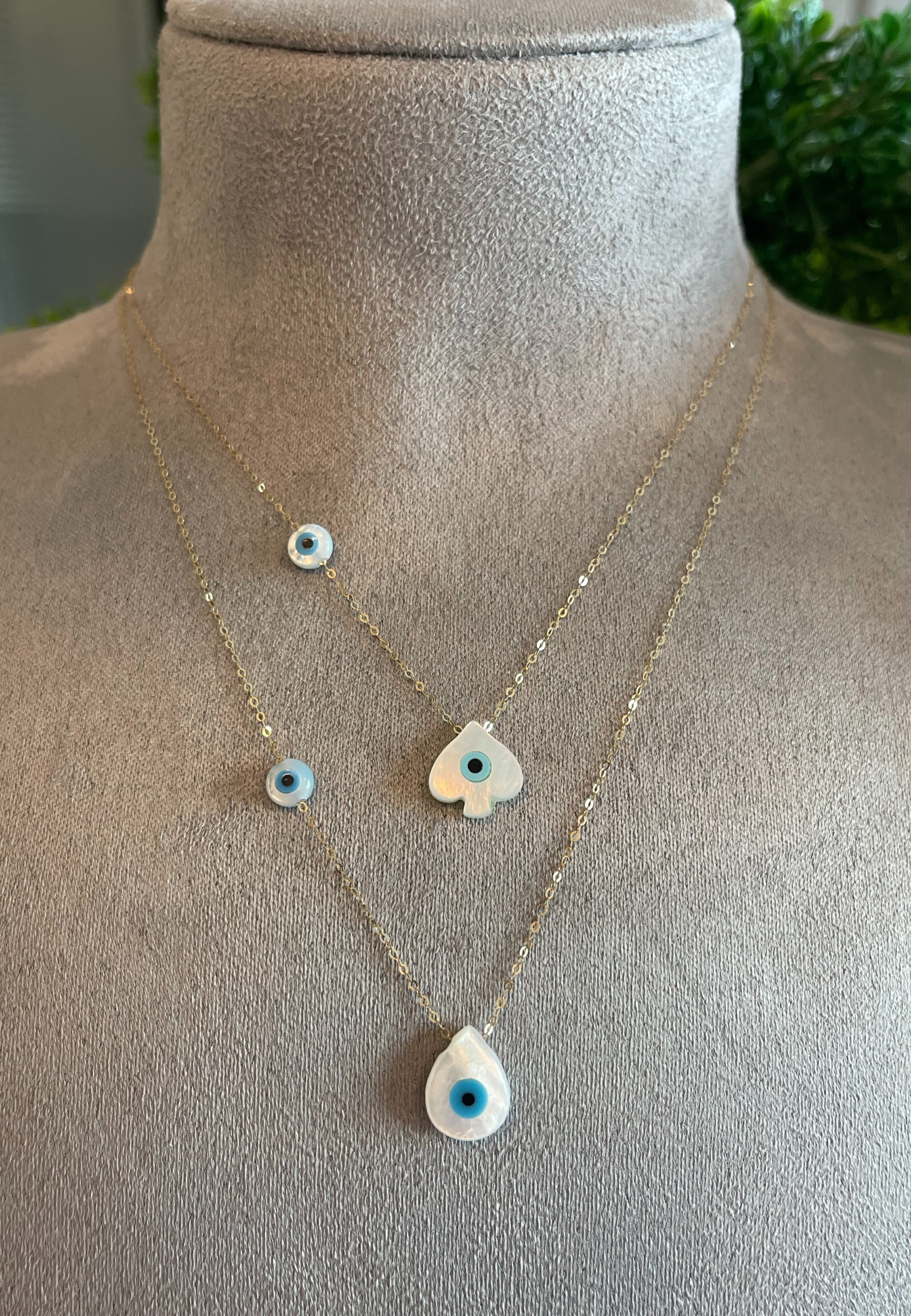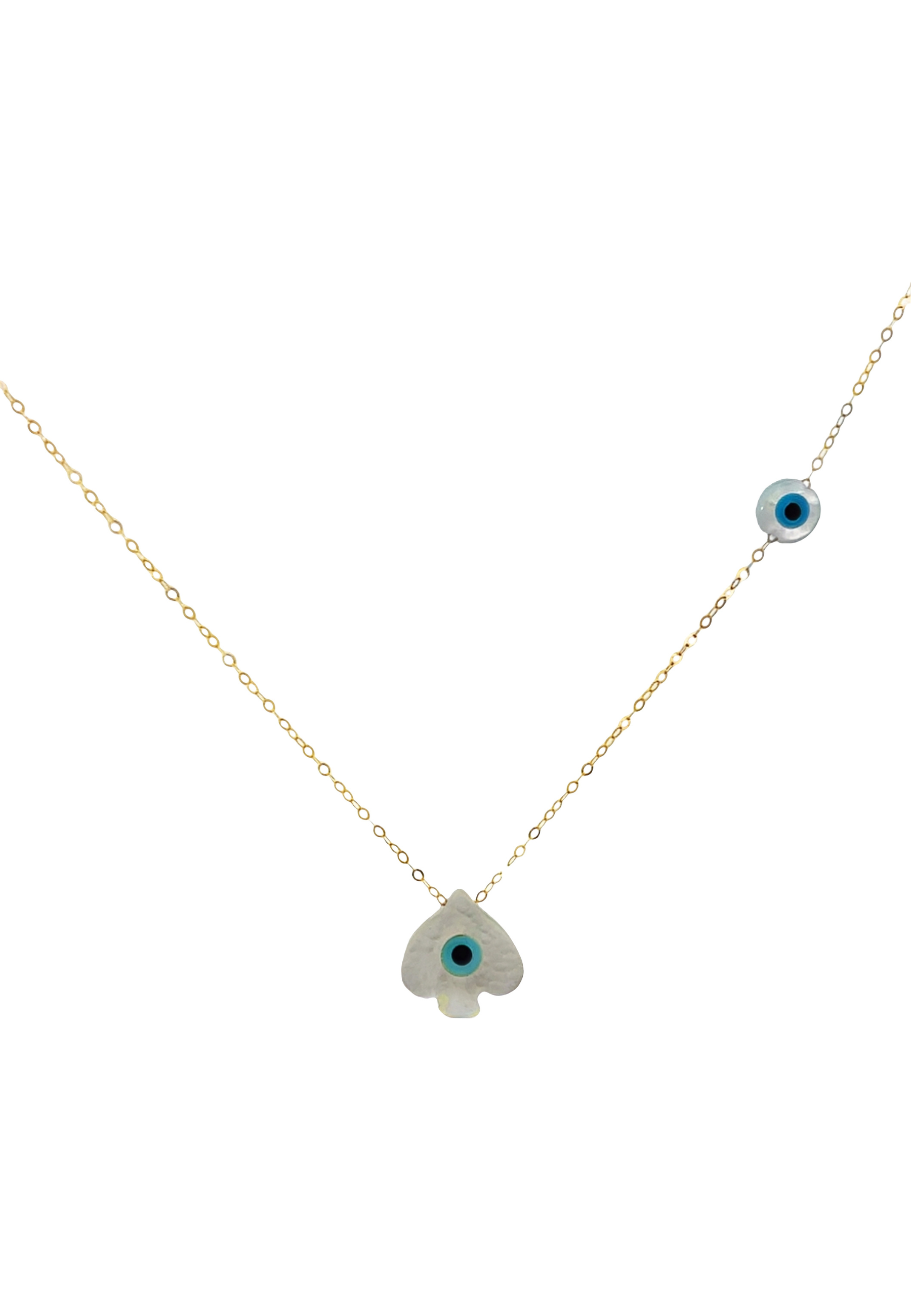This 18KT gold necklace features a white resin spade and pear eye design, symbolizing intuition and good fortune. A modern and elegant piece that adds a touch of meaning and sophistication to any look.