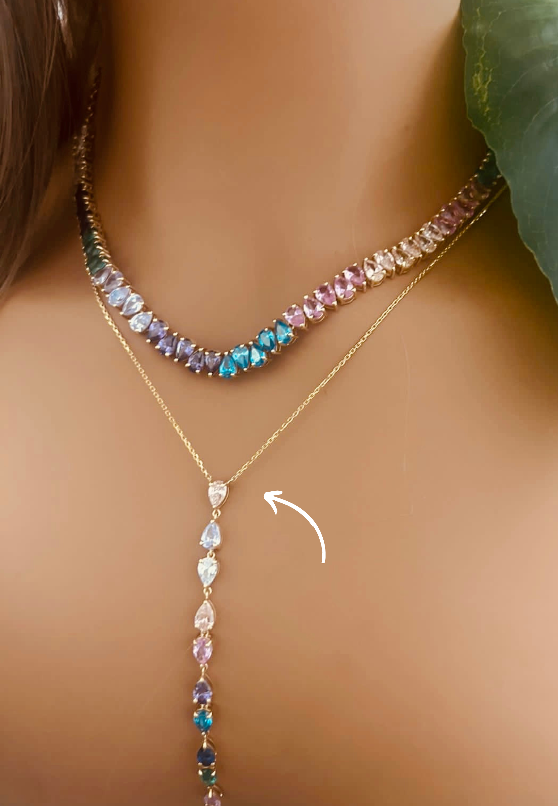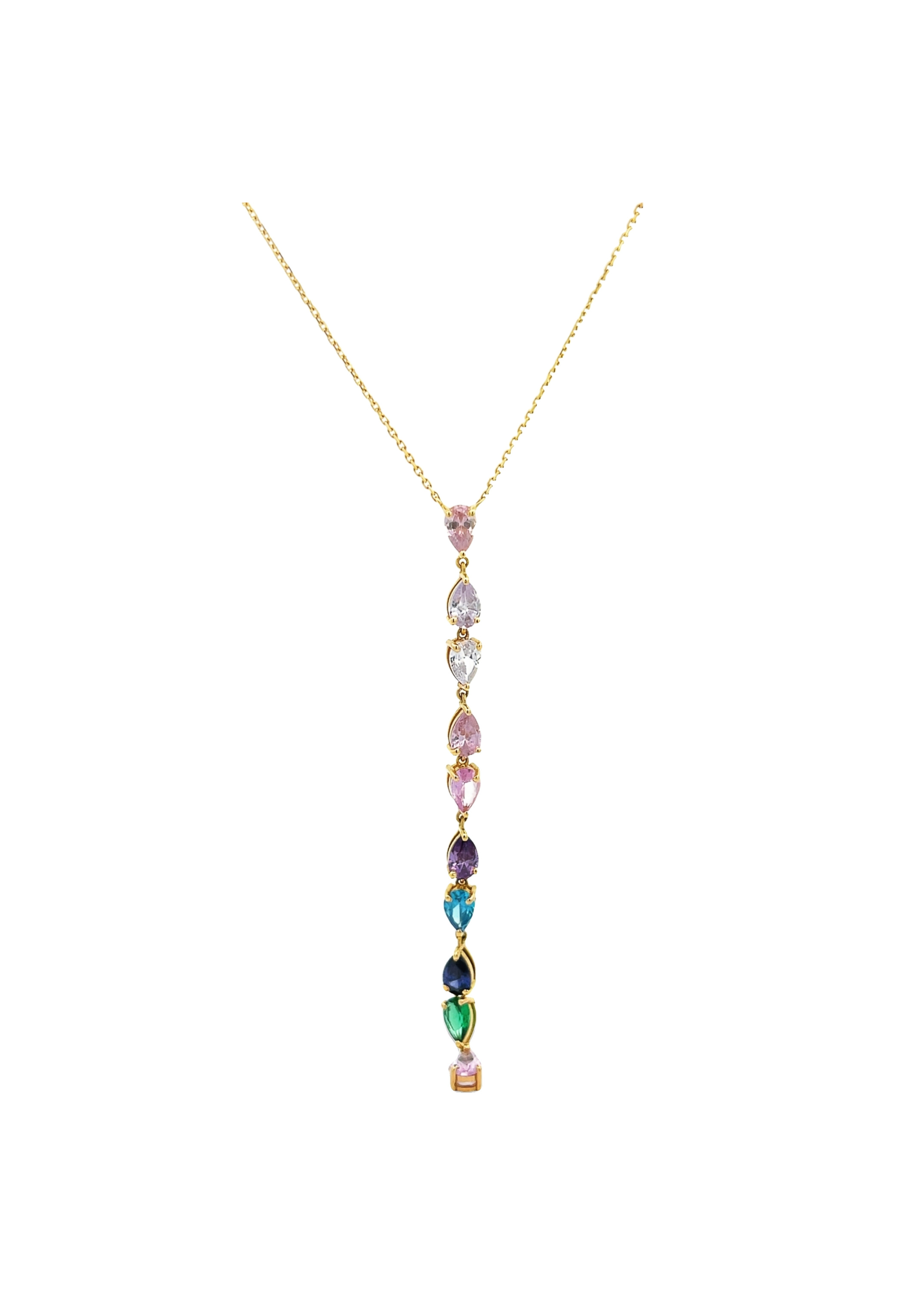Add a splash of color to your jewelry collection with our stunning 18KT Gold Necklace adorned with a vibrant line of colored gemstones. This elegant piece showcases a striking array of gemstones, each thoughtfully arranged to create a dazzling effect.