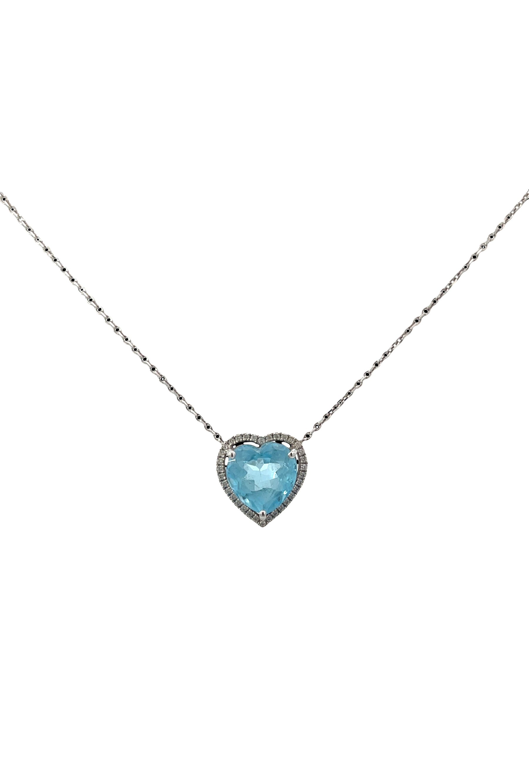 This 18KT white gold necklace showcases a radiant heart-shaped blue topaz pendant, symbolizing elegance and love. A timeless piece that adds a touch of color and sophistication to any look.