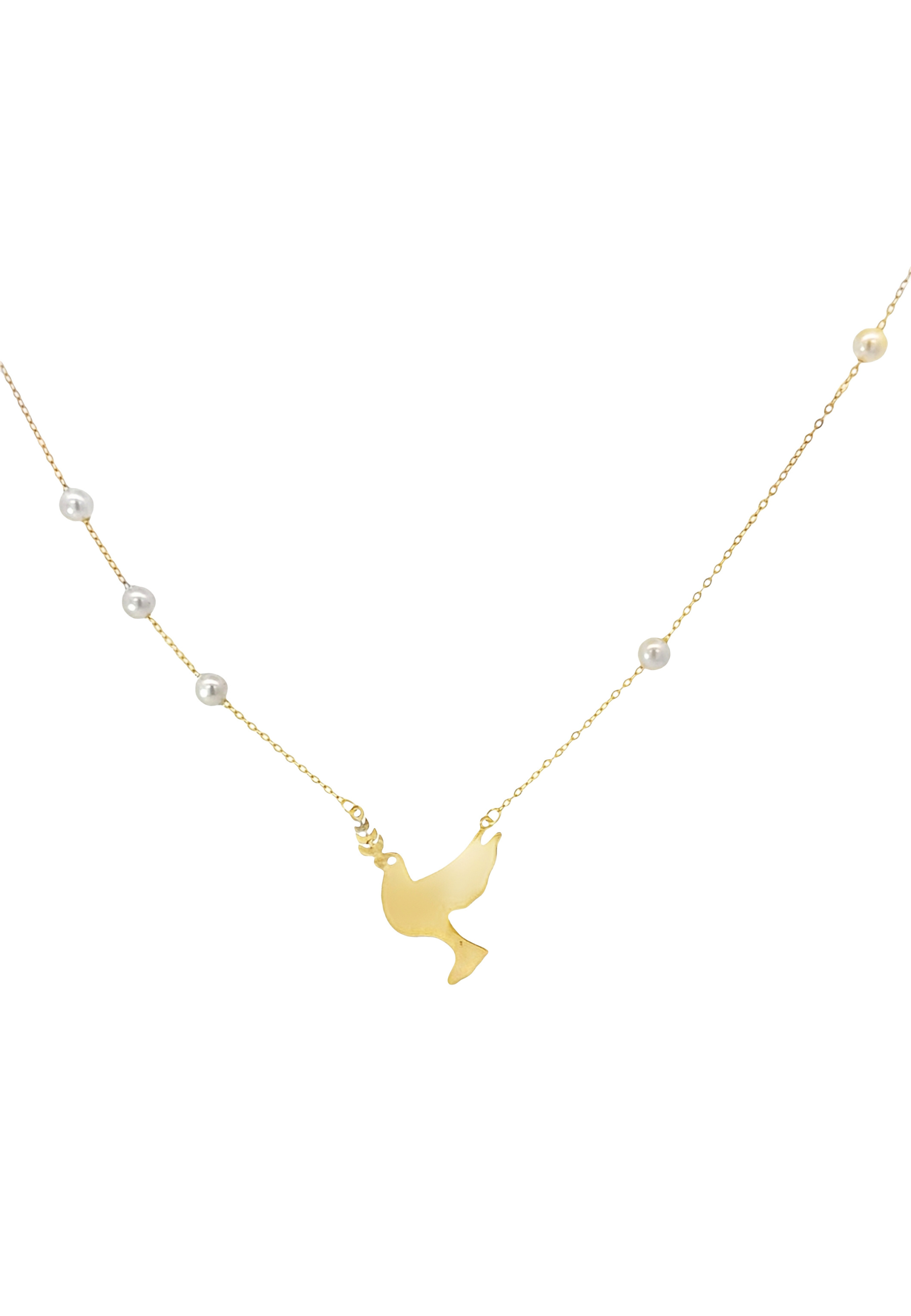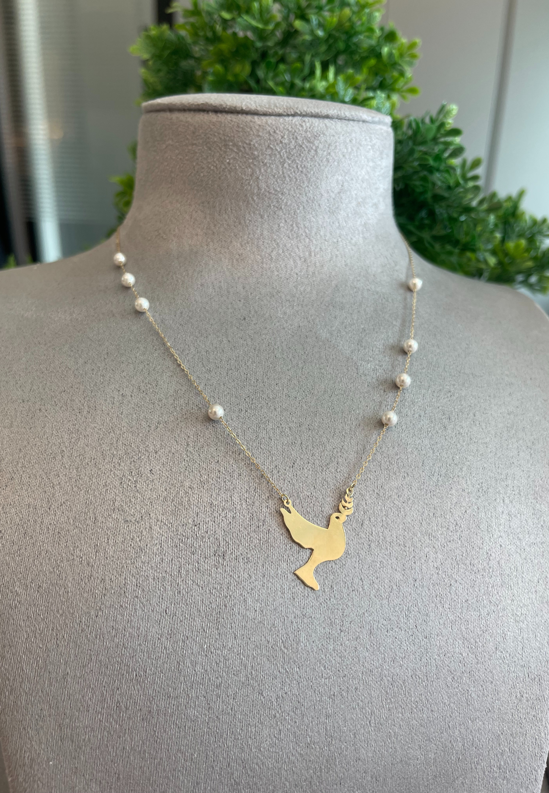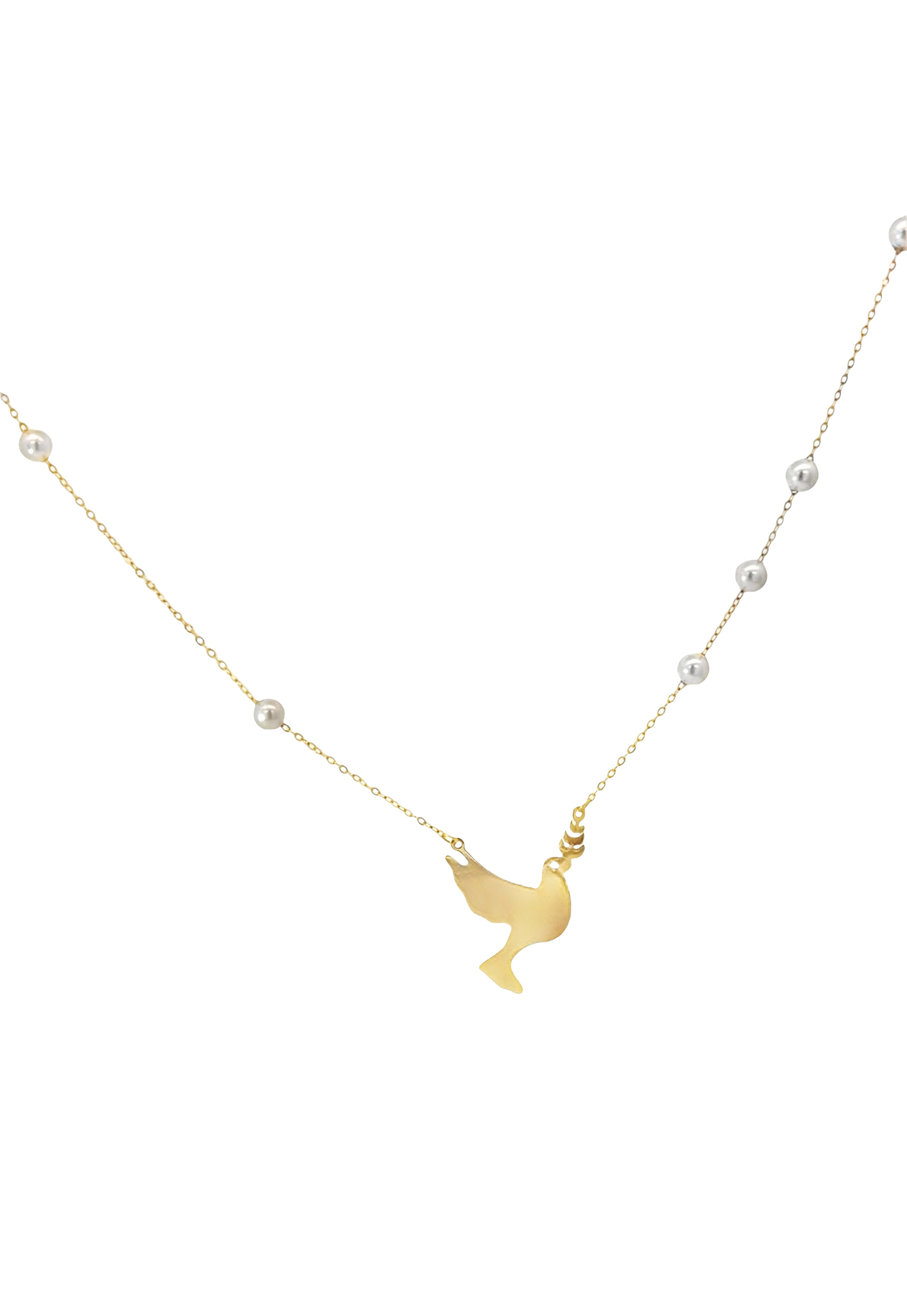 This 18KT Gold Bird Pearl Necklace combines elegance with natural beauty, featuring a delicate bird pendant and a lustrous pearl. Crafted from luxurious 18KT gold, this exquisite piece adds a touch of sophistication and charm to any ensemble.