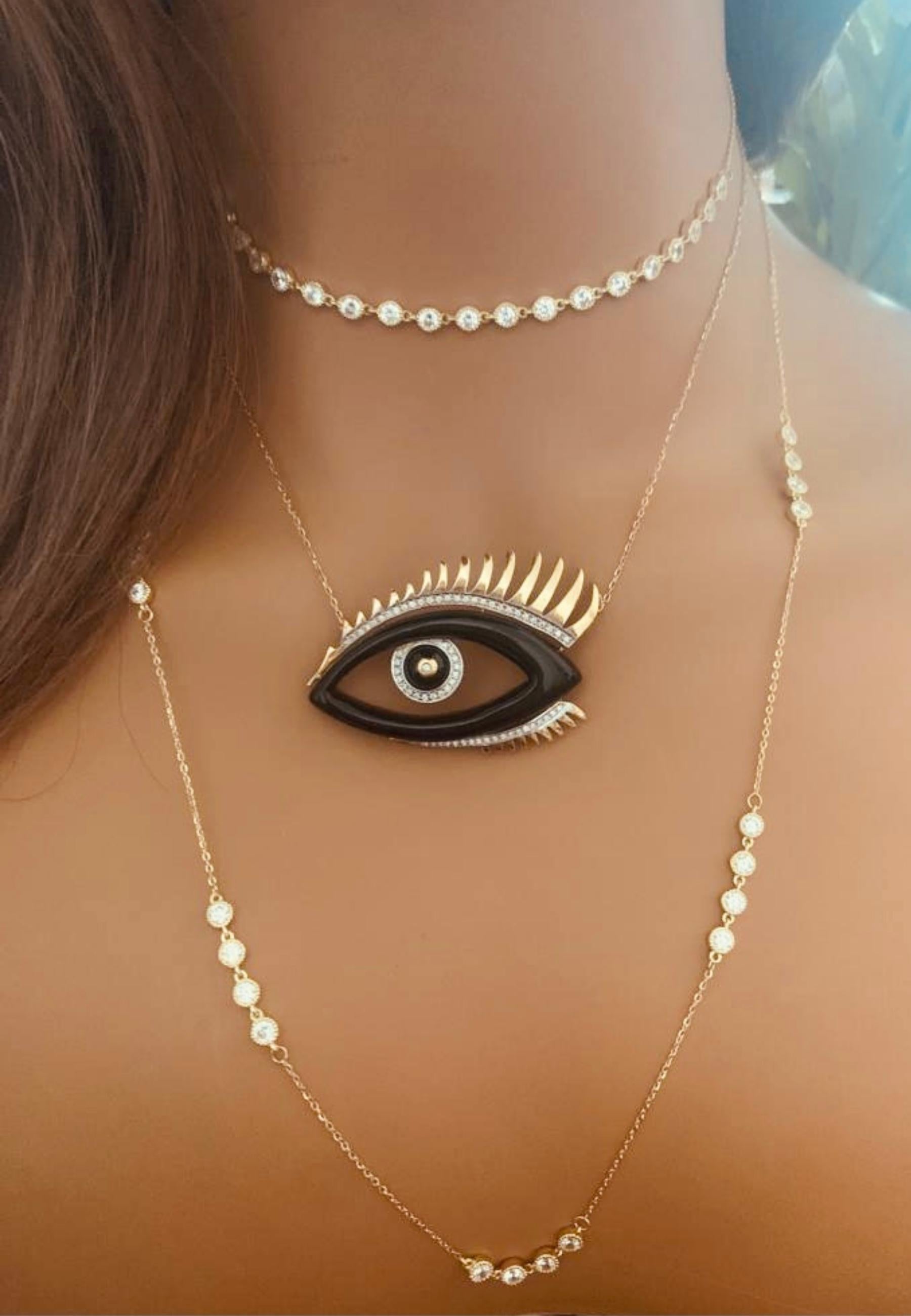 The 18KT Gold Black Eye Diamond Necklace is an elegant and sophisticated piece of jewelry that combines the luxurious allure of 18KT Gold with the striking contrast of a black eye design and sparkling diamonds. This necklace features a black eye motif at its center, surrounded or accented by brilliant zircons, making it both a stylish and meaningful accessory.
